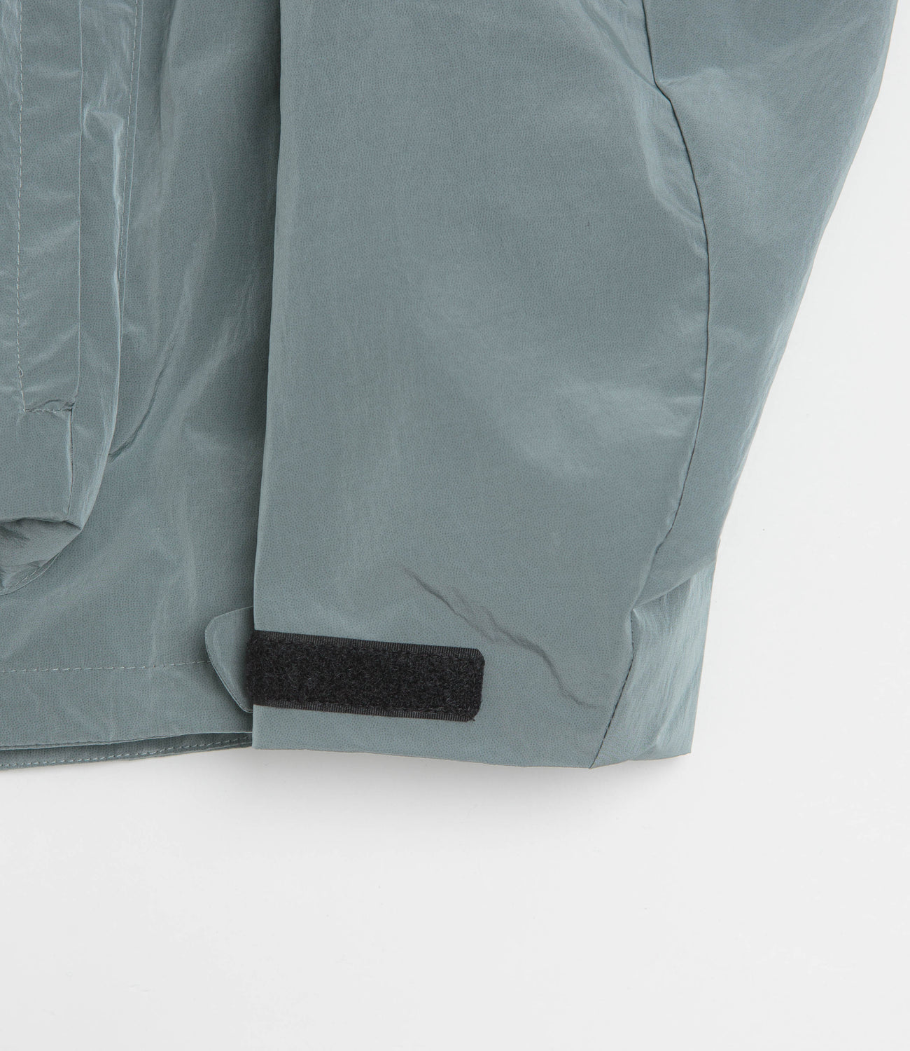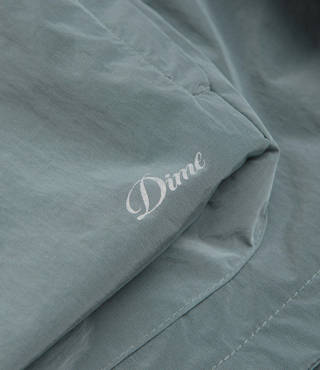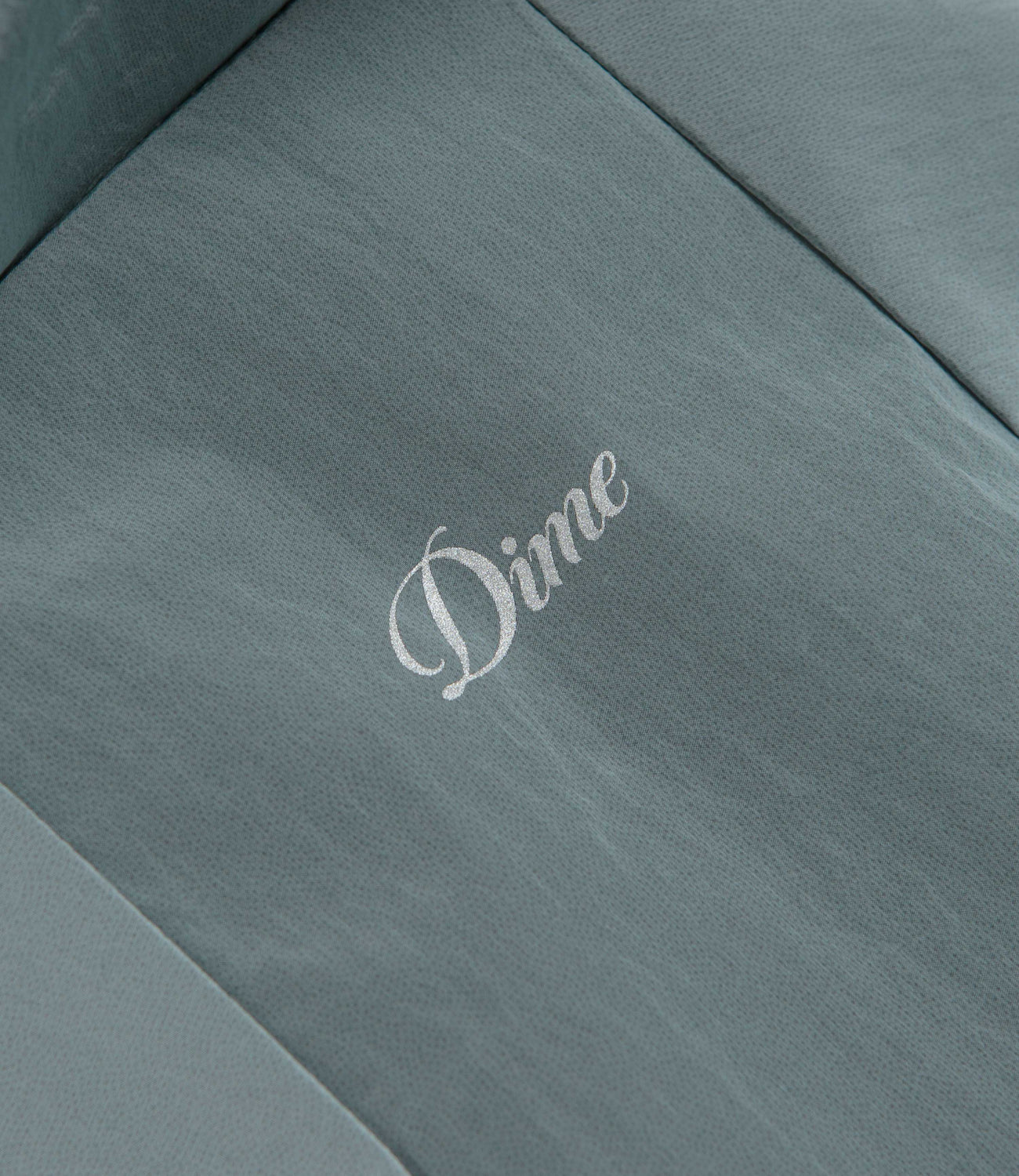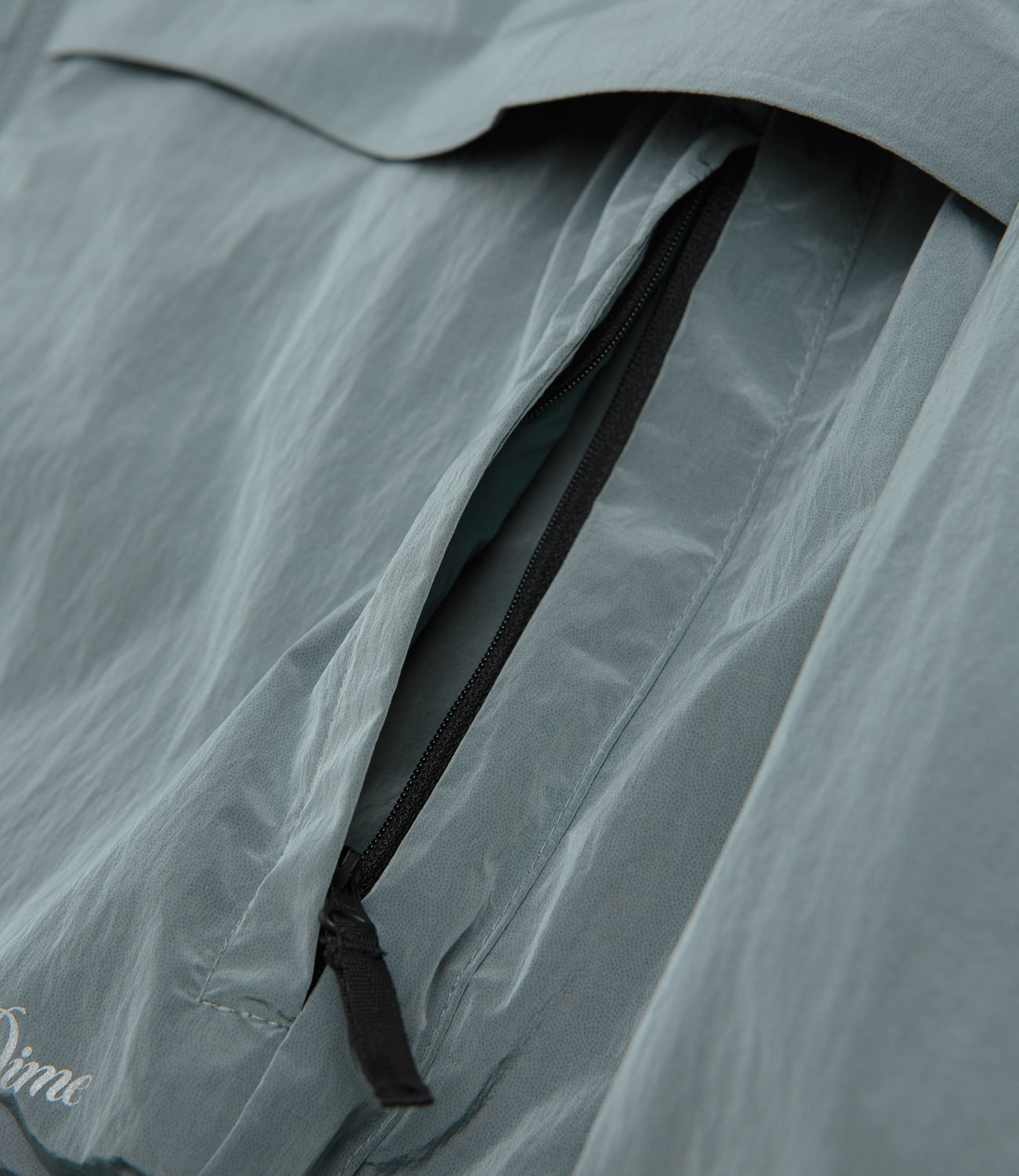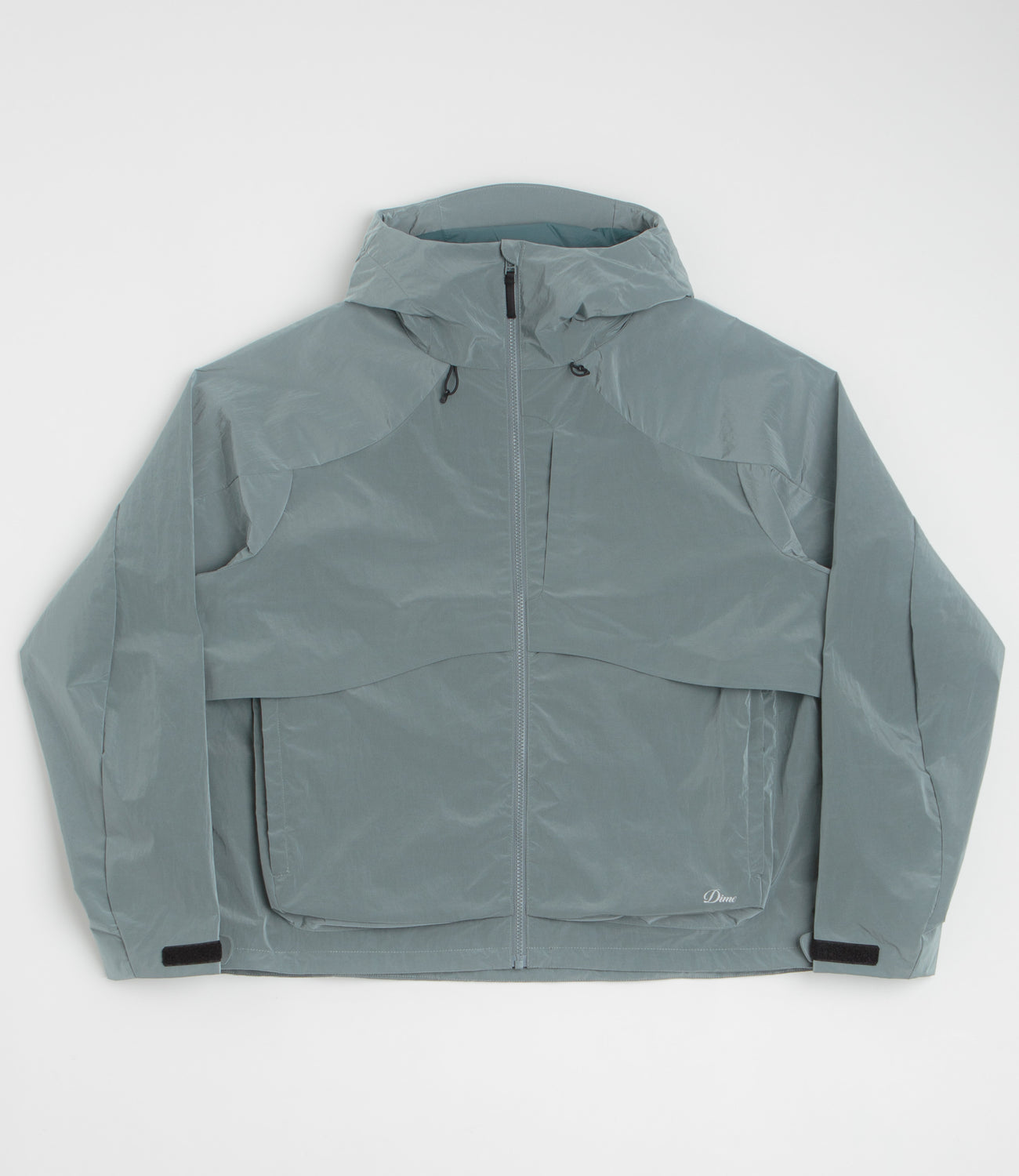Dime Taffeta Windbreaker Full Zip Jacket in Frost. Designed with a shiny nylon-taffeta shell, this Dime windbreaker features a lined inner and an adjustable toggle-cord hood. Finished in grey blue with raglan sleeves, a full length zippered fastening, oversized front pockets and reflective logo branding.