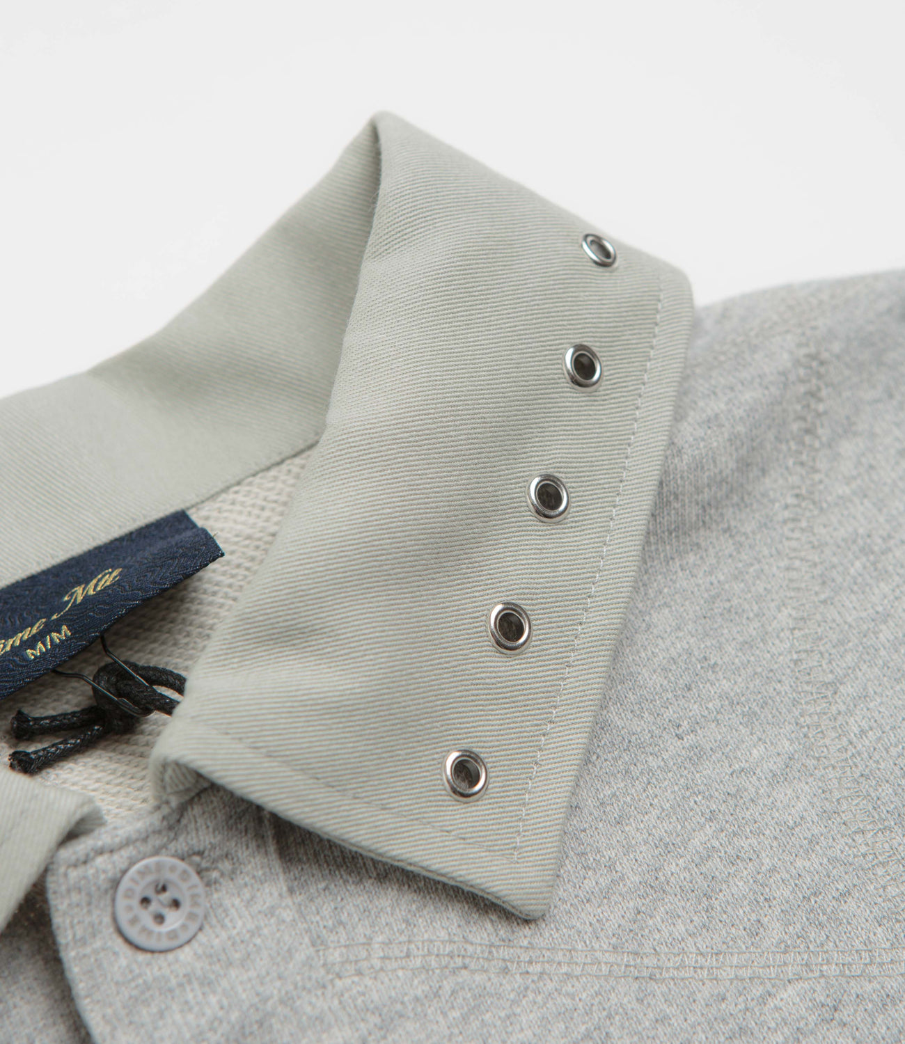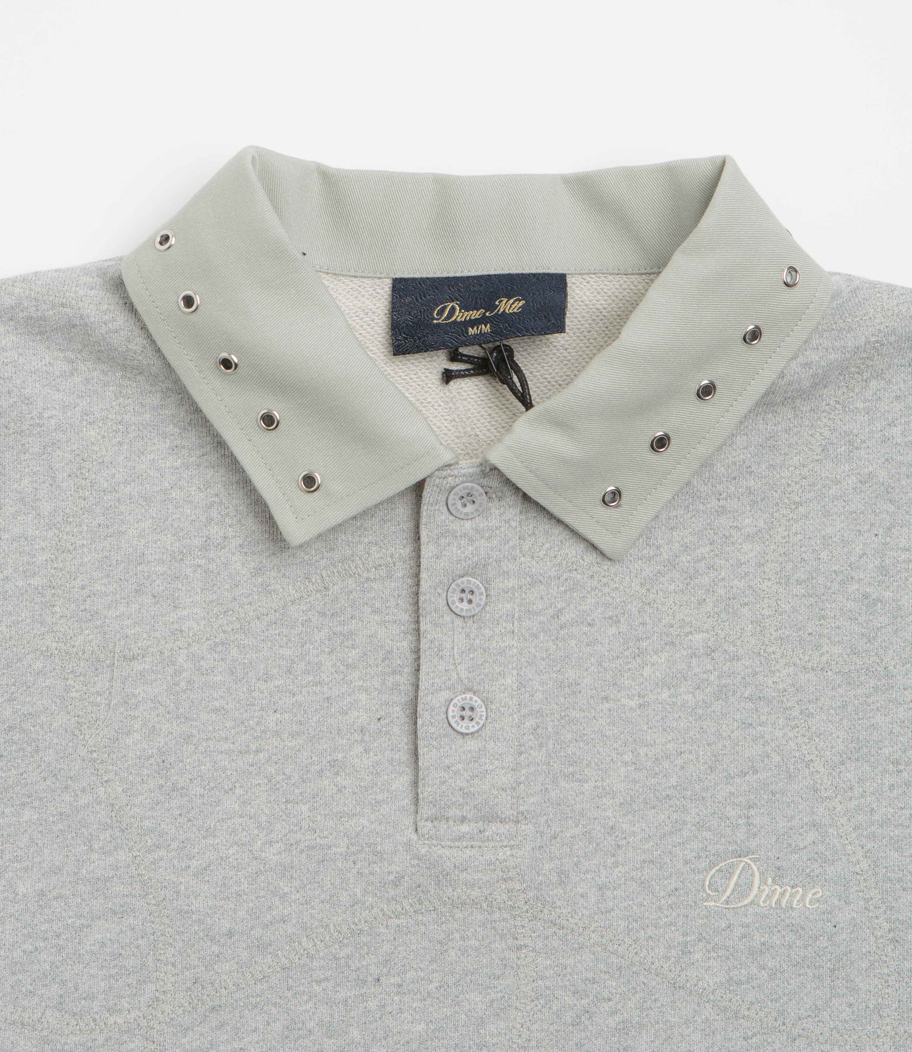 Dime Wave Rugby Shirt in Heather Grey. Designed with an all-over wavy coverstitch, this regular fitting Dime rugby shirt is made from 100% cotton. Featuring a metal-eyelet collar and a triple button placket, this grey Dime rugby shirt is finished with ribbed cuffs, a rib knit hem and embroidered branding.