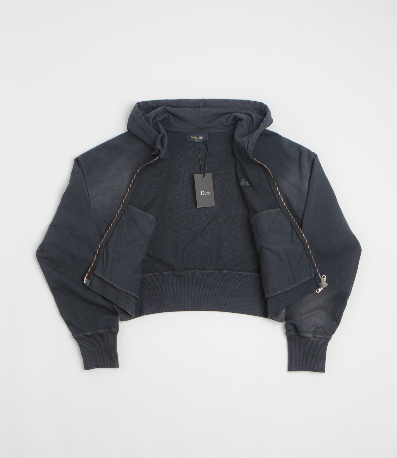 Dime Womens Cropped Full Zip Hoodie in Black Washed. Cropped in length, this regular fitting Dime hoodie is made from 100% cotton with a garment dyed and spray-washed construction. Featuring an adjustable drawstring hood, a two-way zipper fastening and dart waist pockets, this black Dime womens hoodie is finished with ribbed cuffs and embroidered branding.