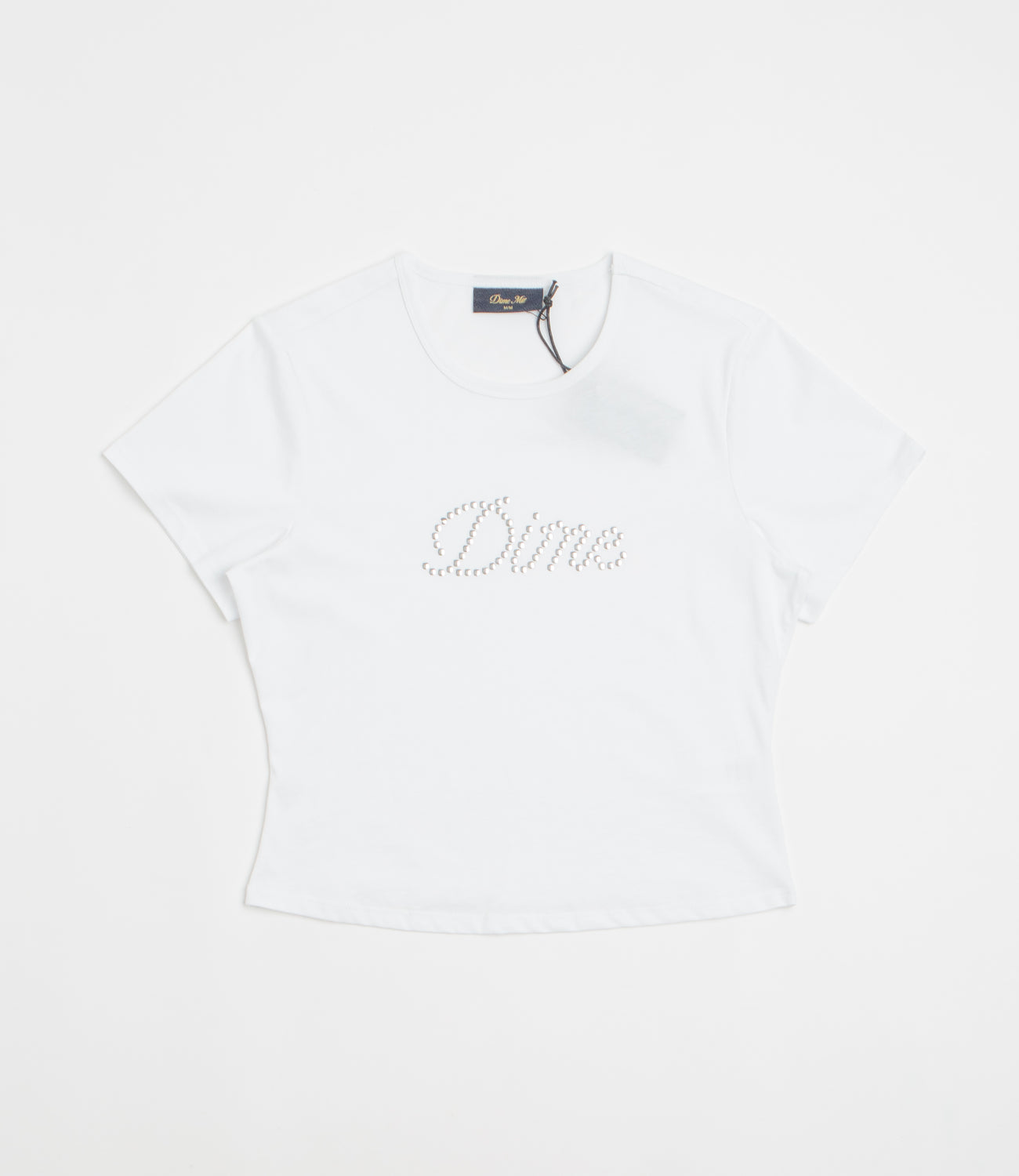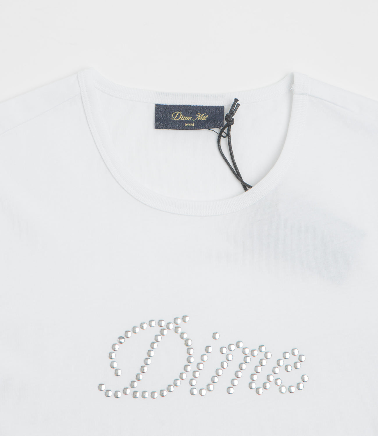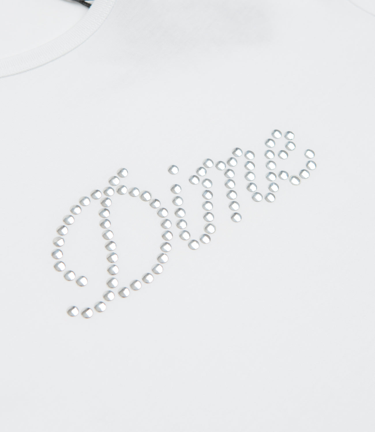 Dime Womens Icy T-Shirt in White. Made from 100% cotton, this Dime t-shirt is cropped in length with a classic crew collar and a straight hem. Finished in white with a studded centre chest logo.