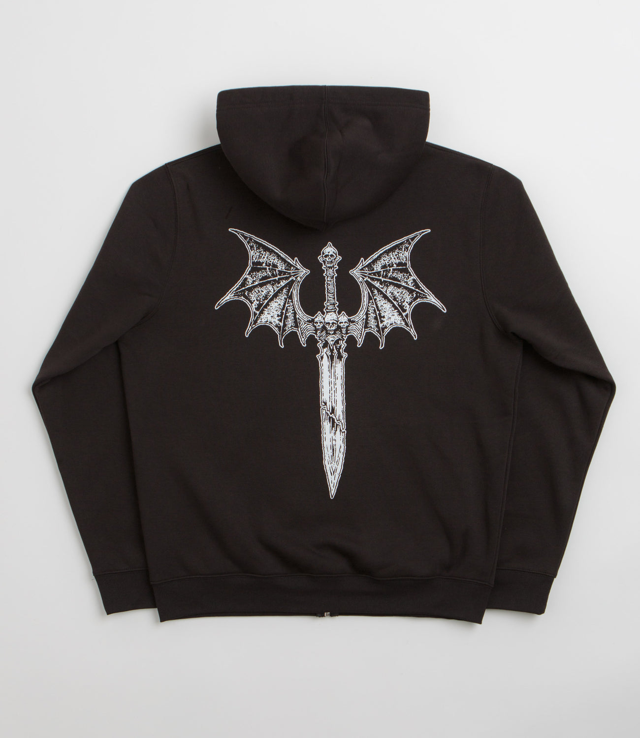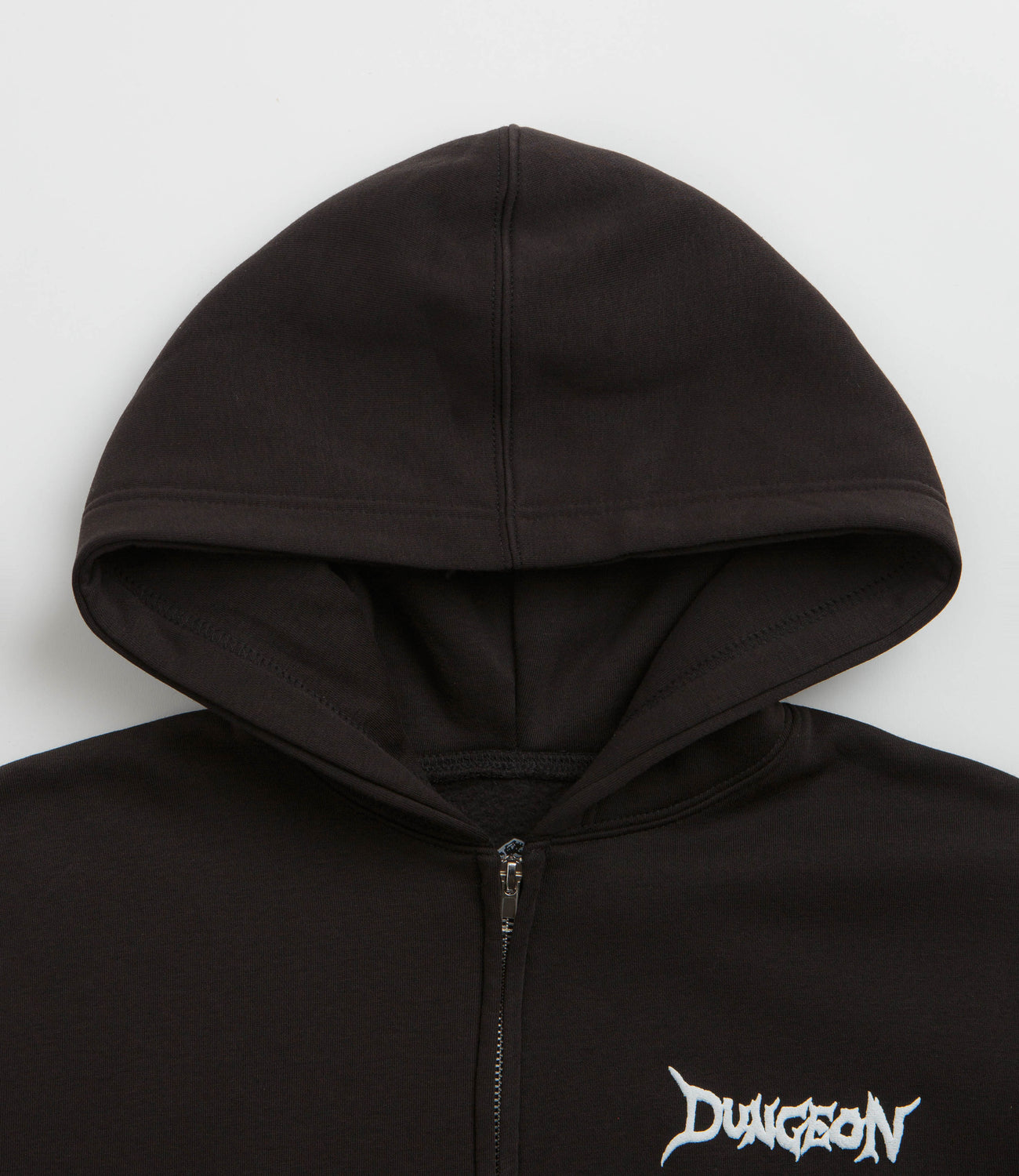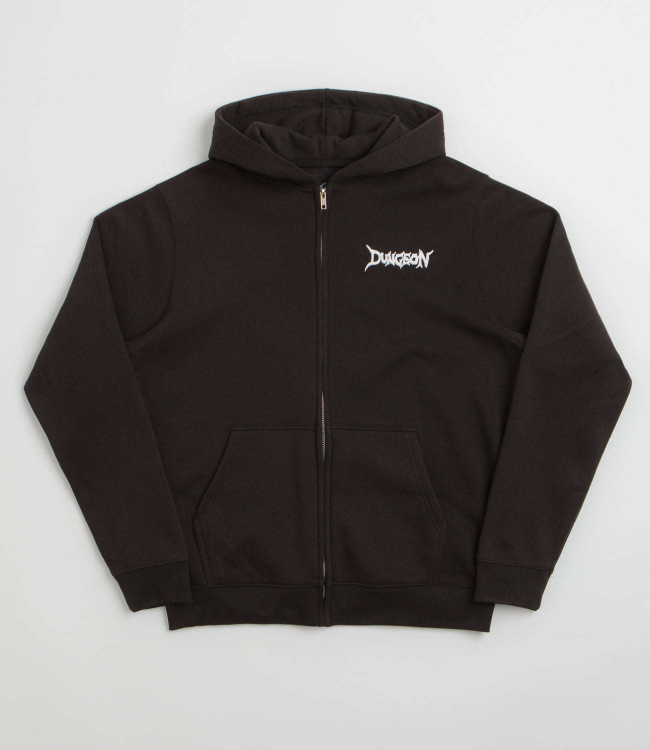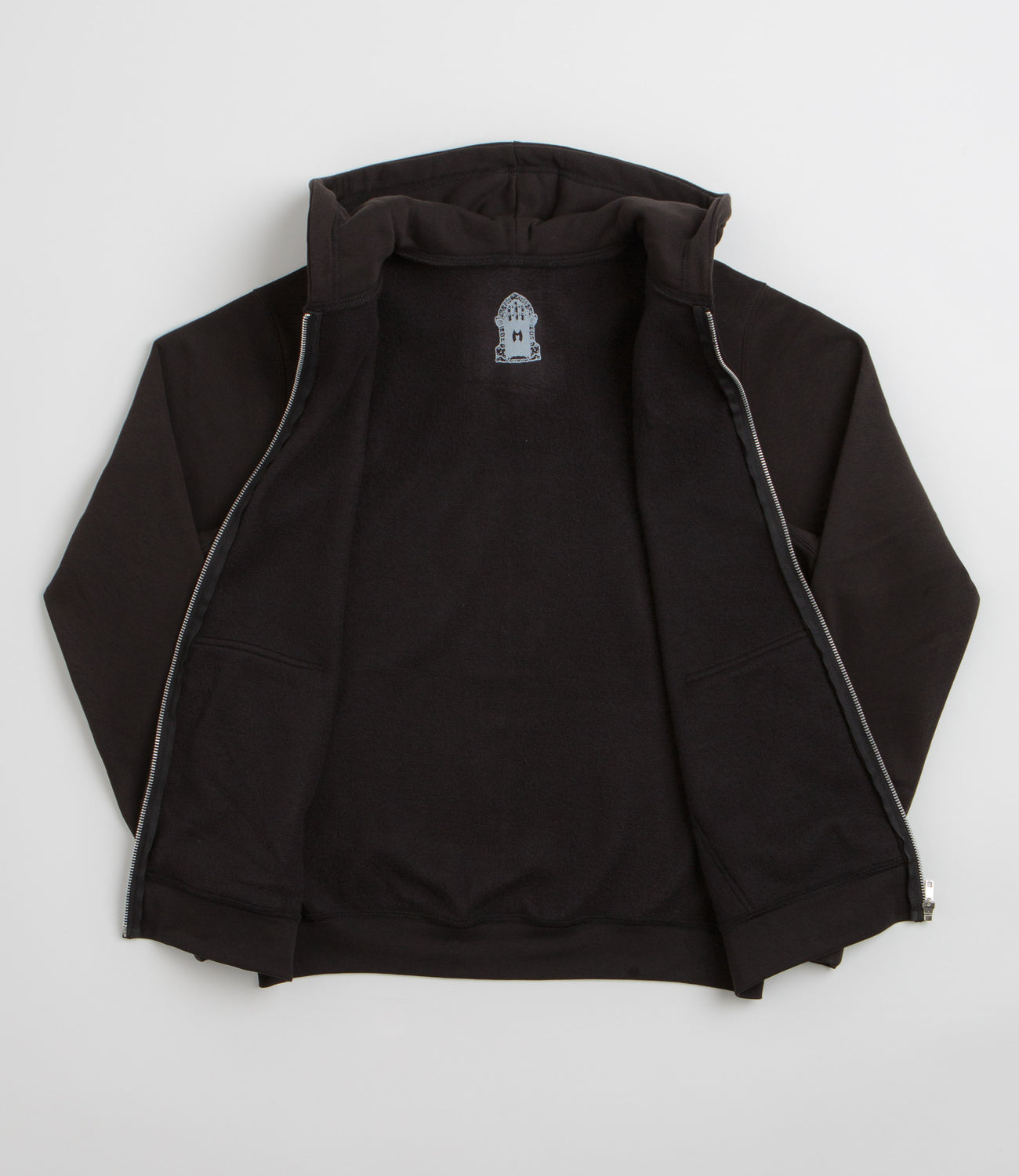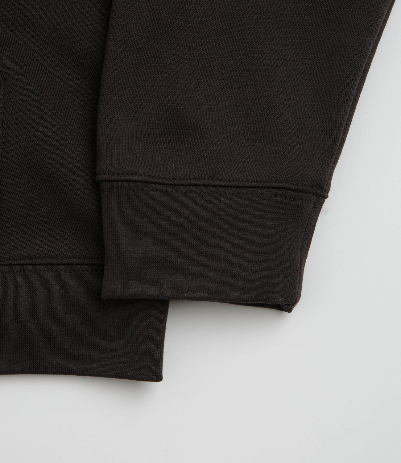 Cut from cotton with a brushed fleece inner, this black hoodie is built for everyday layering with a regular fit that sits easy over tees or under outerwear. The full-length zip lets you wear it open or closed, while the split panel hood adds a structured finish up top. Two front pockets keep things practical, and ribbed cuffs and hem help hold shape and warmth. Finished with a puff print logo at the front and a printed graphic at the back, it balances clean wearability with subtle statement detail.