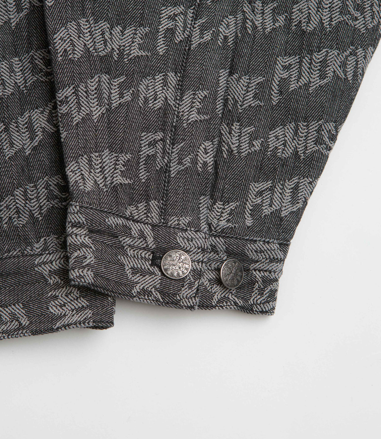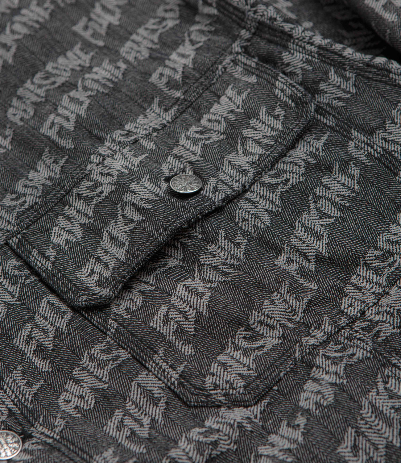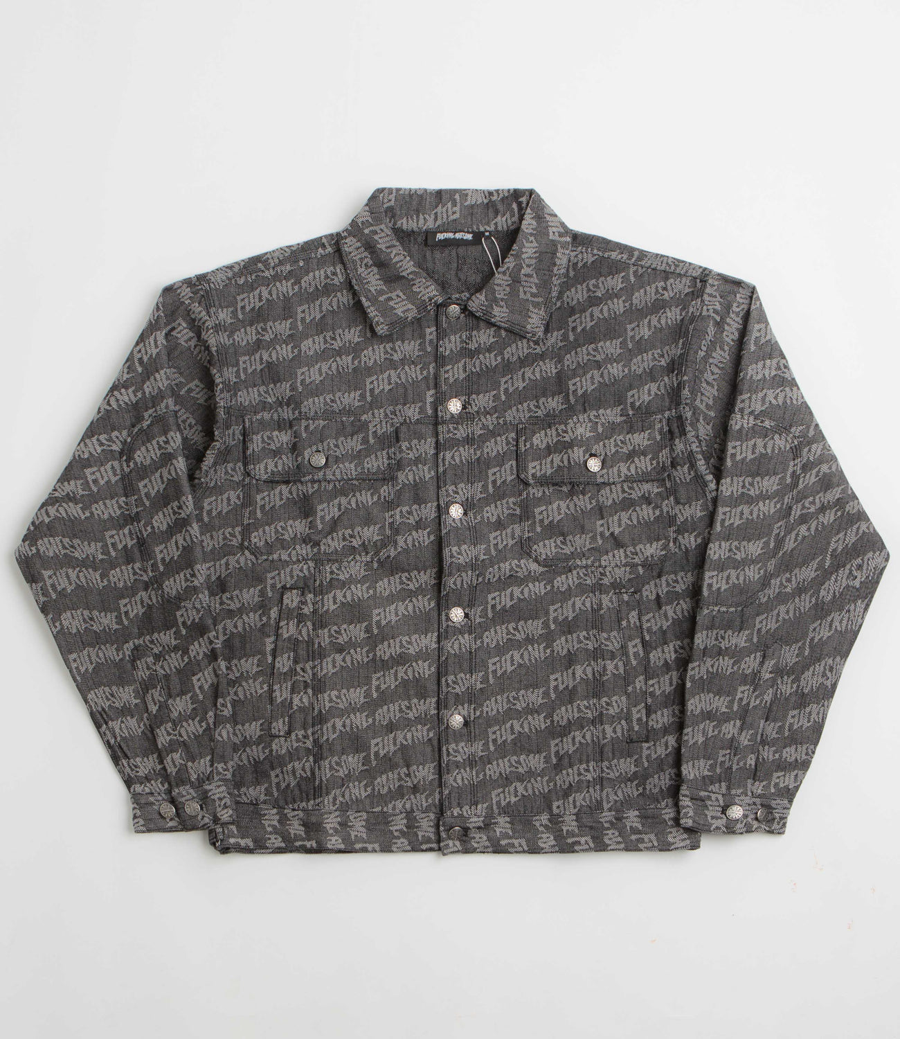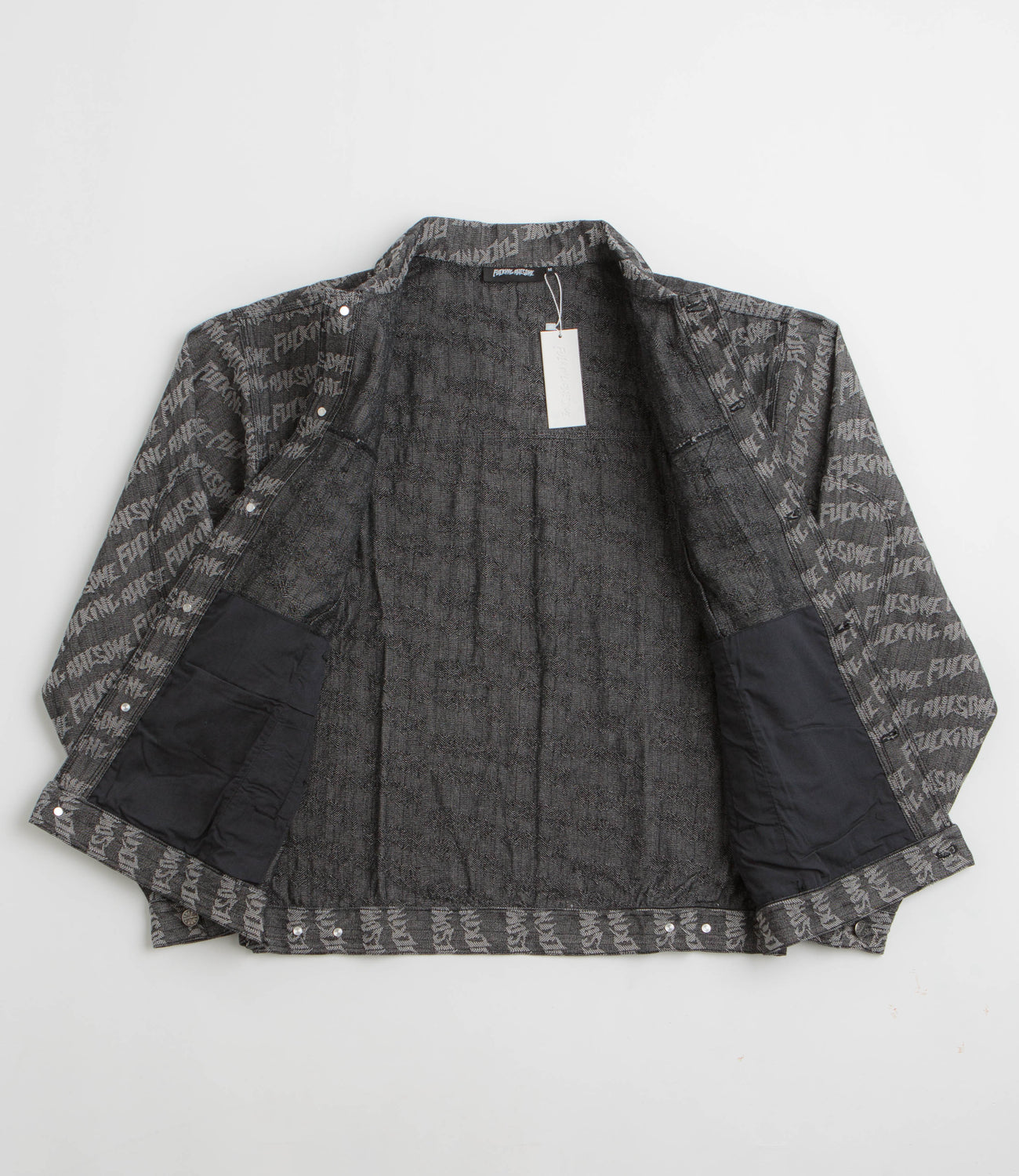 Fucking Awesome Herringbone Work Jacket in Black and Light Grey. Designed with a all-over print design, this herringbone Fucking Awesome jacket is made from a cotton-wool blend. Featuring a stand collar, a full length button fastening and elbow patch sleeves, this black grey Fucking Awesome jacket is finished with two chest pockets, two front pockets and adjustable cuffs.