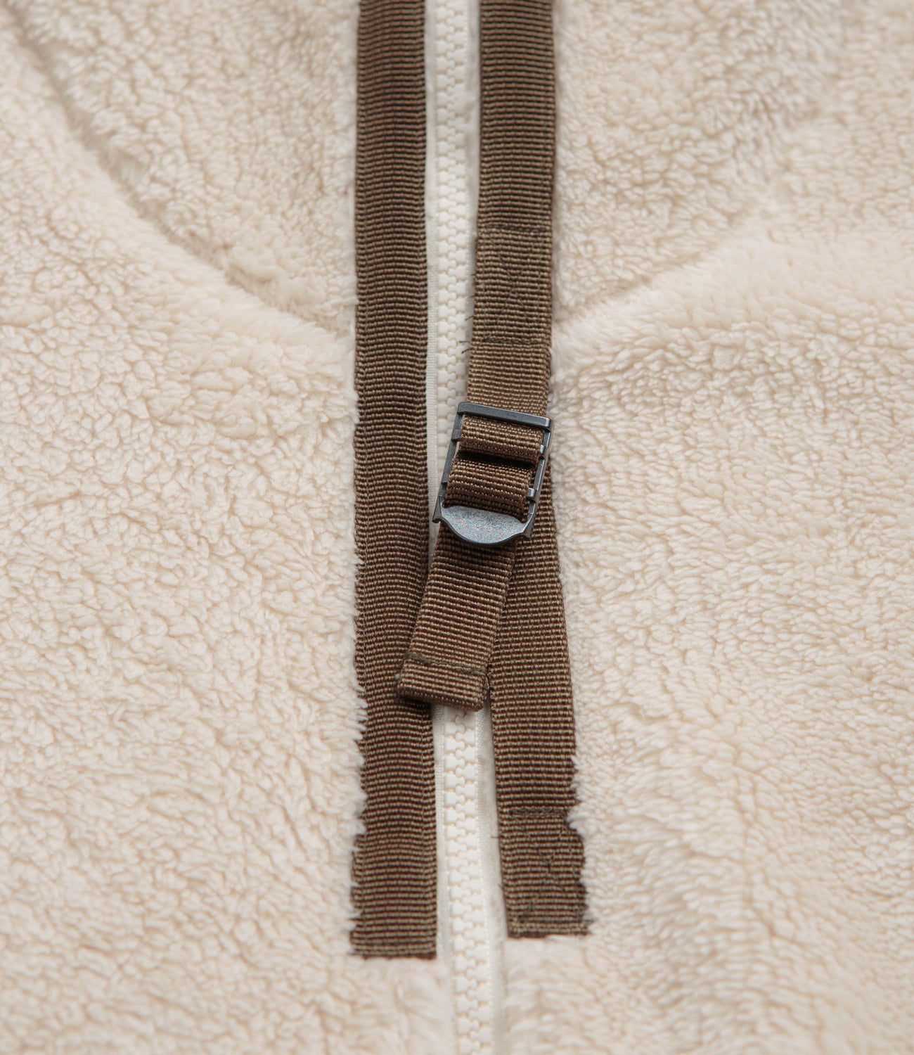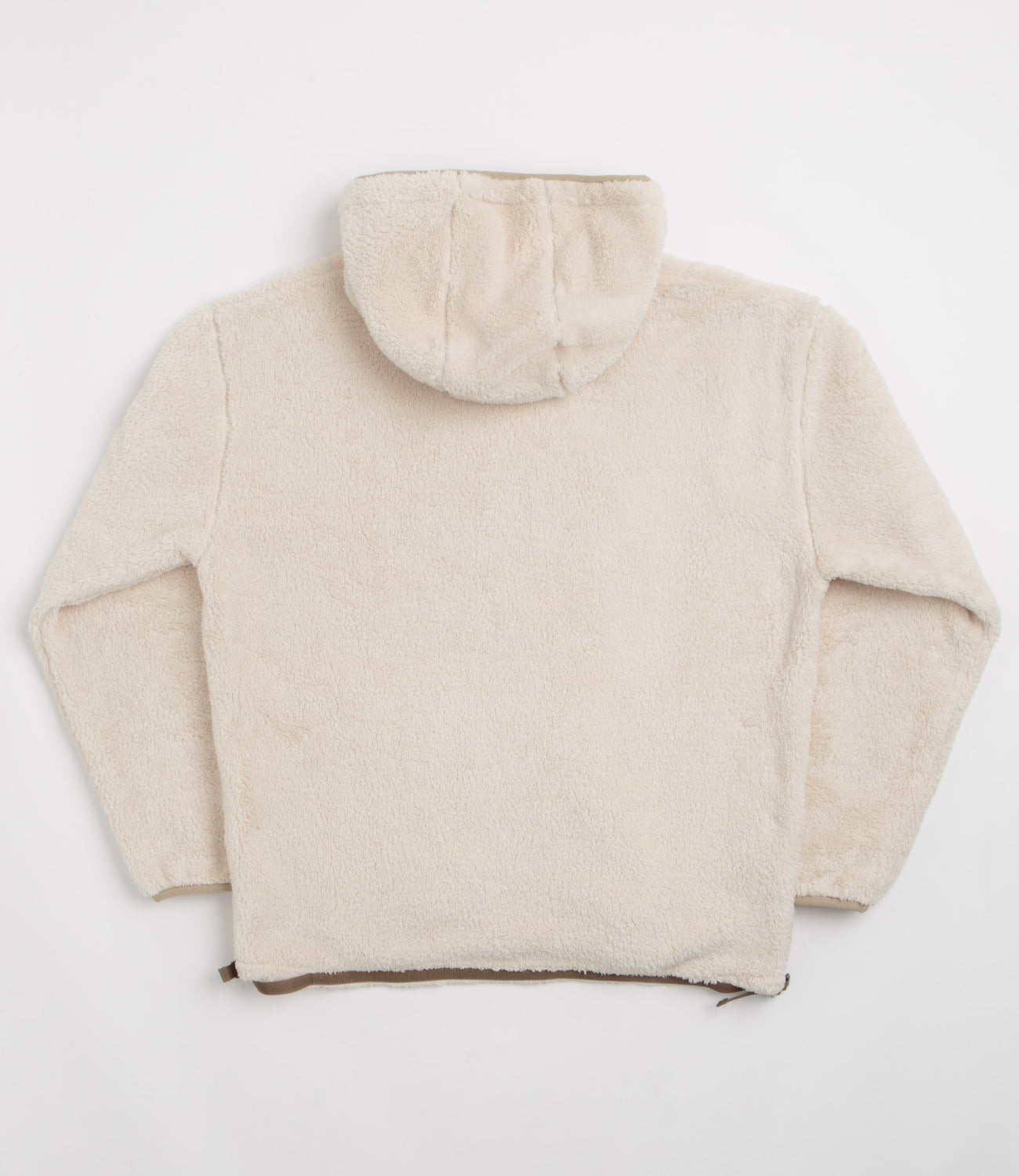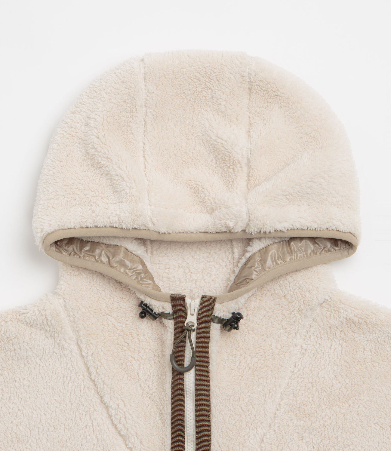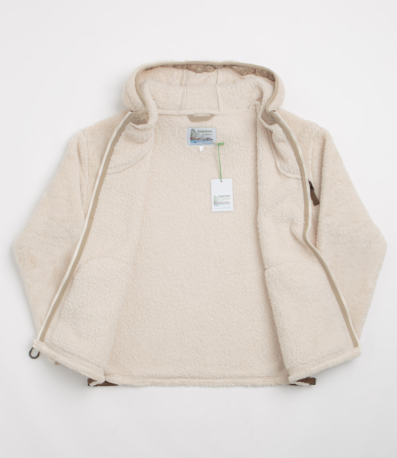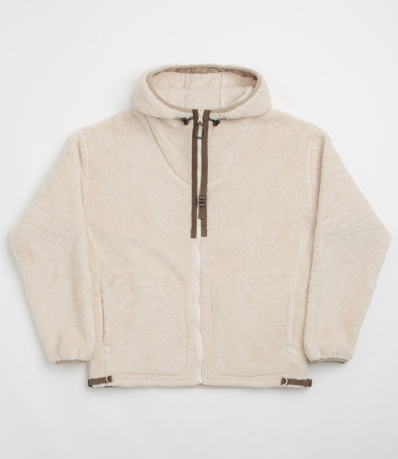 Garbstore Fleece Hoodie in Sand. A modern take on an outdoor silhouette, this double-faced Garbstore hoodie is crafted from 100% polyester fleece and is tailored to a boxy fitting. Featuring dropped shoulders, a full length YKK zipper fastening, a triple panel toggle cord hood and a webbed hem, this khaki Garbstore fleece also features nylon ripstop panels across each sleeve. Finished with two side pockets, woven D-ring detail and nylon webbing trims across the front for quick and easy additional storage.