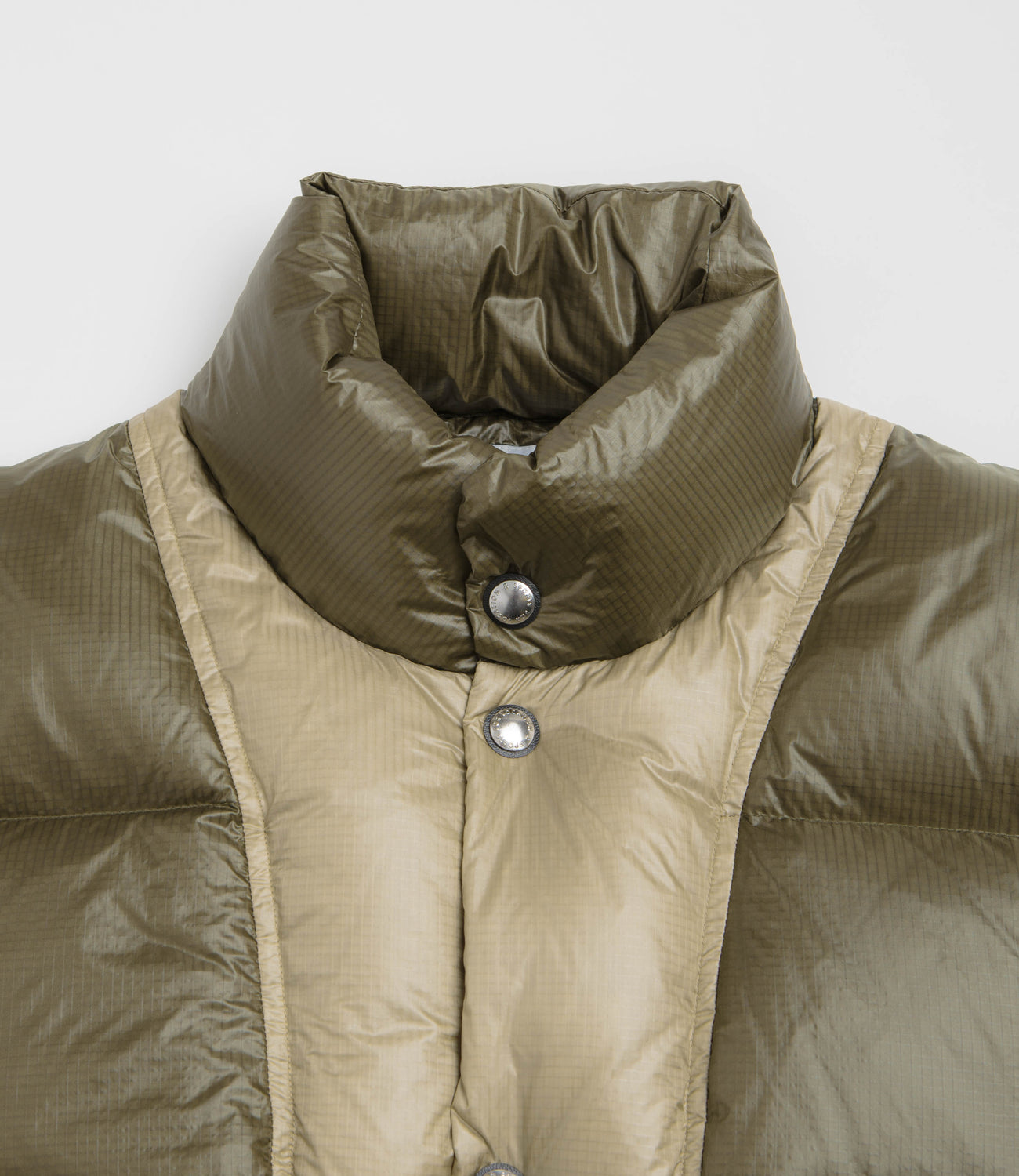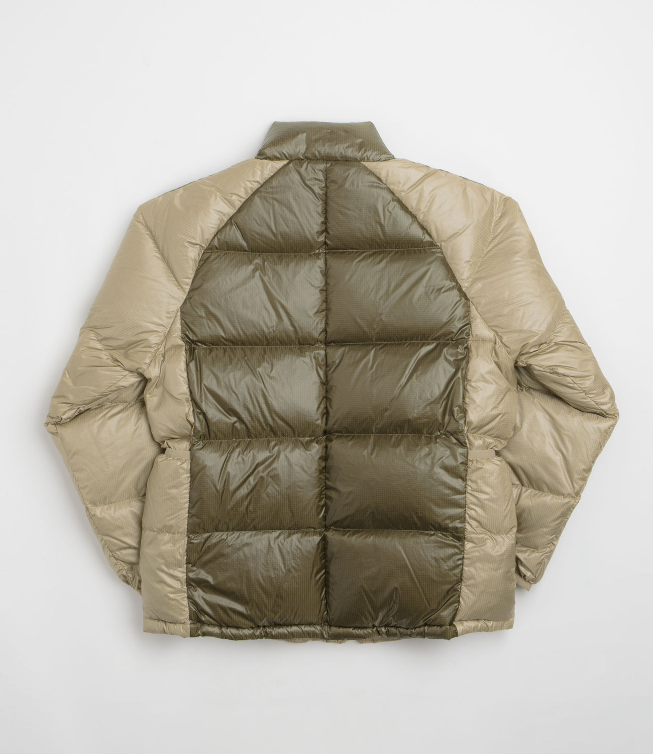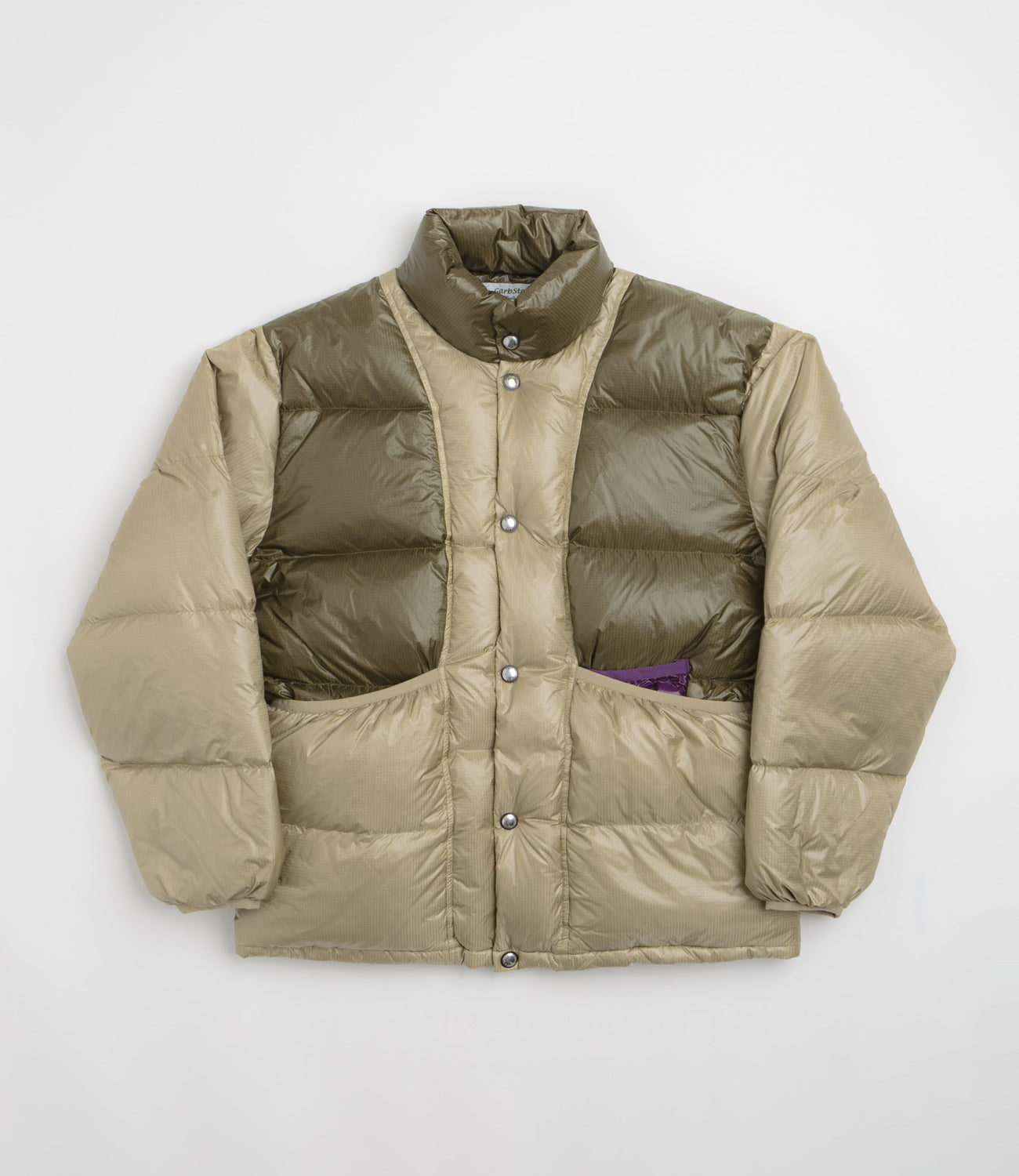 Garbstore Goose Down Liner in Brown. Water-resistant and crafted from 100% nylon micro ripstop, this down-filled Garbstore liner is tailored to a relaxed fitting with a down weight of 300g/m2. Lightweight and styled with contrasting colour panels, this goose down Garbstore liner features a full length press stud fastening, elasticated cuffs and a high funnel neck collar. Finished with two large front pockets and an additional water bottle pocket.