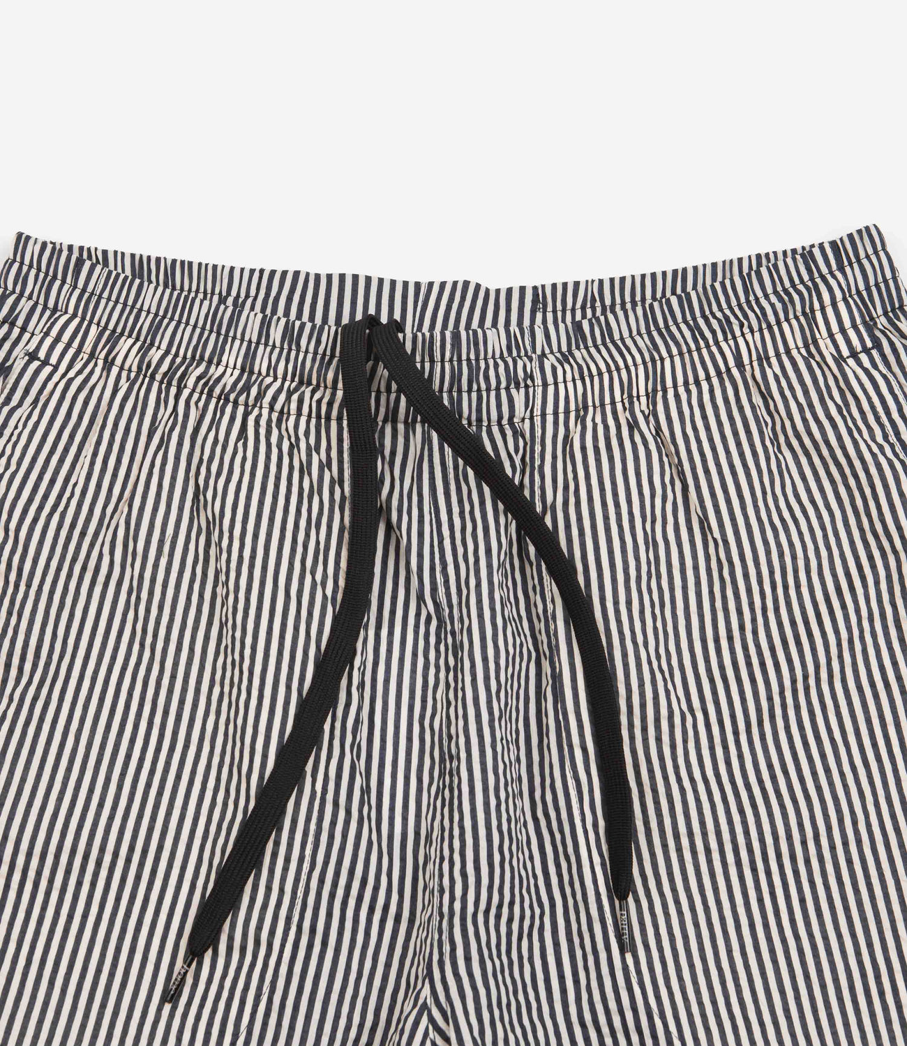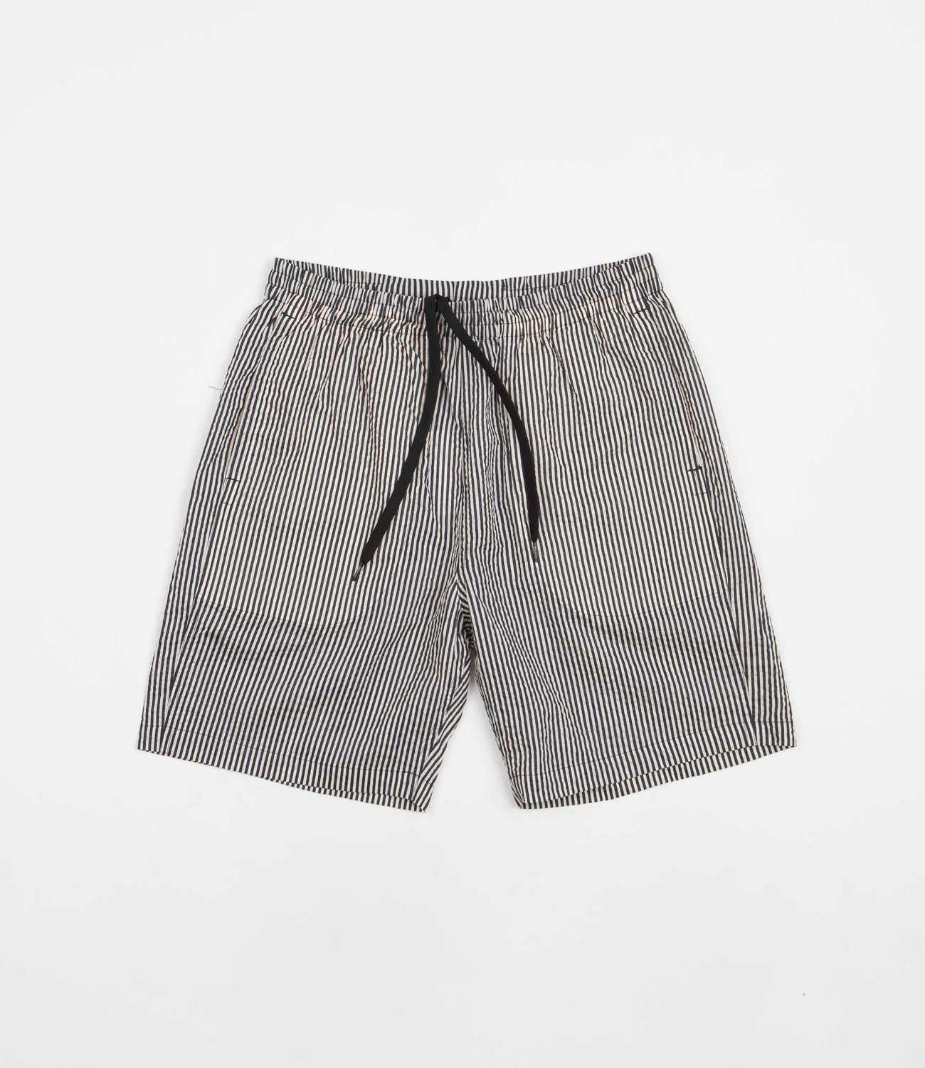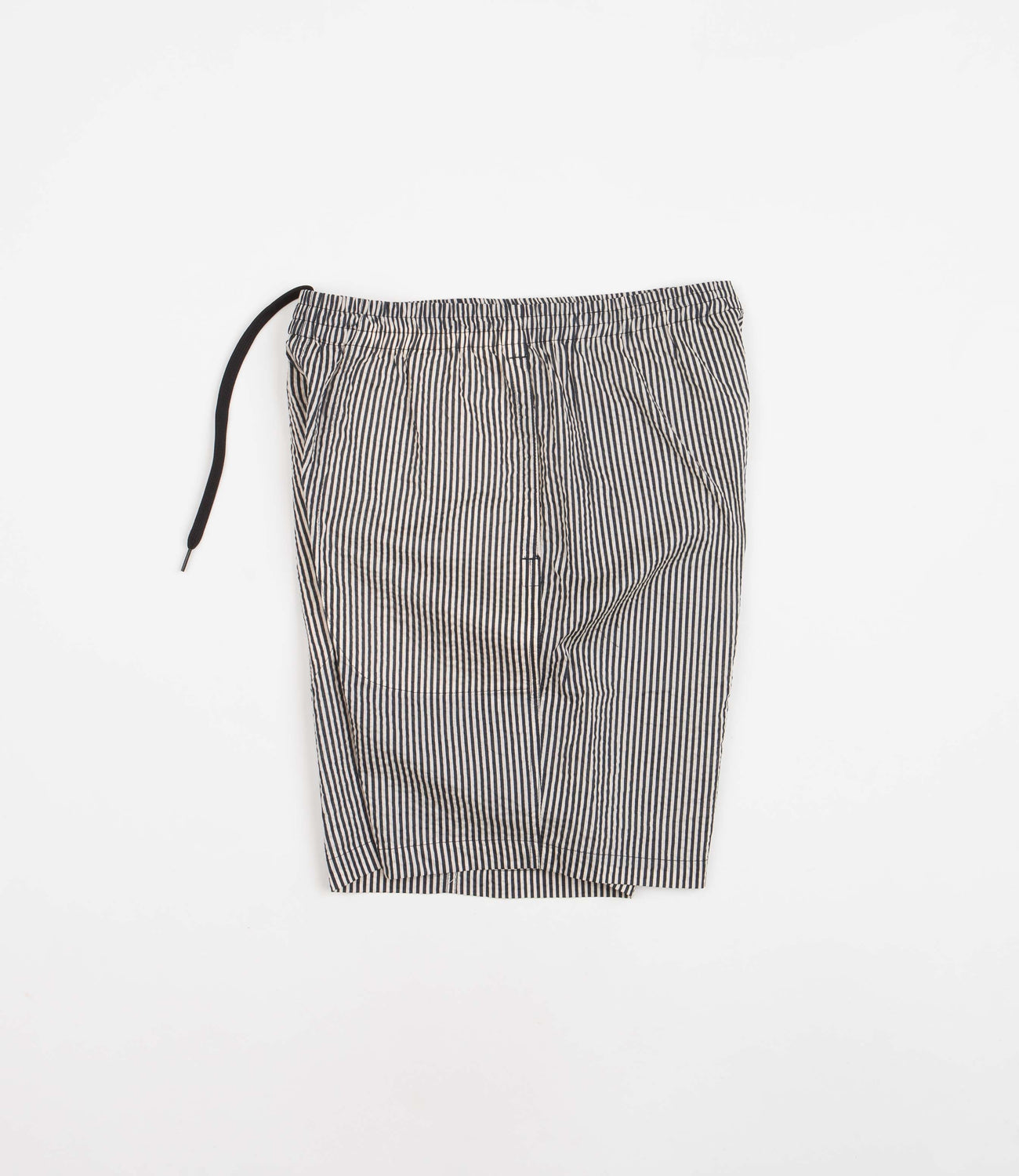 Garbstore Home Party Shorts in Stripe. Crafted from 100% Japanese cotton ‘Miracle Wave’ fabric with an above-knee cut, these loose fitting Garbstore shirts arrive as part of the brand’s latest collection. Vintage inspired with an 8” inside leg, a drawcord elasticated waist and a textured fabrication, these striped Garbstore shorts are finished with two side pockets, a rear pocket and with a concealed inner stash pocket.