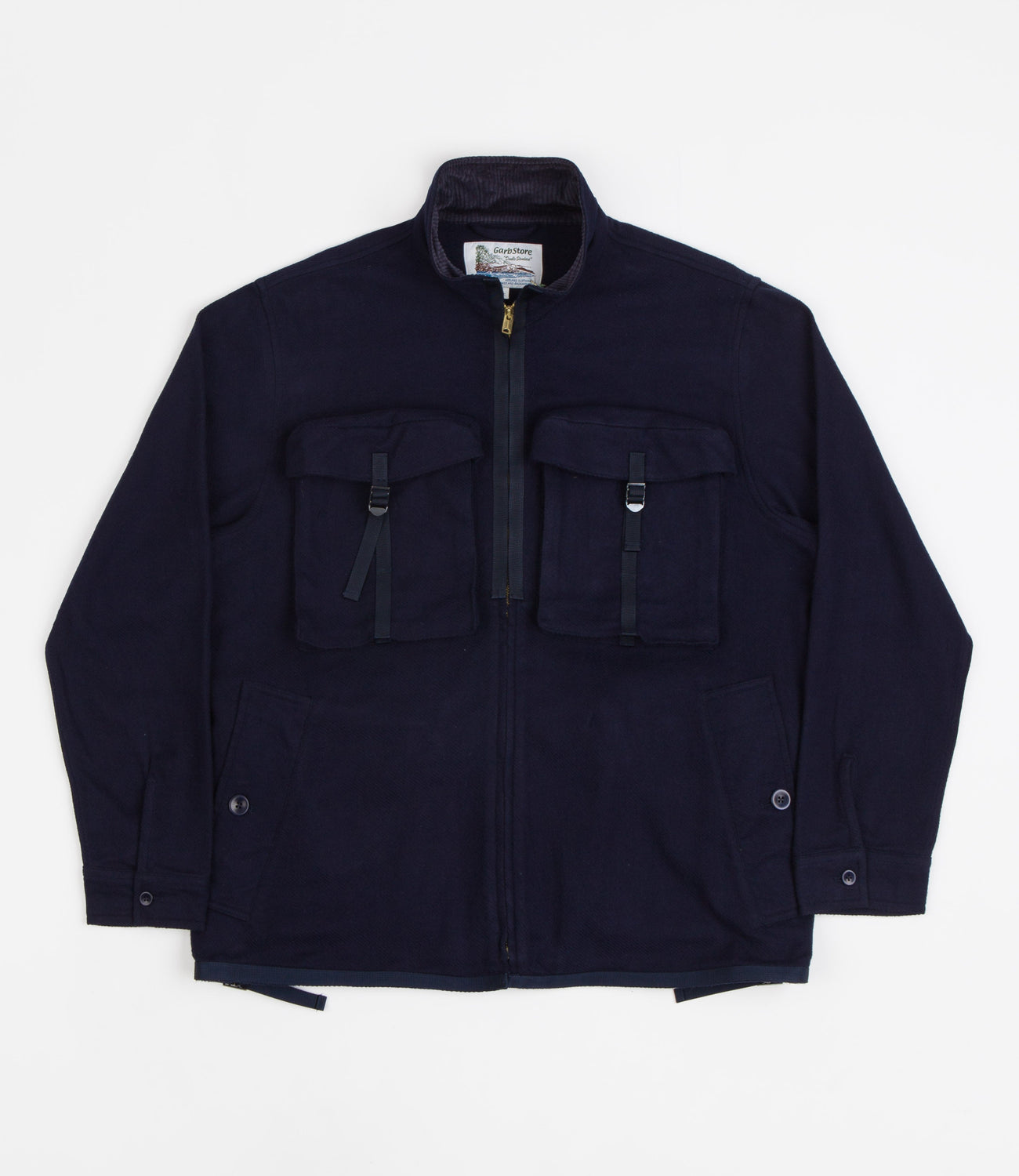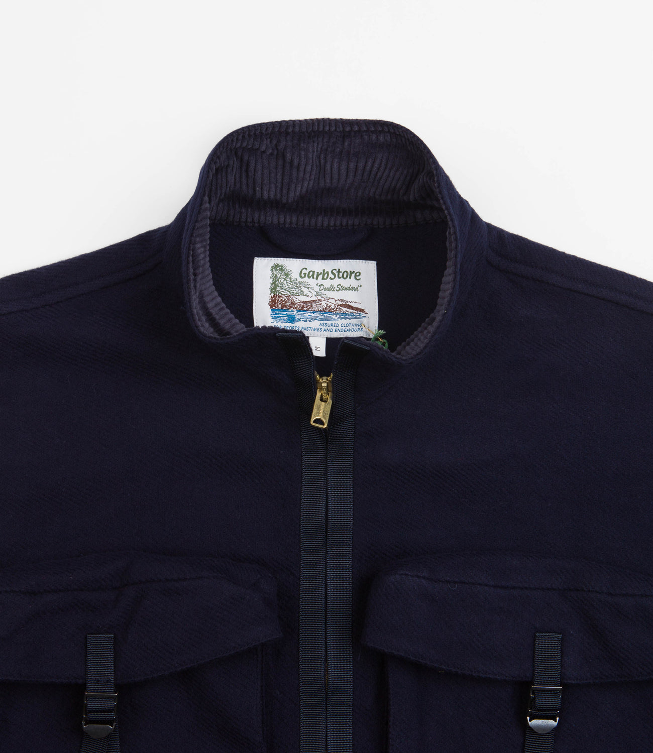 Garbstore V2 Security Jacket in Navy. Tailored to a boxy fitting with a cropped cut, this 100% cotton twill Garbstore jacket is styled with rayon corduroy detailing and is inspired by classic utility stylings. Featuring a full length talon zip fastening, button adjustable cuffs, nylon webbed hemling detailing and metal waist adjusters, this navy Garbstore jacket is finished with a classic stand collar, two large 3D chest pockets and additional pockets above the rear hem.