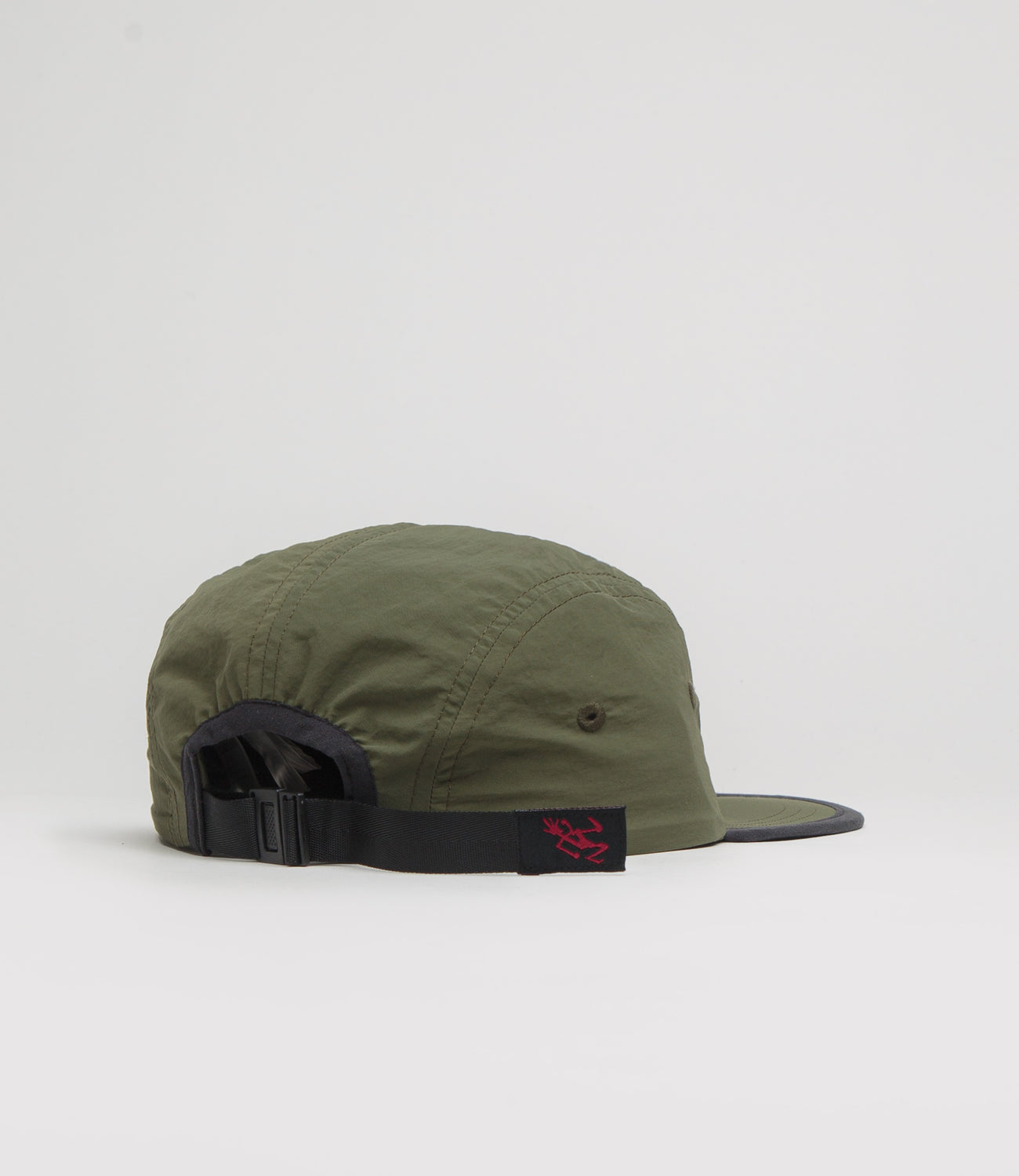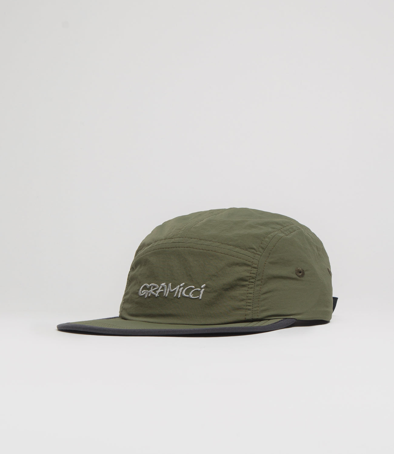 Gramicci Nylon Gramicci Cap in Olive. Single sized and made from 100% nylon, this quick-dry Gramicci cap is designed with a classic five panel construction. Featuring a slightly curved peak, embroidered airflow eyelets and a drawcord rear fastening, this olive green Gramicci cap is finished with embroidered logo branding.