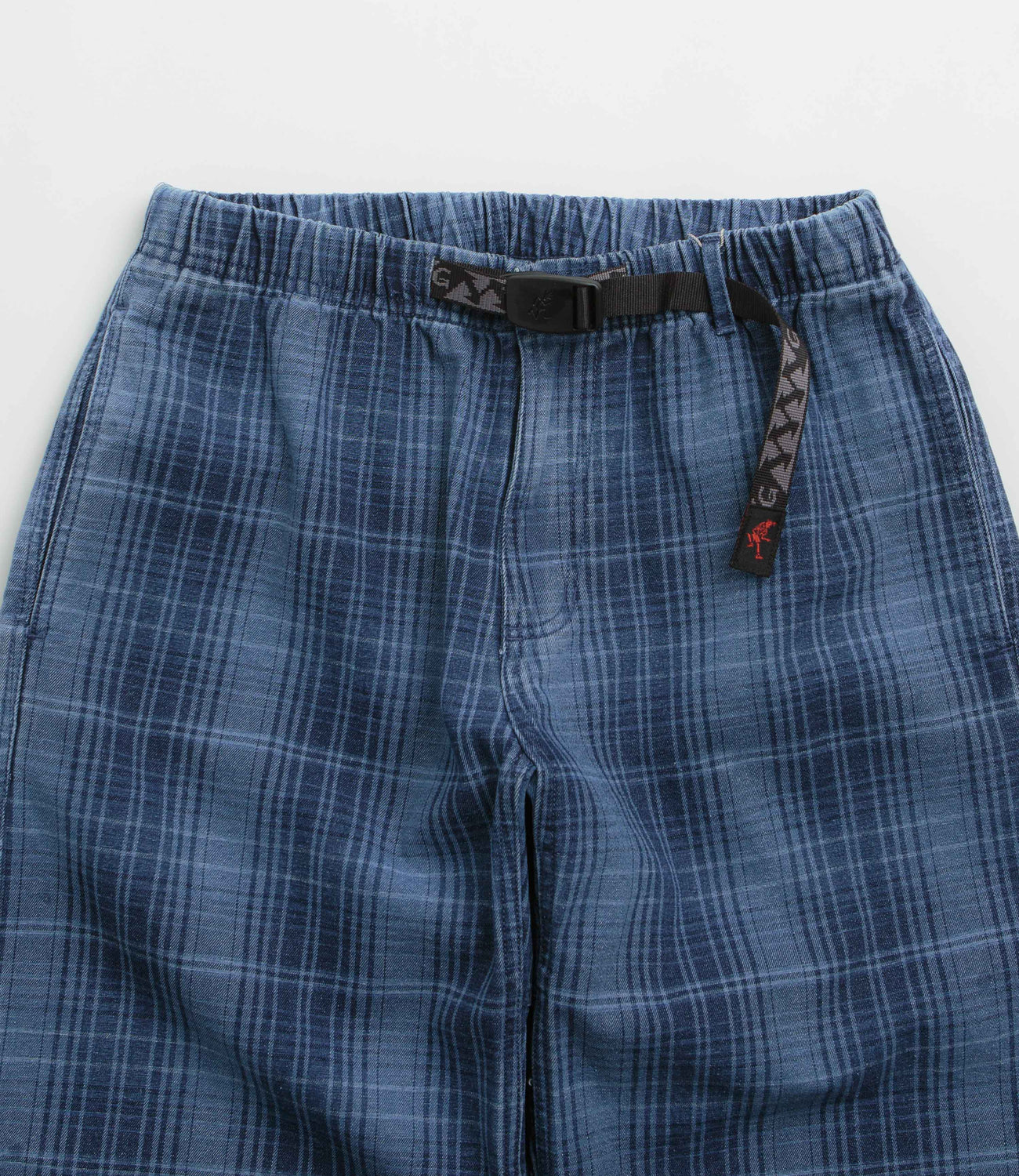 These Gramicci pants in indigo checkered plaid bring classic style with modern ease. Made from 100% cotton denim, they have a regular fit with an elasticated waistband and built-in webbing belt for a secure, adjustable feel. Designed with a gusseted crotch for extra freedom of movement and four handy pockets, finished with woven flag label branding.