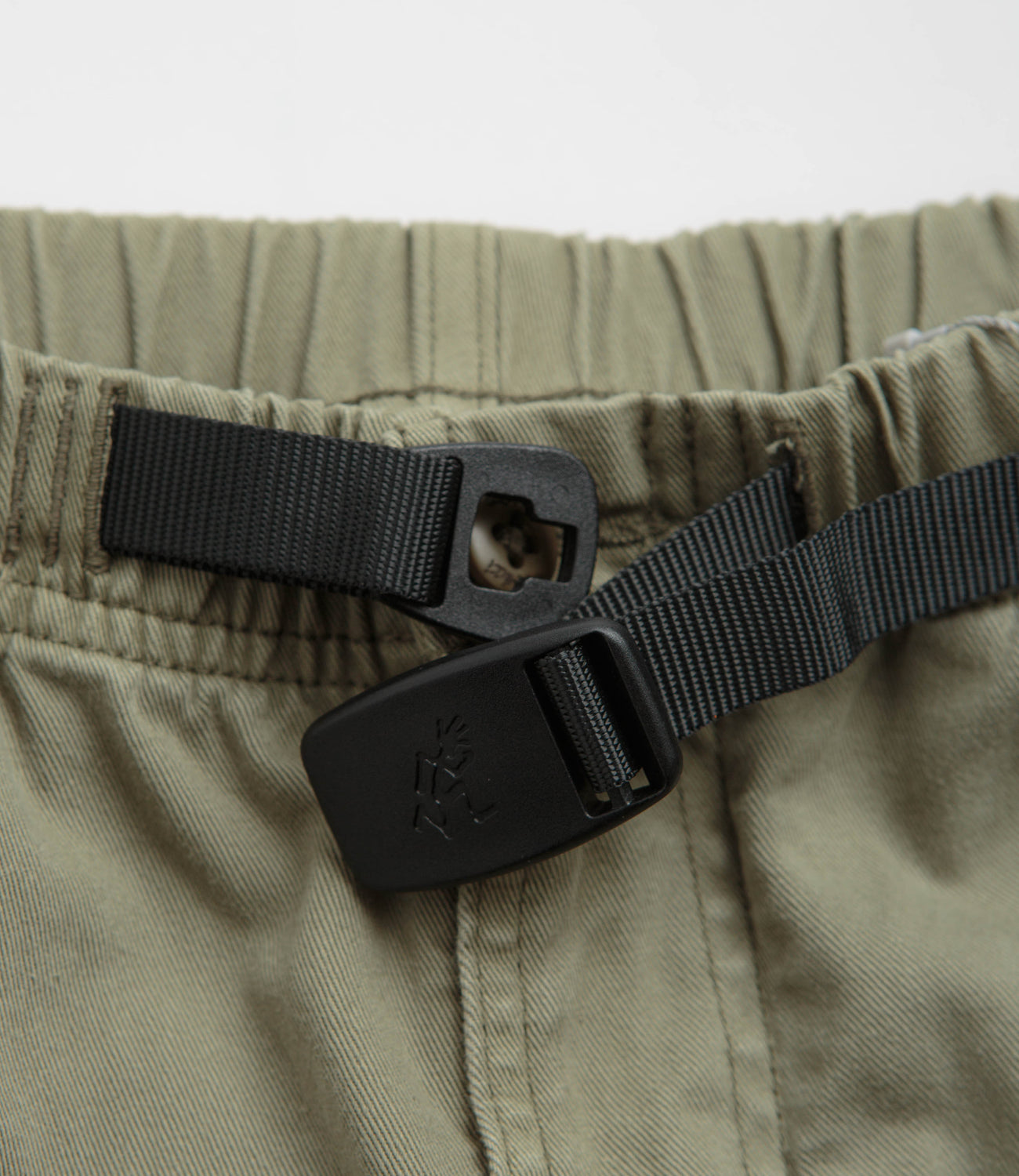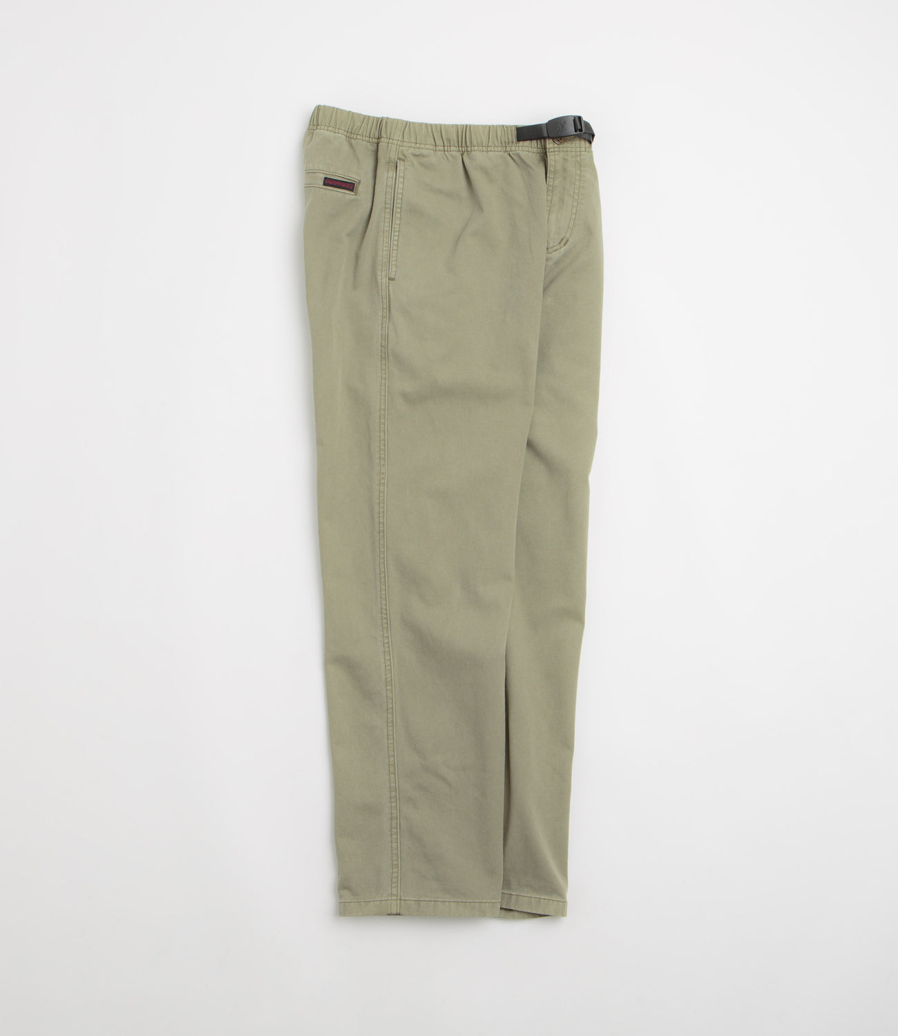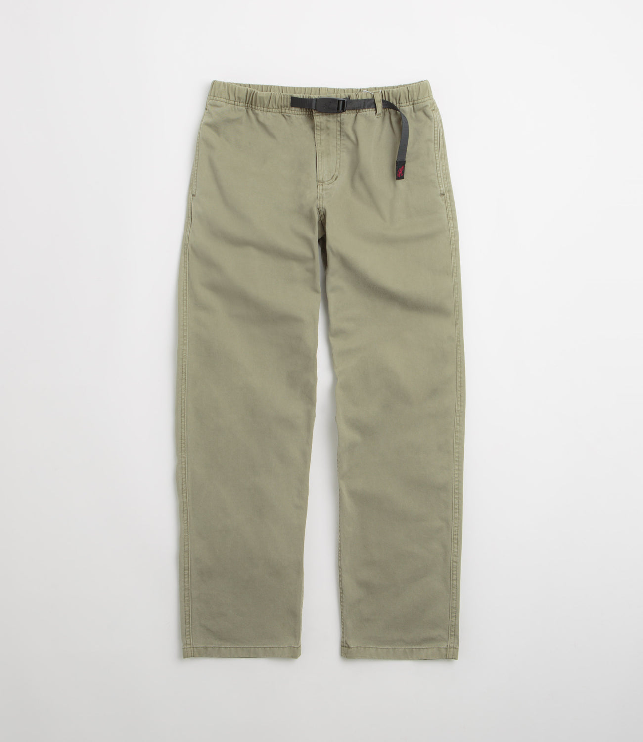 Gramicci Original G Pants in Herb Pigment. Relaxed fitting with a low rise, these Gramicci G-Pants are made from 100% organic cotton twill. Featuring an elasticated waistband, an integrated webbing belt and a diamond-shaped crotch gusset, these beige green Gramicci pants are finished with four pockets and flag label branding.