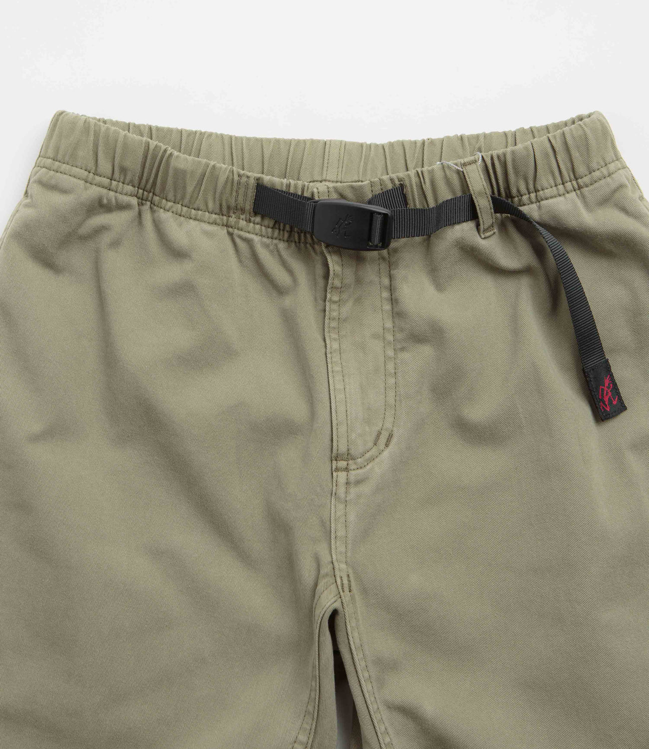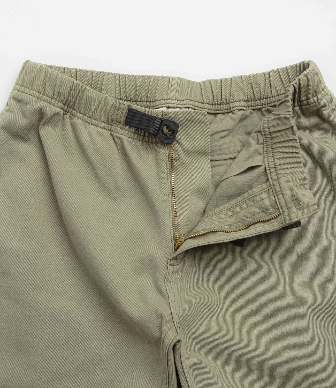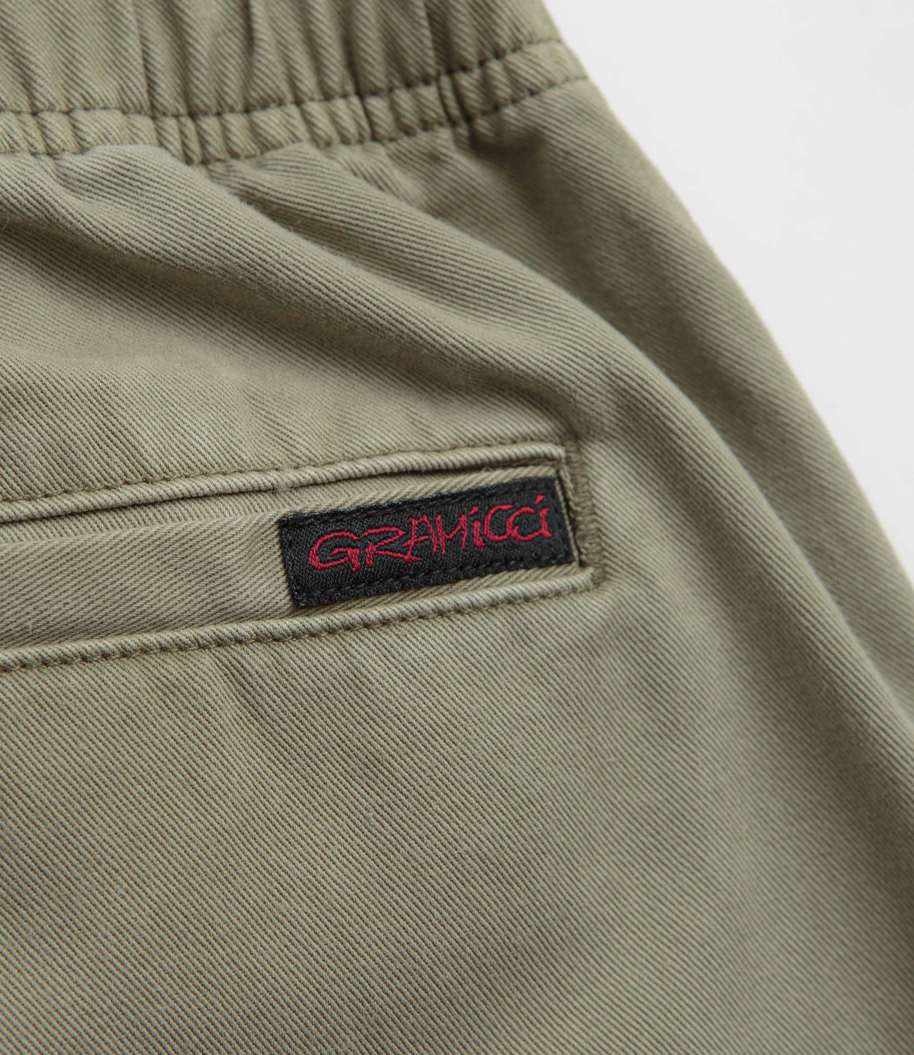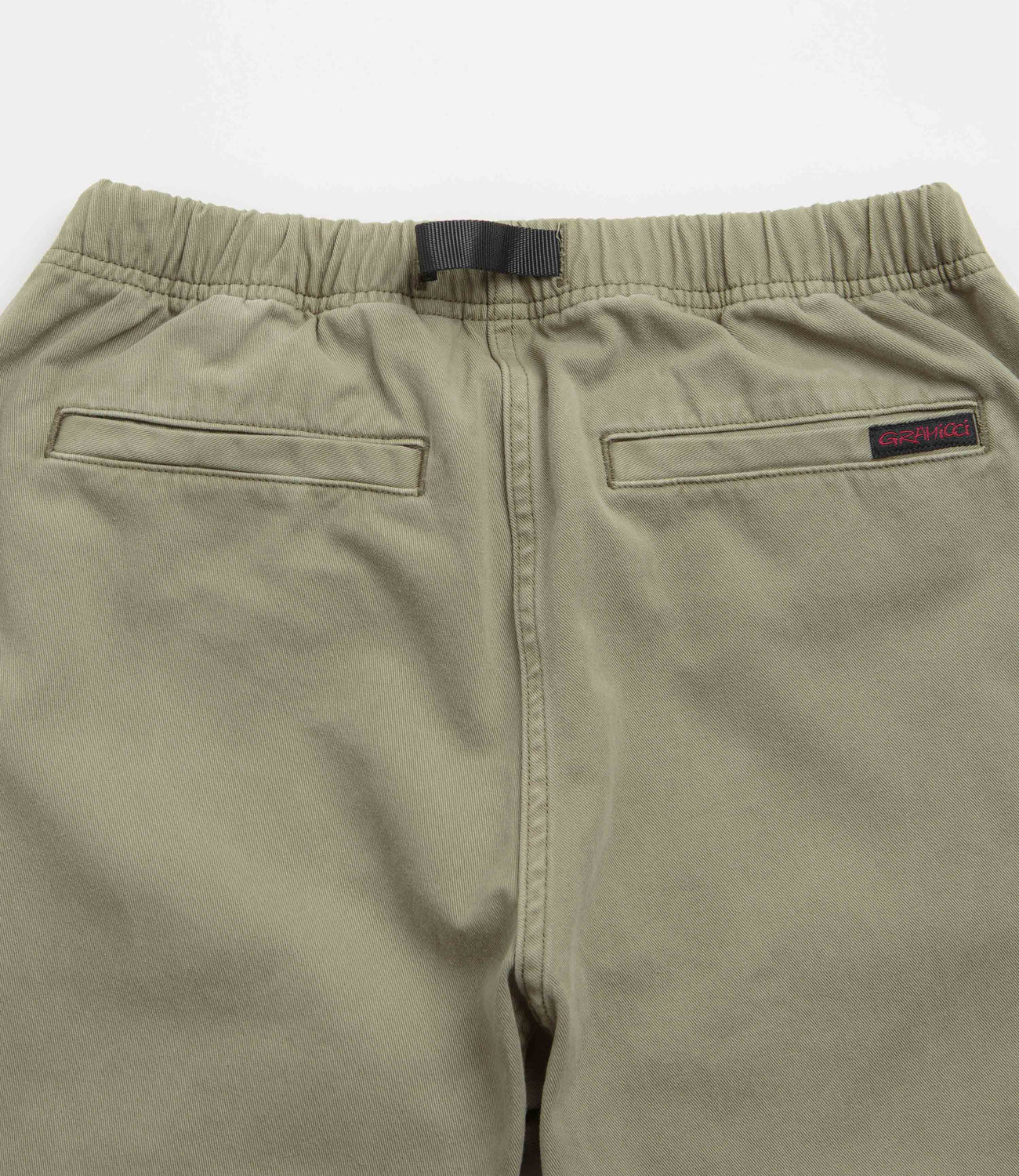 Gramicci Original G Pants in Herb Pigment. Relaxed fitting with a low rise, these Gramicci G-Pants are made from 100% organic cotton twill. Featuring an elasticated waistband, an integrated webbing belt and a diamond-shaped crotch gusset, these beige green Gramicci pants are finished with four pockets and flag label branding.