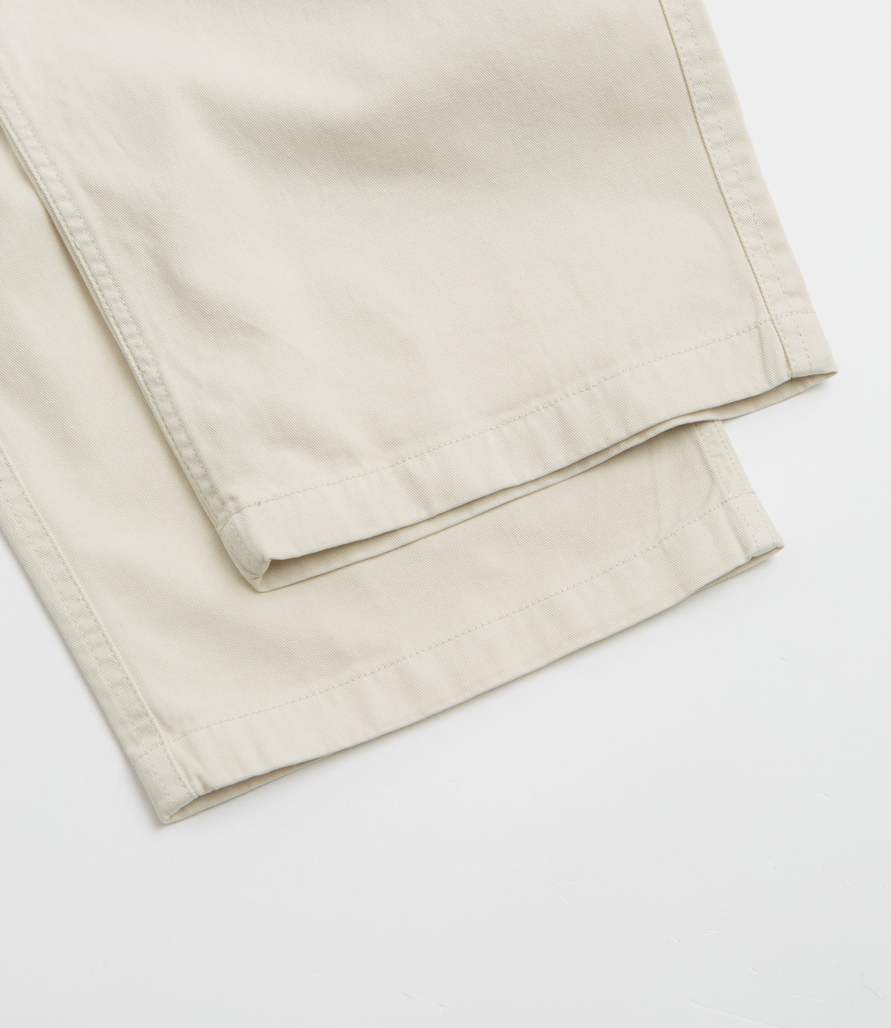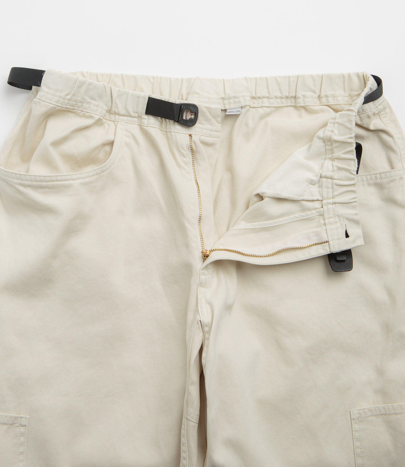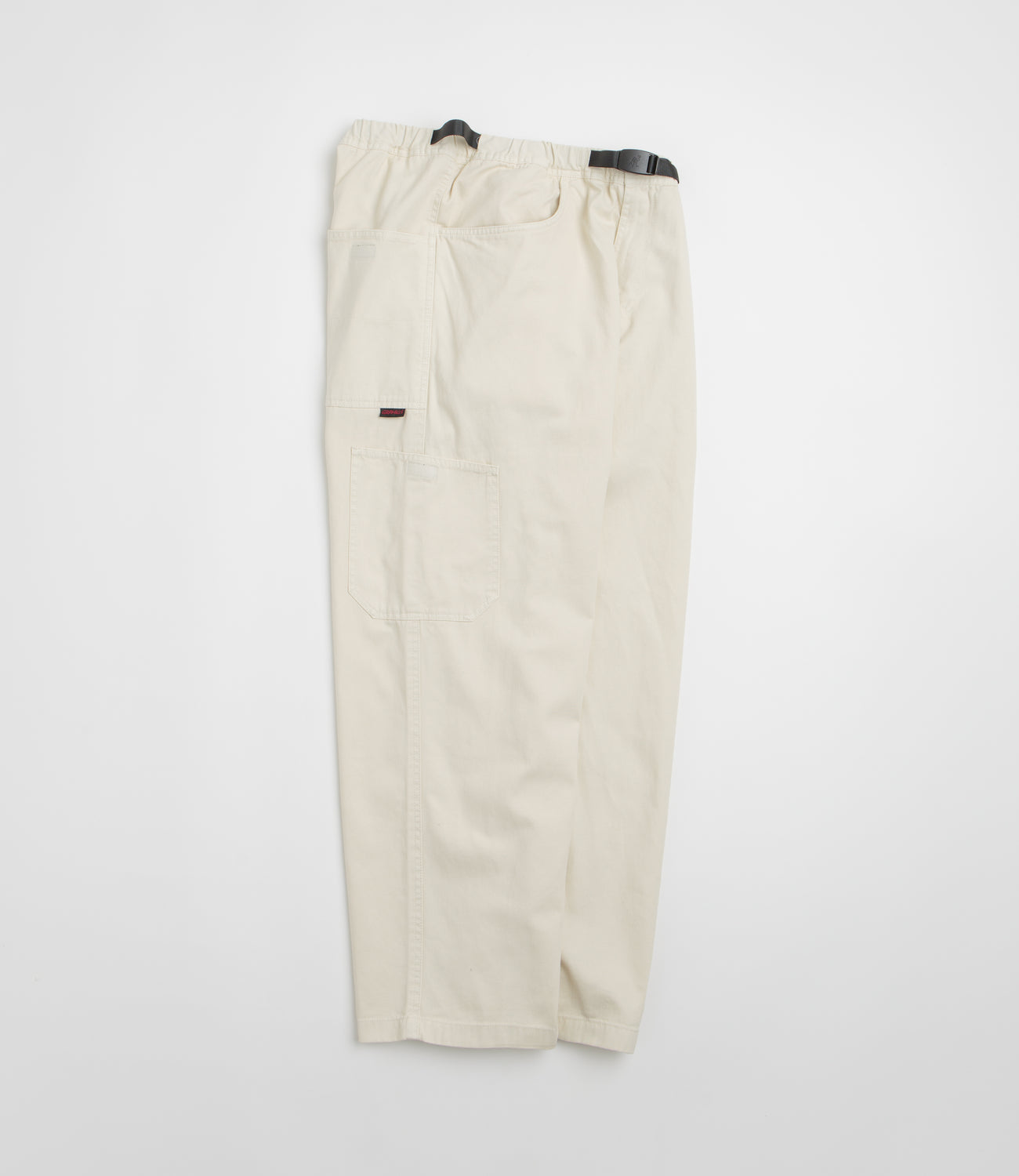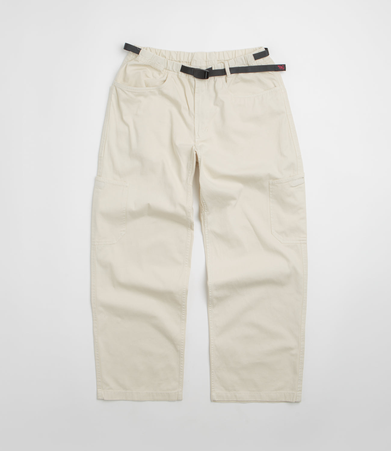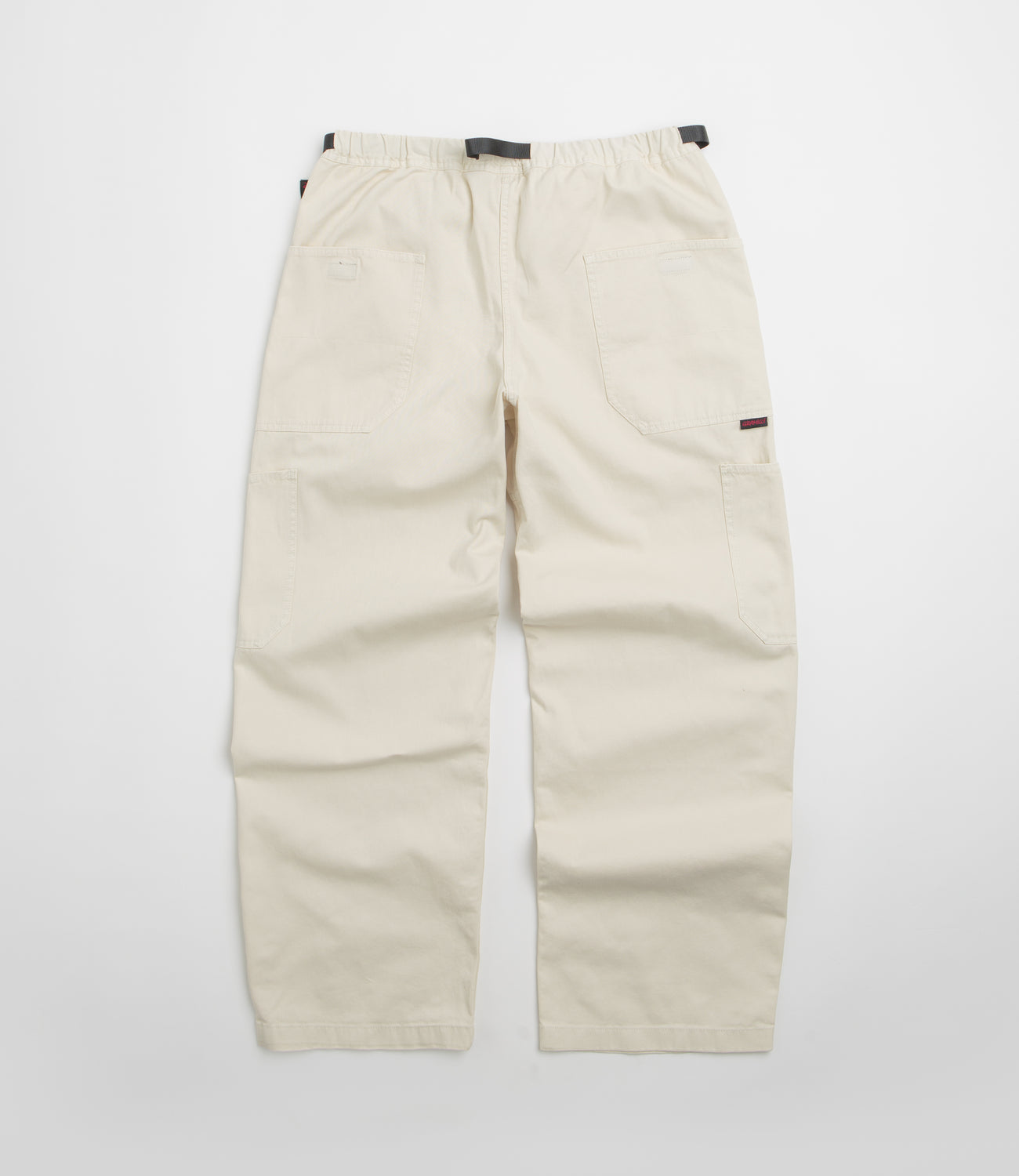 Gramicci Rock Slide Pants in Greige. Utility inspired and relaxed fitting, these Gramicci pants are made from 100% organic cotton. Featuring a washed twill construction with an elasticated waistband and an integrated webbing belt, these beige grey Gramicci pants are finished with a tapered leg, four classic pockets and with two lower cargo pockets.