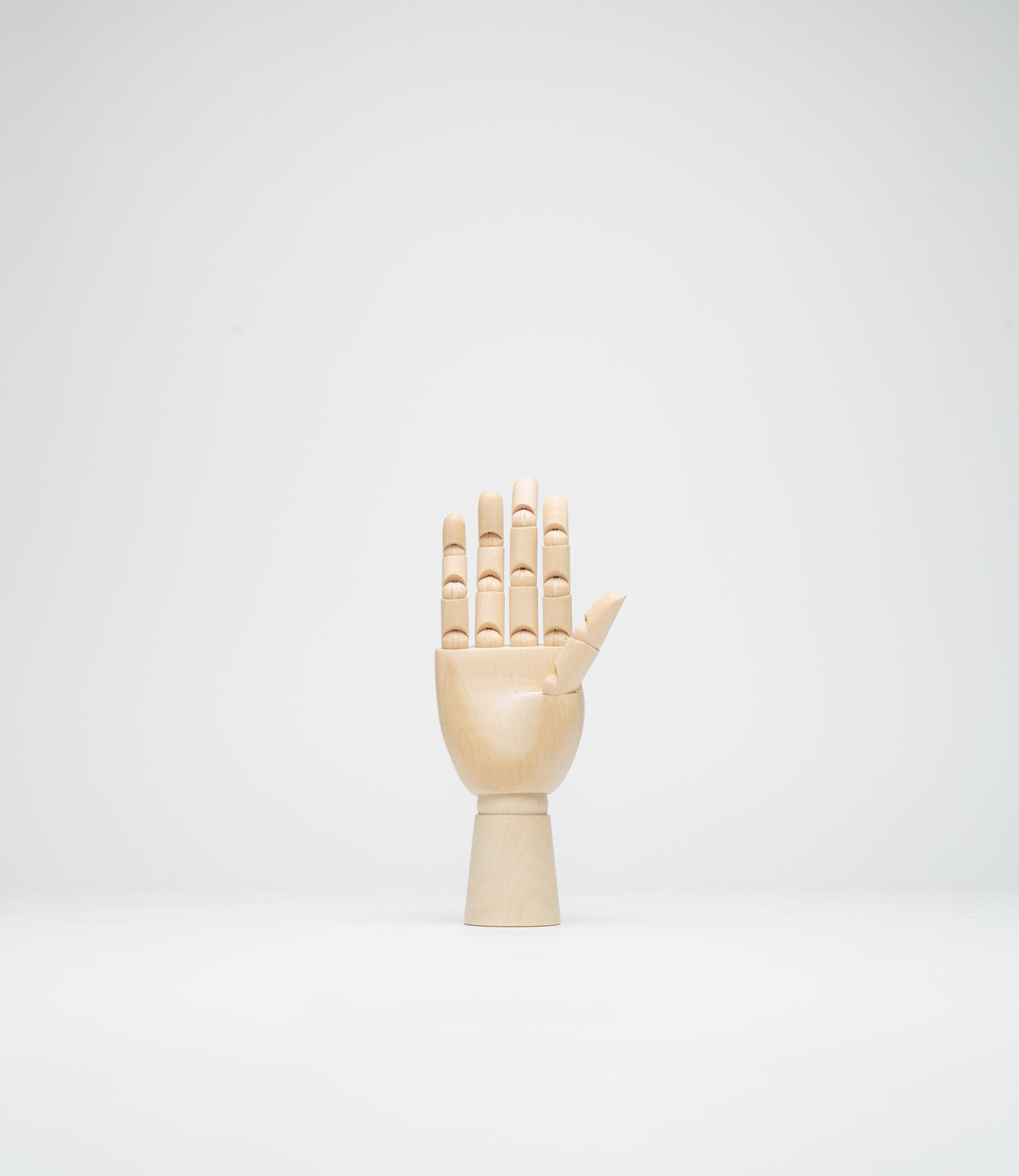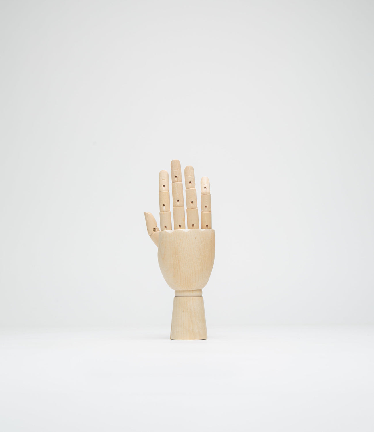 HAY Wooden Hand in Medium. Suitable for artistic and decorative use, this HAY wooden hand is crafted from 100% natural birch. Fully adjustable and finished with a flat base and a height of 18cm.