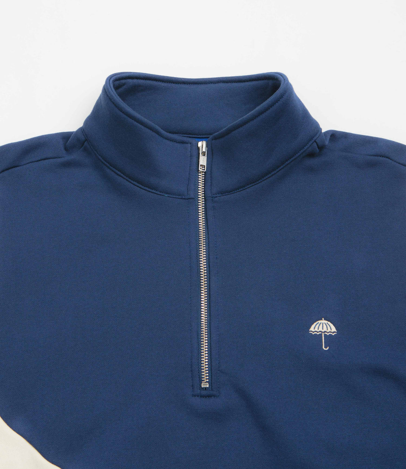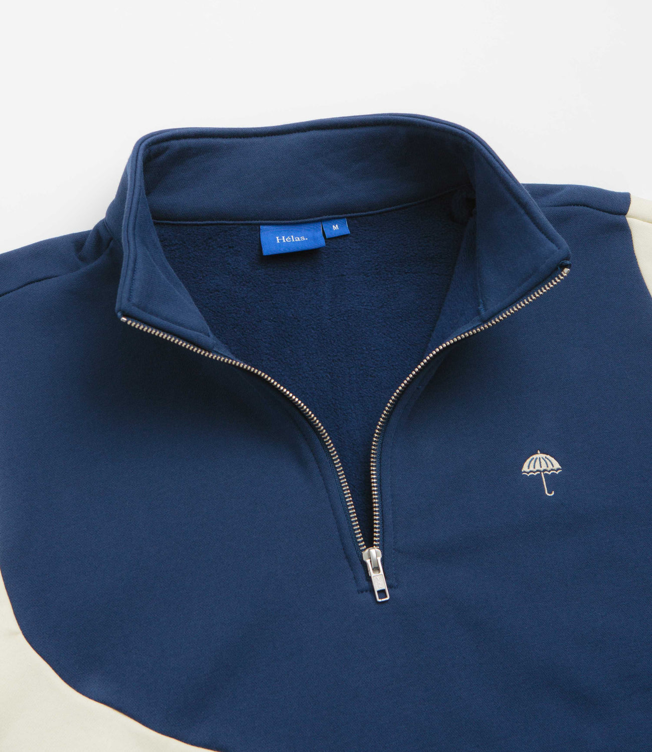 Helas Forma Quarter Zip Sweatshirt in Navy and Beige. Regular fitting with contrasting colour-block detailing, this Helas sweashirt is made from a cotton-polyester blend. Featuring a stand collar and a quarter-length zipper fastening, this navy Helas sweater is finished with ribbed cuffs and embroidered logo branding.