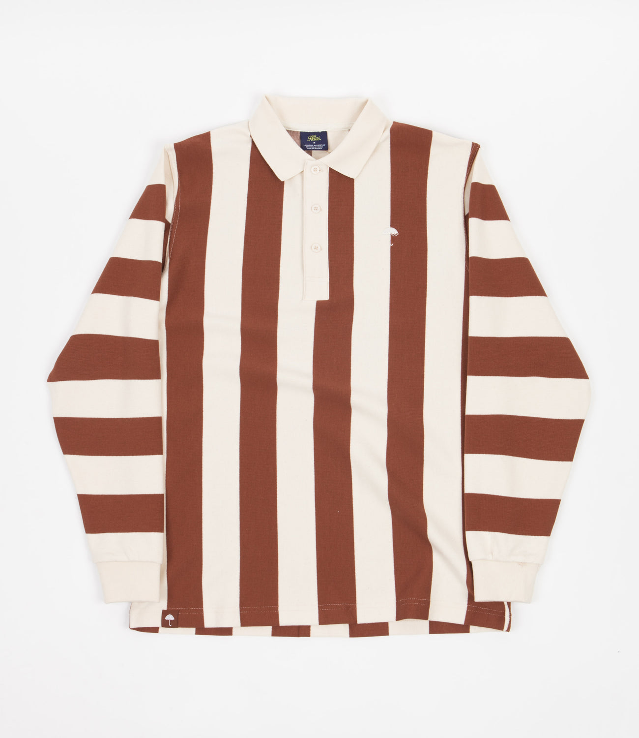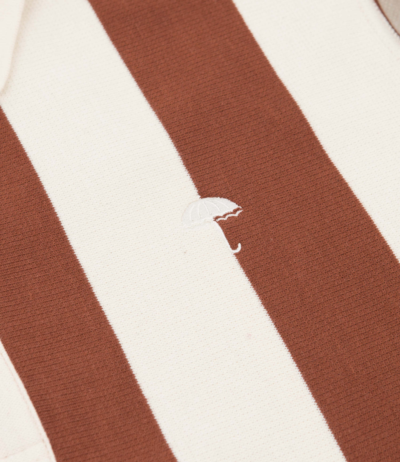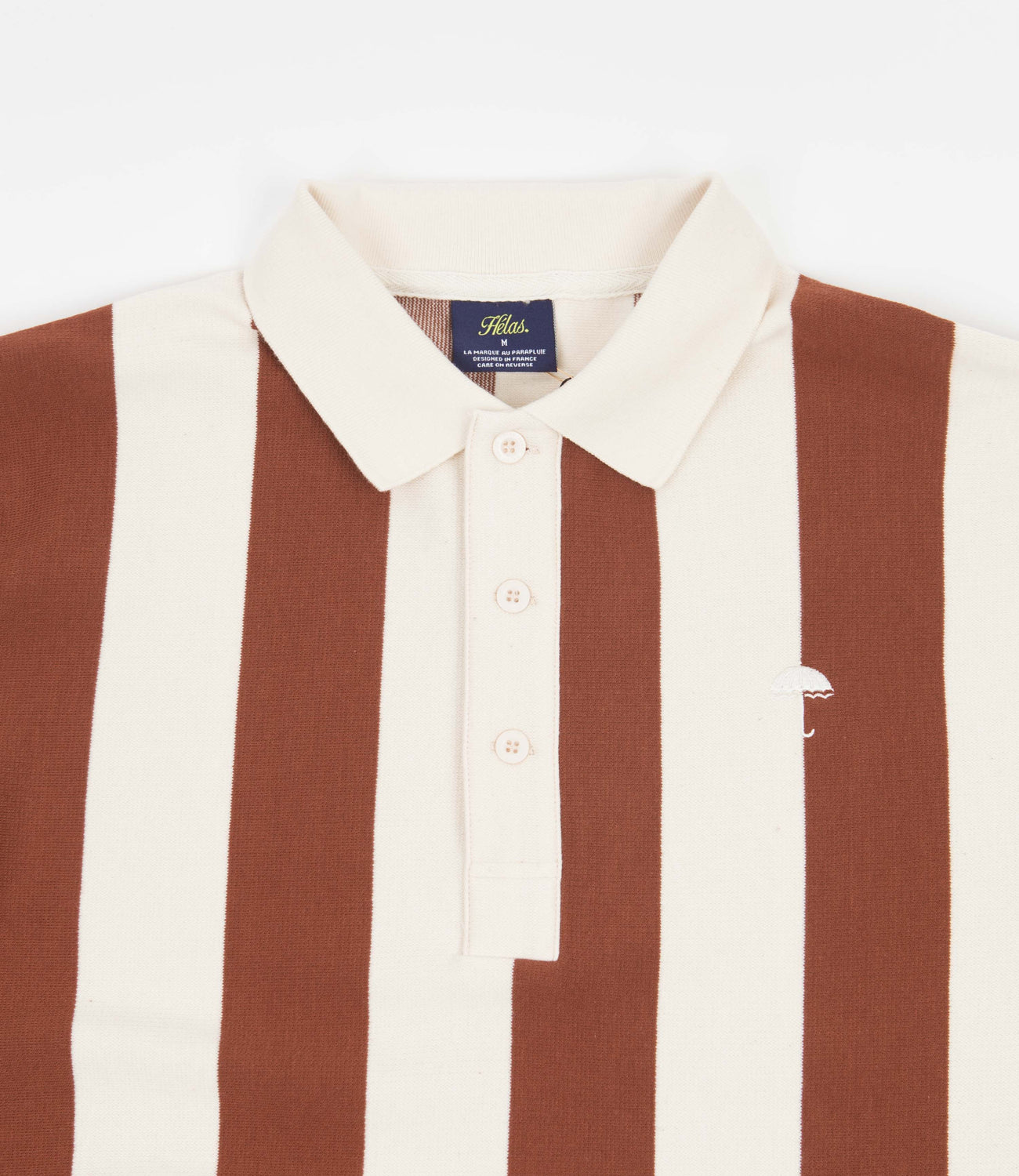 Helas Ray Long Sleeve Polo Shirt in Beige and Brown. Inspired by classic team sport silhouettes with its rugby jersey aesthetic, this new season Helas polo shirt is a long sleeve layer from the brand’s latest seasonal collection. Crafted from a premium blend of 96% cotton and 4% spandex, this repeated stripe silhouette is tailored to a relaxed fitting for elevated everyday comfort. Remaining true to its classic sportswear remit, this two tone shirt features block tone elasticated cuffs, a reinforced straight cut hemline and a practical three button placket that feeds neatly into a neutral toned pointed collar neckline. Across the hemline an embroidered flag label complements the embroidered umbrella logo across the left chest, whilst its earthy beige and brown colouring pays homage to the autumnal months of the year.