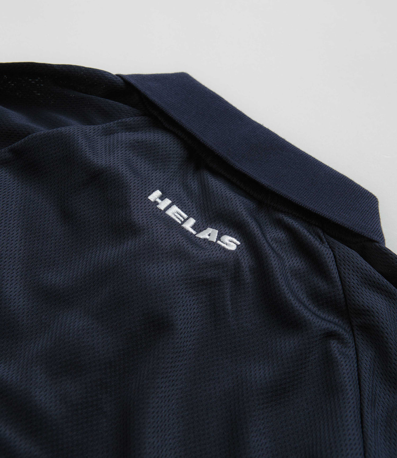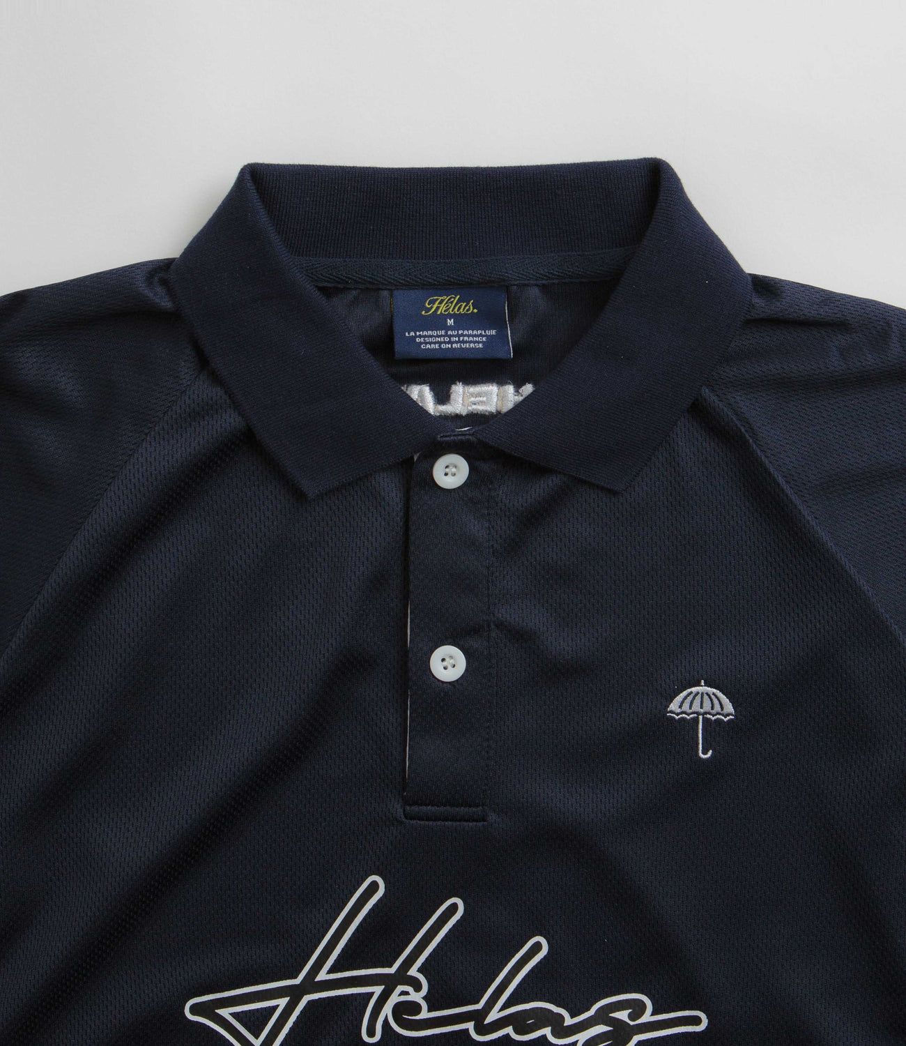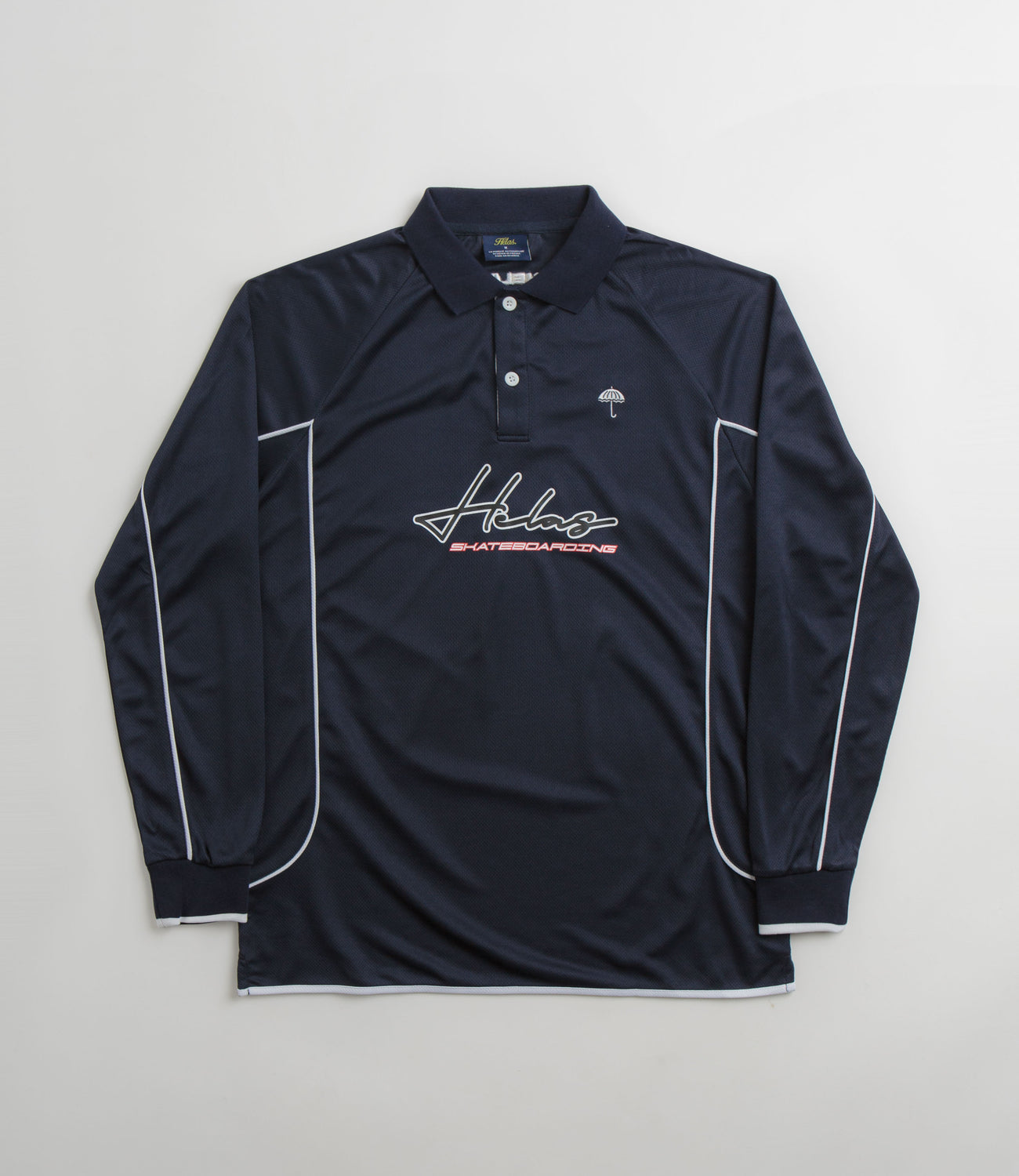 Hélas Skateboarding Jersey Polo Shirt in Navy. Tailored to a regular fitting and sportswear inspired, this Hélas polo shirt is made from 100% polyester with a double button placket and a classic stand collar. Featuring piped raglan sleeves and contrasting underarm detailing, this navy Hélas polo is finished with a screen printed chest graphic, an embroidered chest logo and with additional rear embroidery.