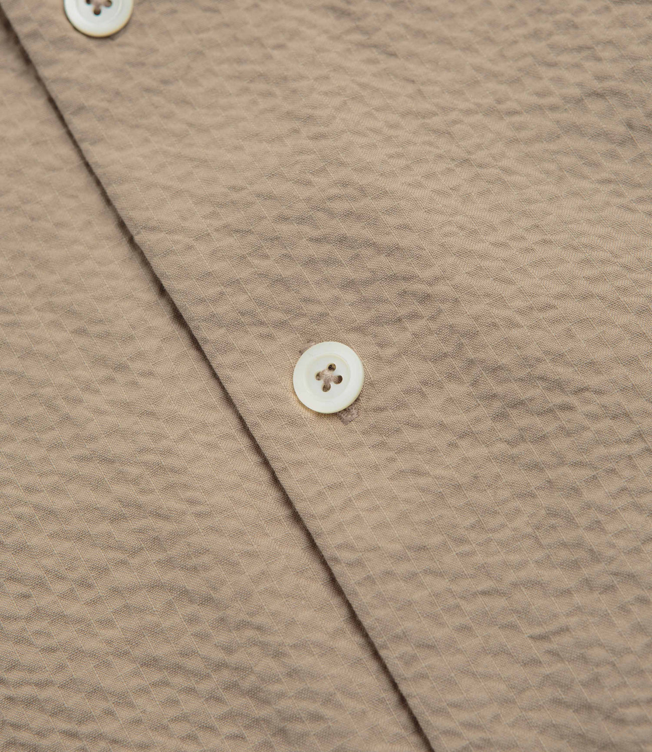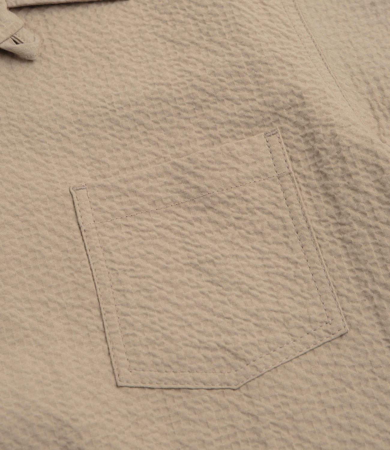 Howlin' Cocktail Short Sleeve Shirt in Biscuit Seersucker. Crafted from a cotton-elastane blend, this lightweight Howlin’ shirt is designed with a seersucker construction. Featuring a camp collar and a full length button fastening, this khaki brown Howlin’ shirt is finished with mother of pearl hardware and a single chest pocket.
