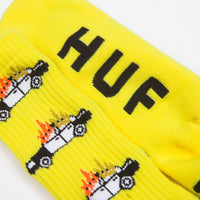 HUF Civil Disobedience Socks in Yellow. Made from a cotton-polyester blend and styled with woven jacquard artwork, these crew length HUF socks are styled to a single sized fitting. Featuring rib knit cuffs and reinforced toe box stitchings, these yellow HUF socks are finished with a repeating on-fire police car design with additional woven HUF footbed branding.