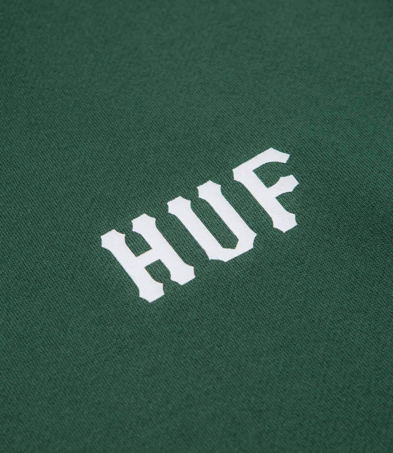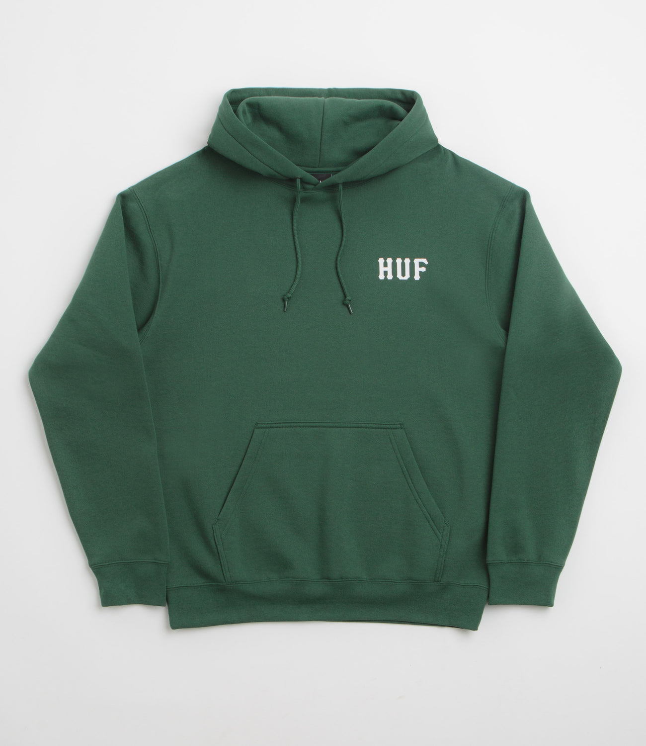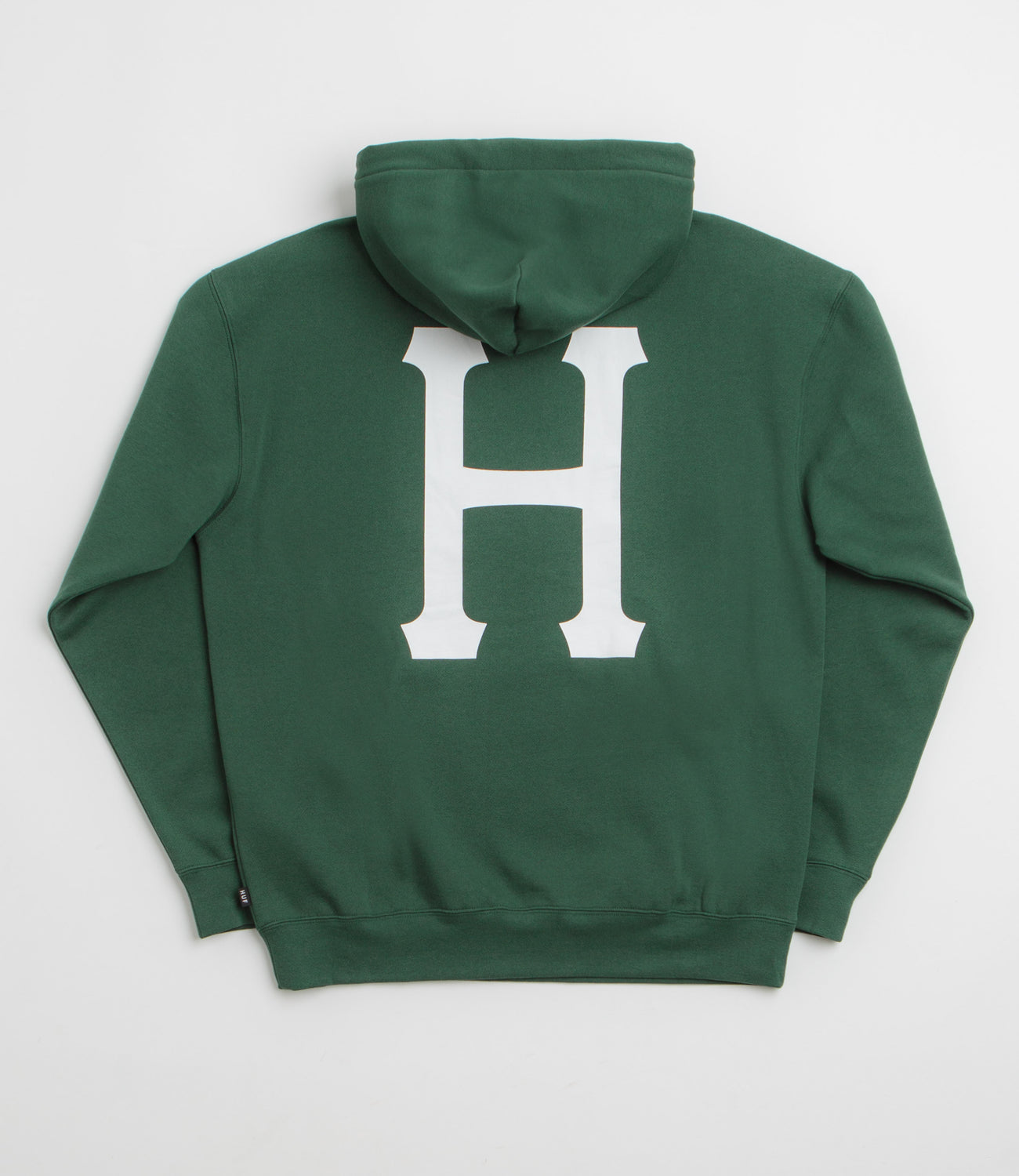 HUF Classic H Hoodie in Forest Green. Regular fitting, this colour block HUF hoodie is made from a cotton-polyester fleece blend. Featuring an adjustable drawcord hood, a kangaroo front pocket and ribbed cuffs, this green HUF hoodie is finished with a woven elastic hem and printed front and rear graphics.
