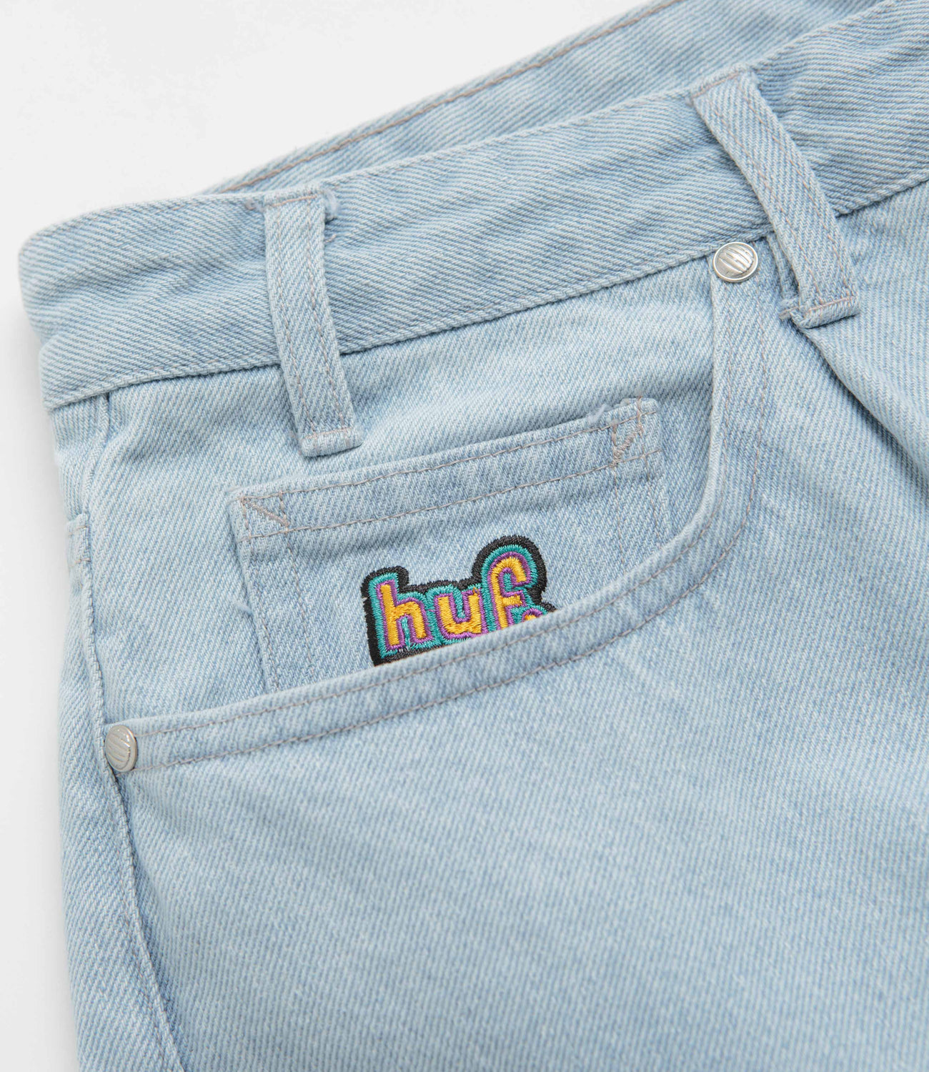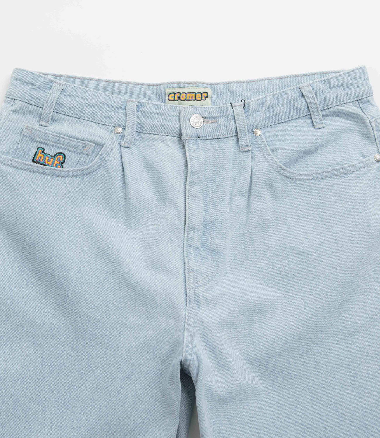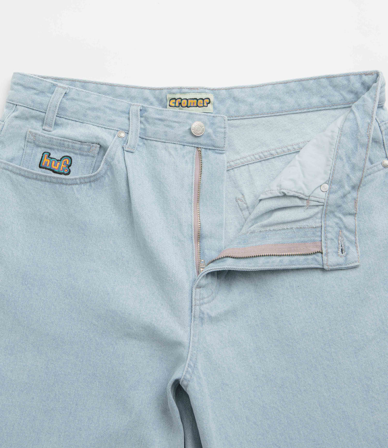 HUF Cromer Jeans in Light Blue. Designed in collaboration with team rider Brad Cromer, these 90s inspired baggy fitting HUF jeans are made from 100% cotton denim with a fixed belt loop waist. Featuring a single button secured zipper fly, double-needle reinforced seams and a tapered leg cut, these light blue HUF jeans are finished with four classic pockets, an integrated coin stash, an embroidered logo and woven flag label branding.