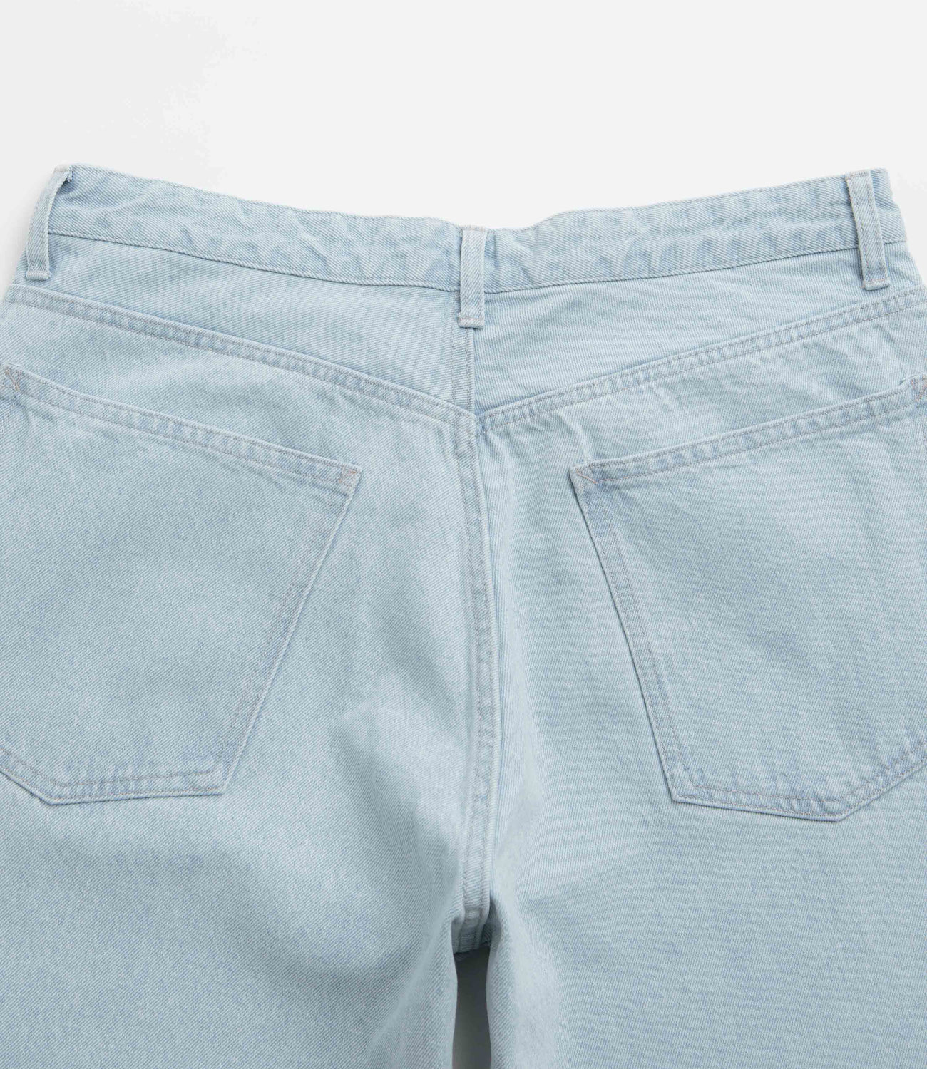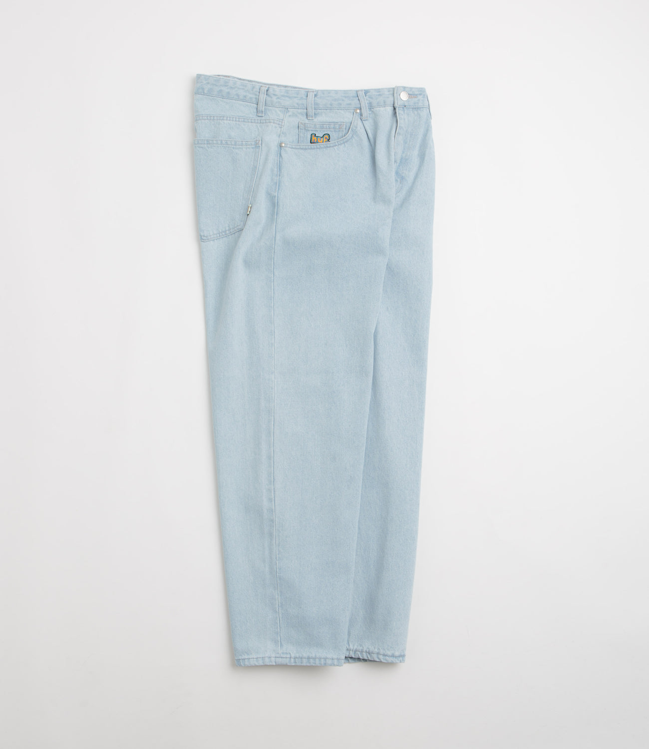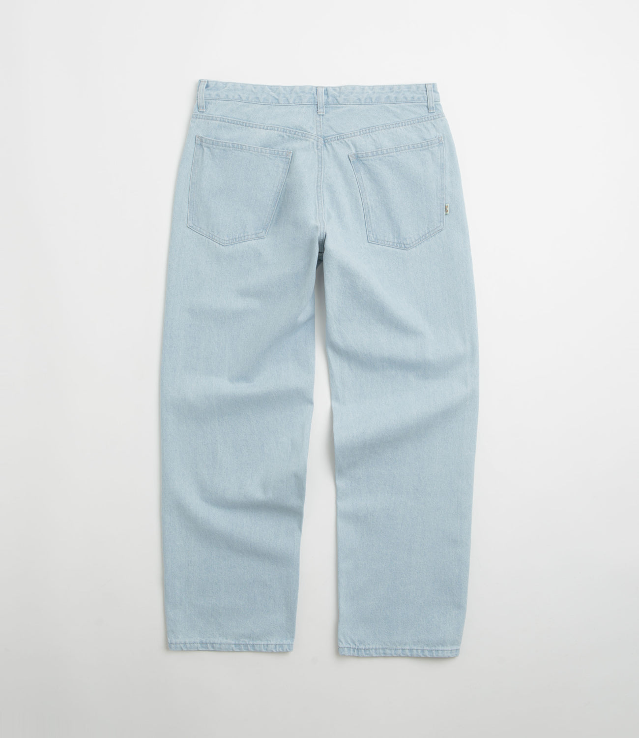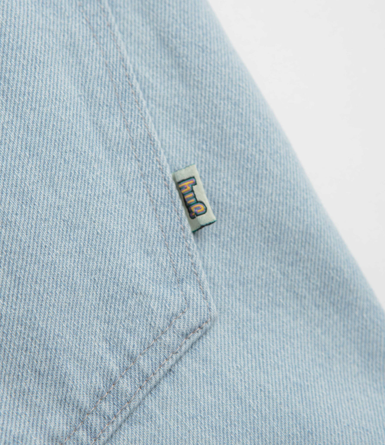 HUF Cromer Jeans in Light Blue. Designed in collaboration with team rider Brad Cromer, these 90s inspired baggy fitting HUF jeans are made from 100% cotton denim with a fixed belt loop waist. Featuring a single button secured zipper fly, double-needle reinforced seams and a tapered leg cut, these light blue HUF jeans are finished with four classic pockets, an integrated coin stash, an embroidered logo and woven flag label branding.