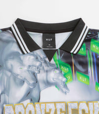 HUF x Bronze 56K Glitched Soccer Jersey in Multi. Designed with all-over sublimated artwork, this regular fitting HUF soccer jersey arrives as part of the brand’s latest collaboration with Bronze 56K. Featuring a yarn-dyed striped collar and contrasting side panels, this multi-coloured HUF jersey is finished with all-over custom graphics.