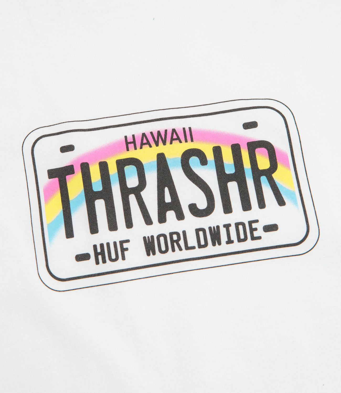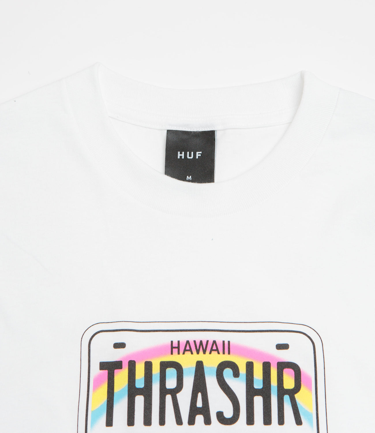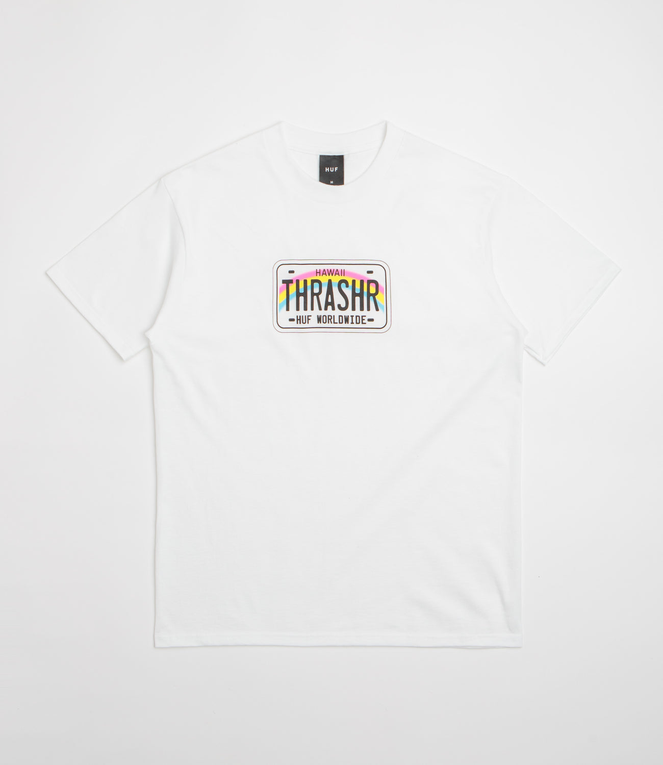 HUF x Thrasher License Plate T-Shirt in White. Regular fitting, this HUF t-shirt is made from 100% cotton. Part of the brand’s collaboration with Thrasher, this white HUF t-shirt is finished with a rib knit collar and printed artwork.