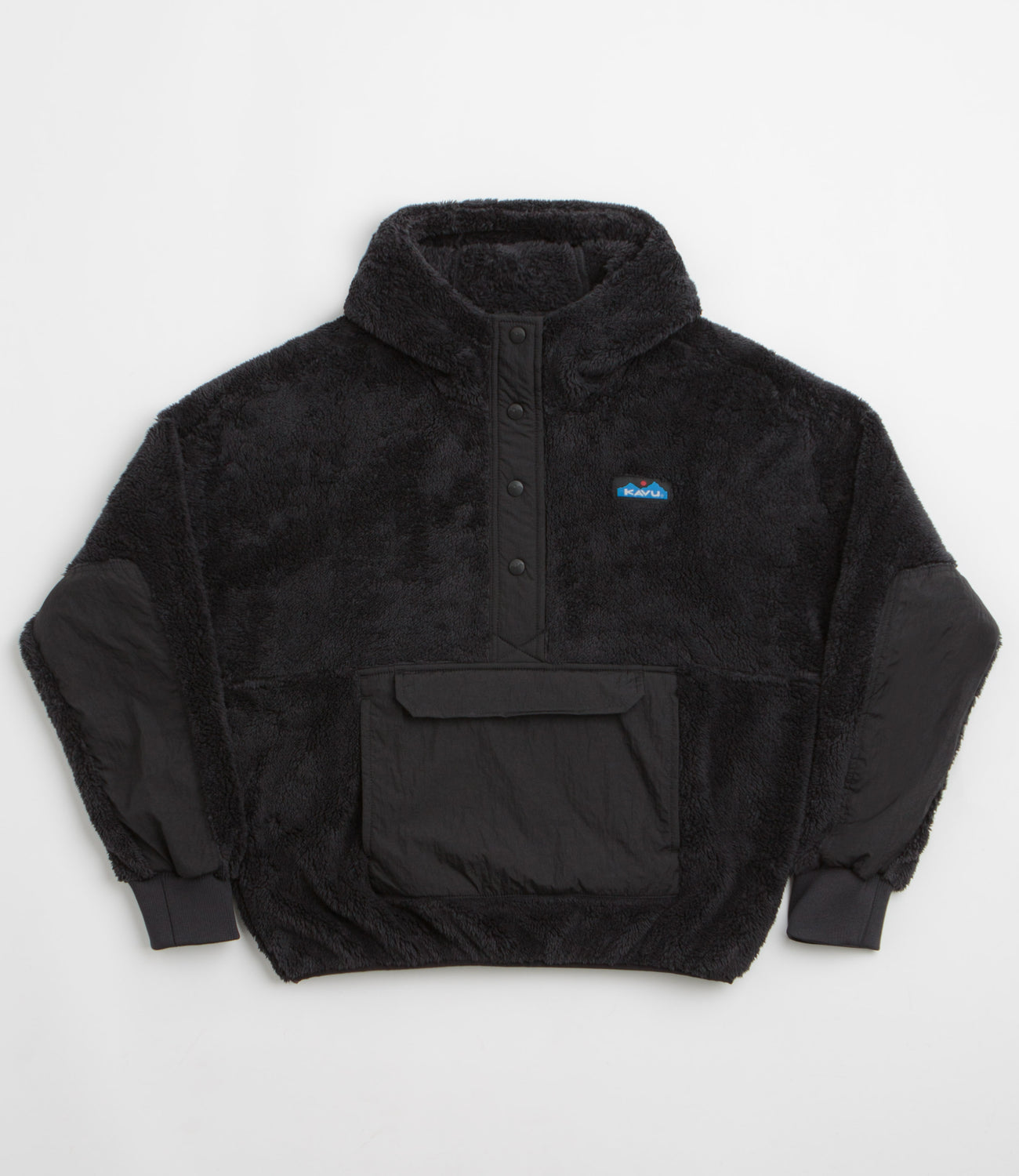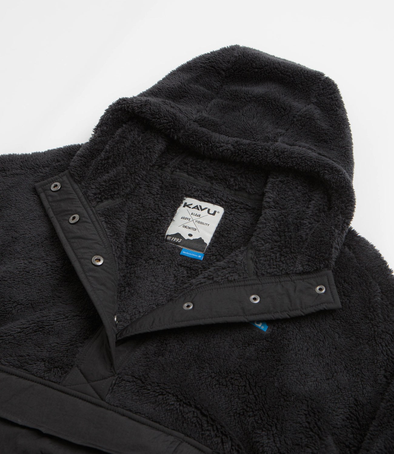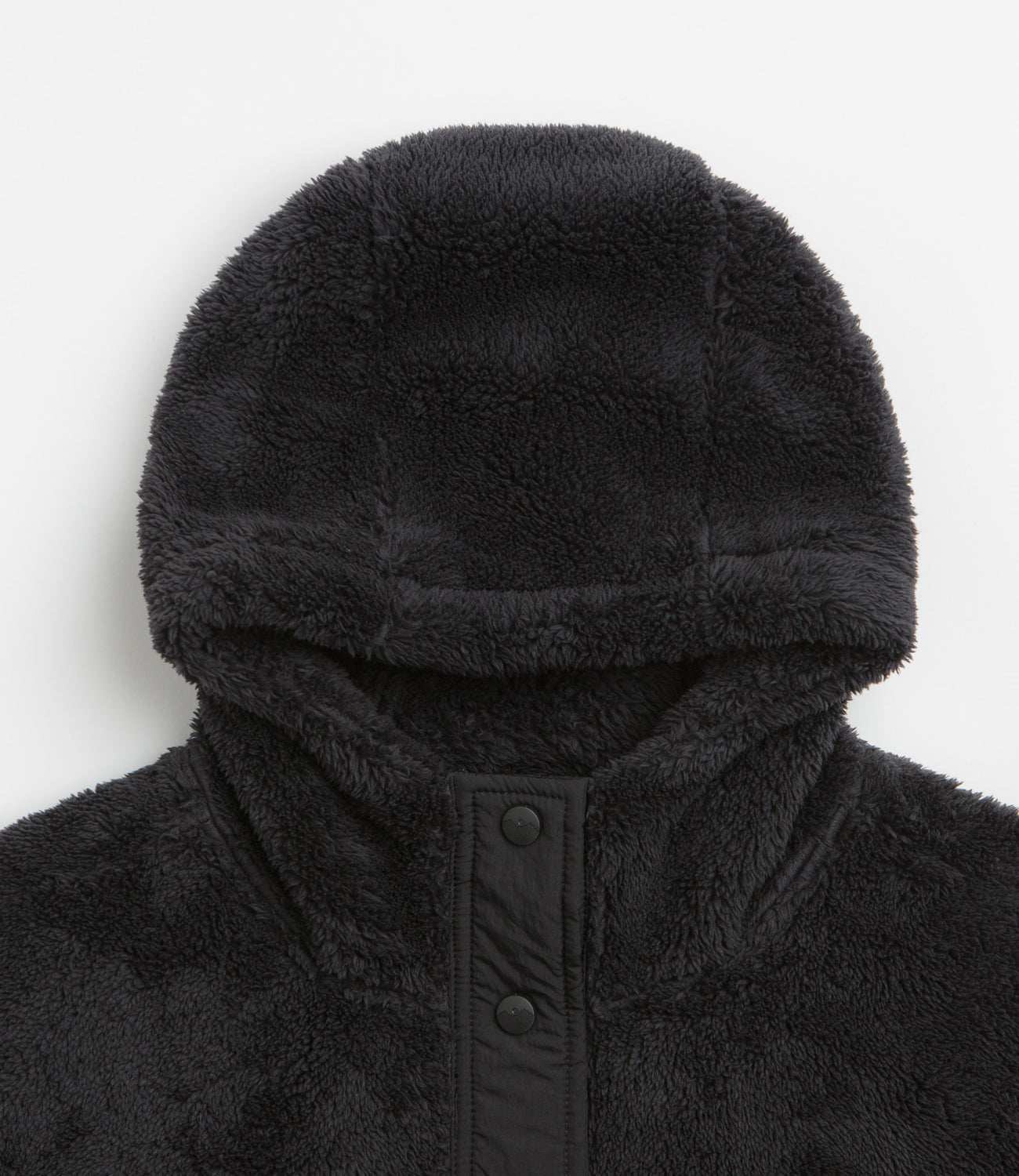 Kavu Womens Moon Ridge Hooded Fleece in Blackout. Relaxed fitting and made from 100% recycled polyester double-sided Sherpa fleece, this Kavu fleece is designed with a panelled hood and a mock neck collar. Featuring a half-length snap fastening, dropped shoulders and a side-entry centre pocket, this black Kavu womens fleece is finished with ribbed cuffs, an elasticated hem and flag label branding.