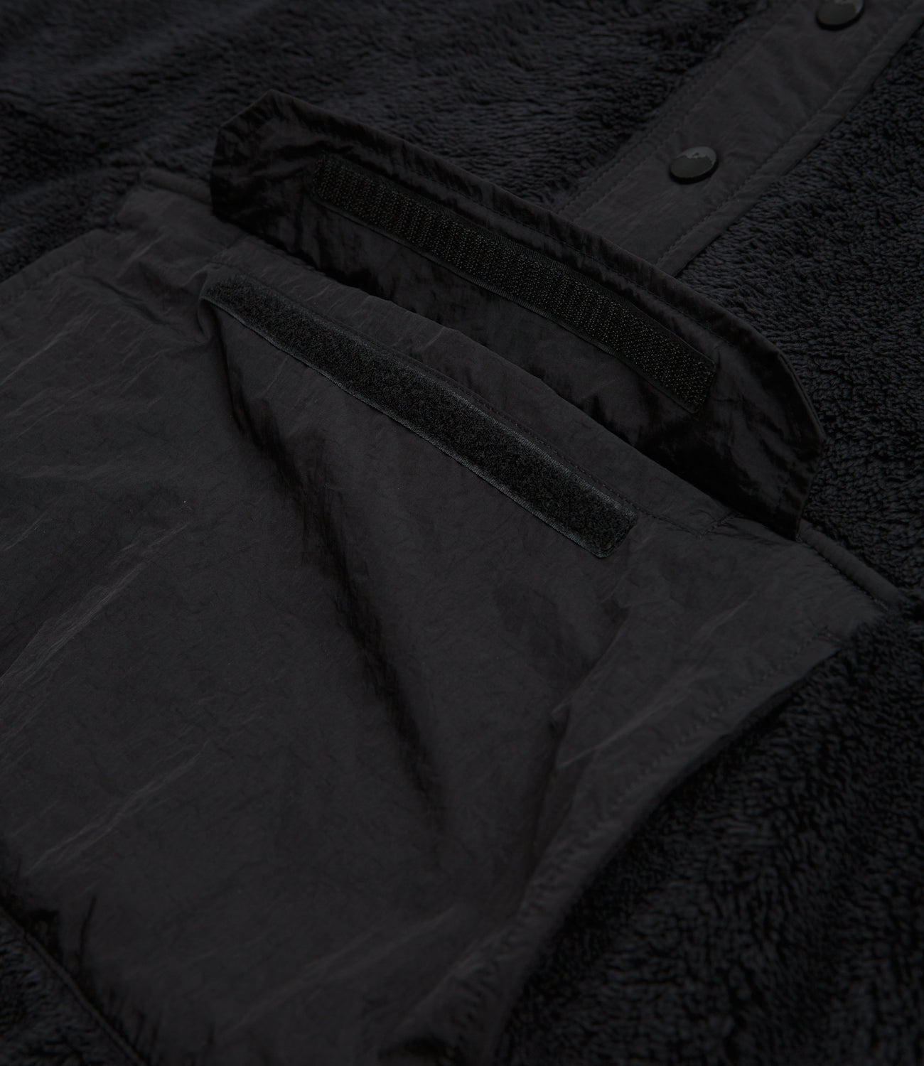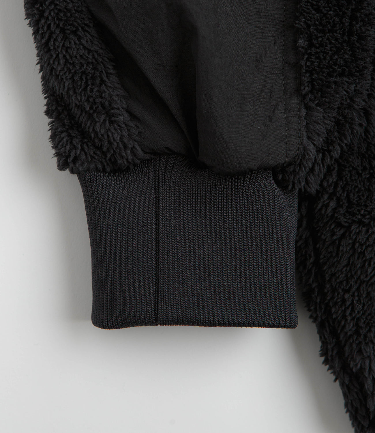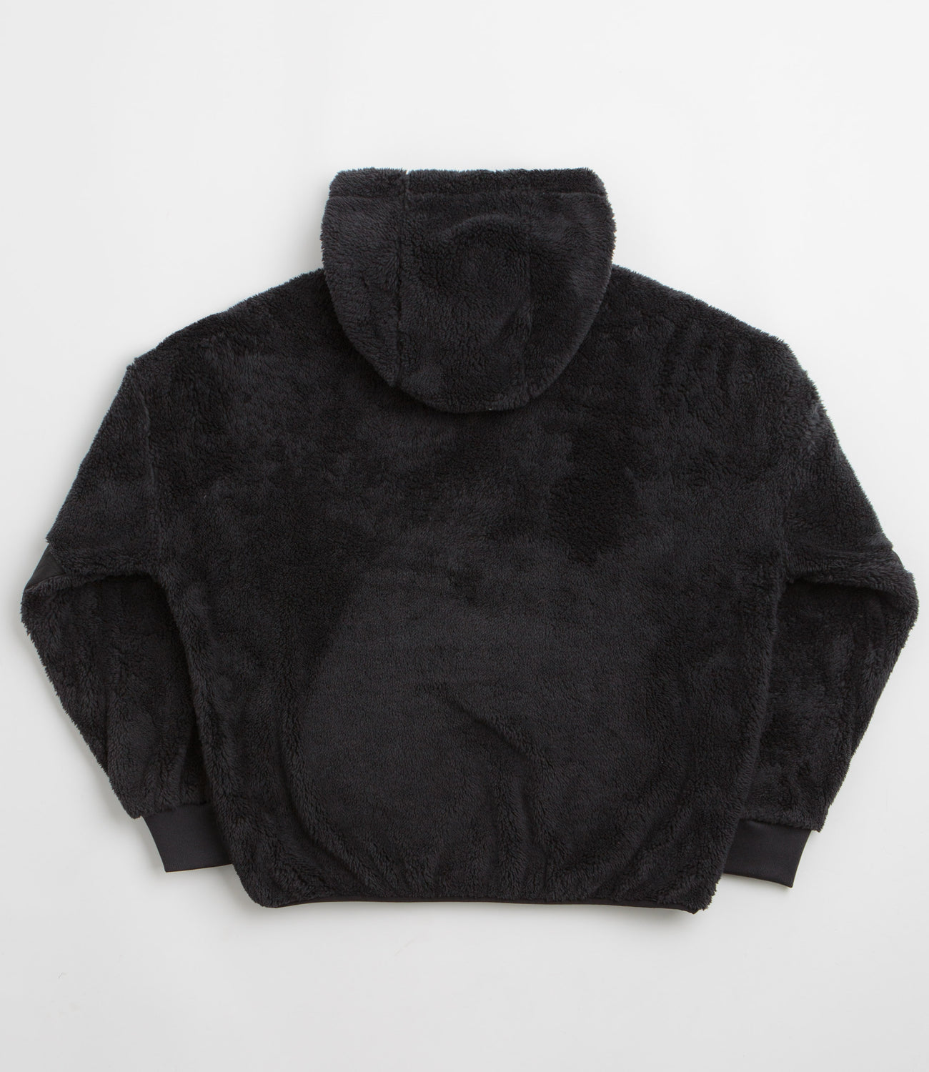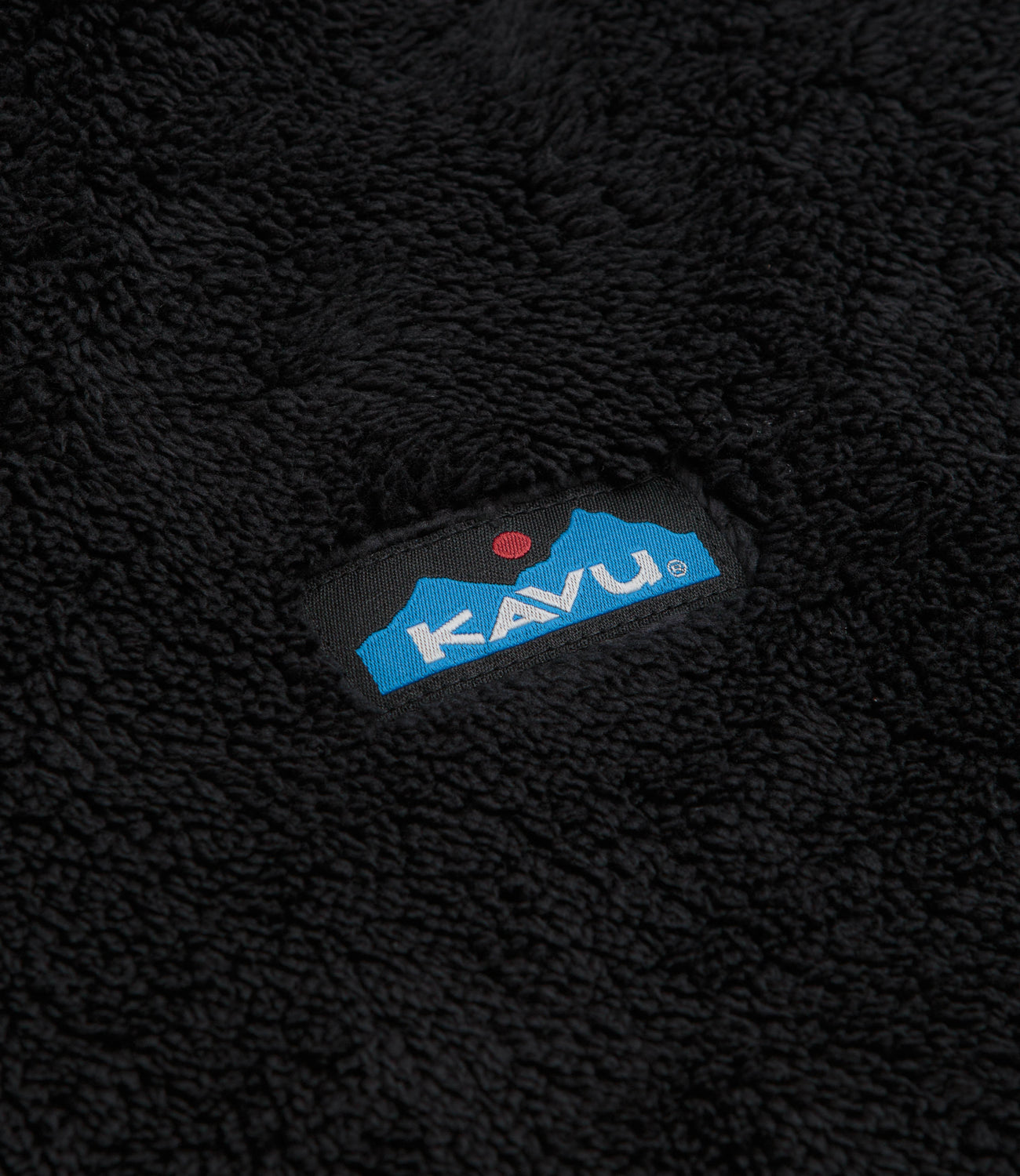 Kavu Womens Moon Ridge Hooded Fleece in Blackout. Relaxed fitting and made from 100% recycled polyester double-sided Sherpa fleece, this Kavu fleece is designed with a panelled hood and a mock neck collar. Featuring a half-length snap fastening, dropped shoulders and a side-entry centre pocket, this black Kavu womens fleece is finished with ribbed cuffs, an elasticated hem and flag label branding.