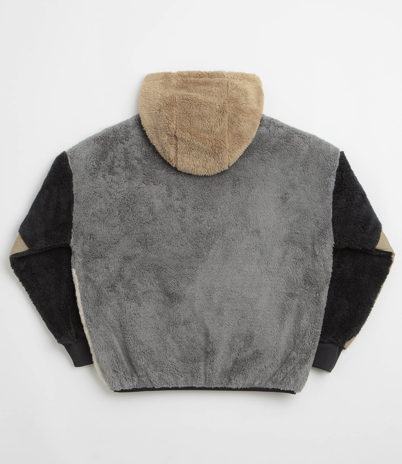 Kavu Womens Moon Ridge Hooded Fleece in Shadow Block. Designed with contrast panelling, this relaxed fitting Kavu fleece is made from 100% recycled polyester double-sided Sherpa. Featuring a panelled hood, a mock neck collar, a half-length snap fastening and dropped shoulders, this black Kavu fleece is finished with a side-entry centre pocket, ribbed cuffs, an elasticated hem and flag label branding.