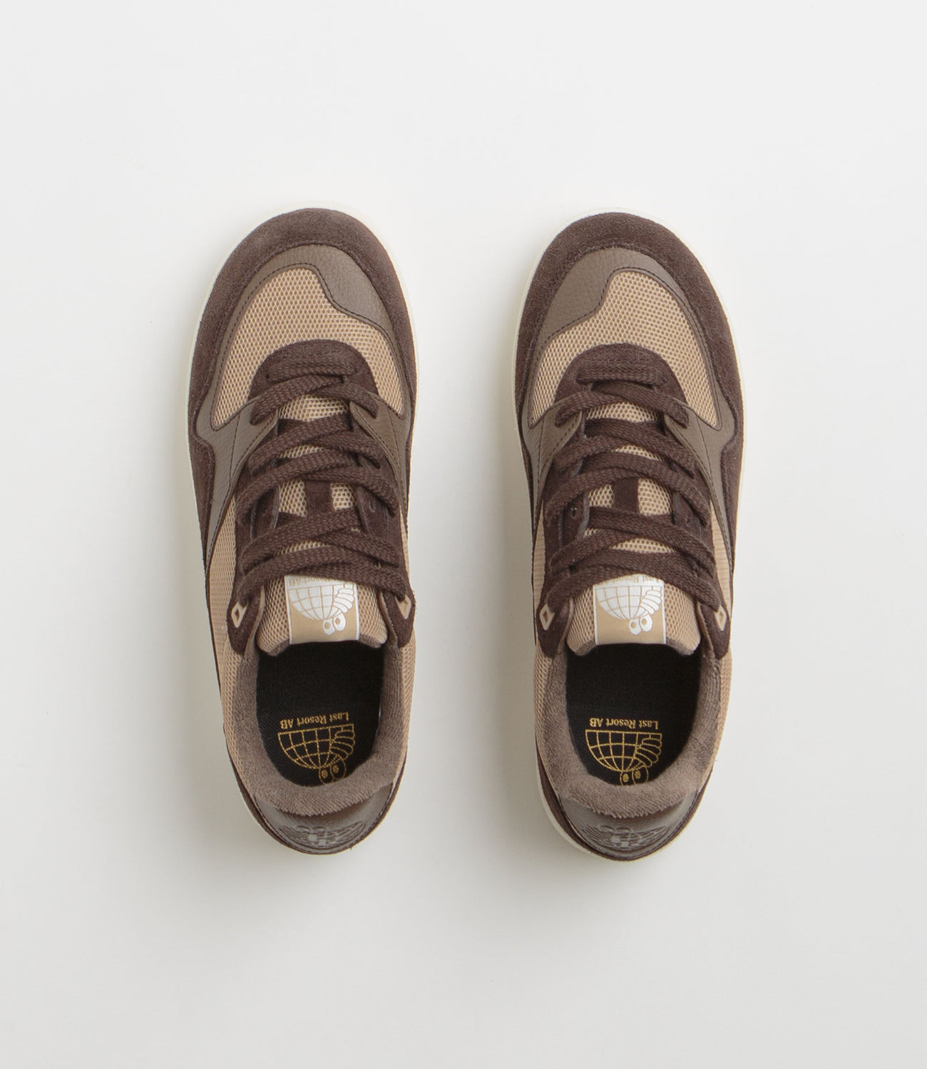 Last Resort AB CM002 Shoes in Pine Cone and White. Designed with panelled suede, leather and mesh uppers, this Last Resort AB CM002 arrives as the brand’s second cupsole sneaker. Featuring a Terry cloth lining, interchangeable laces and an extra curly lock-in lace, this brown CM002 is finished with printed laces, woven tongue labels and a debossed Last Resort AB heel.