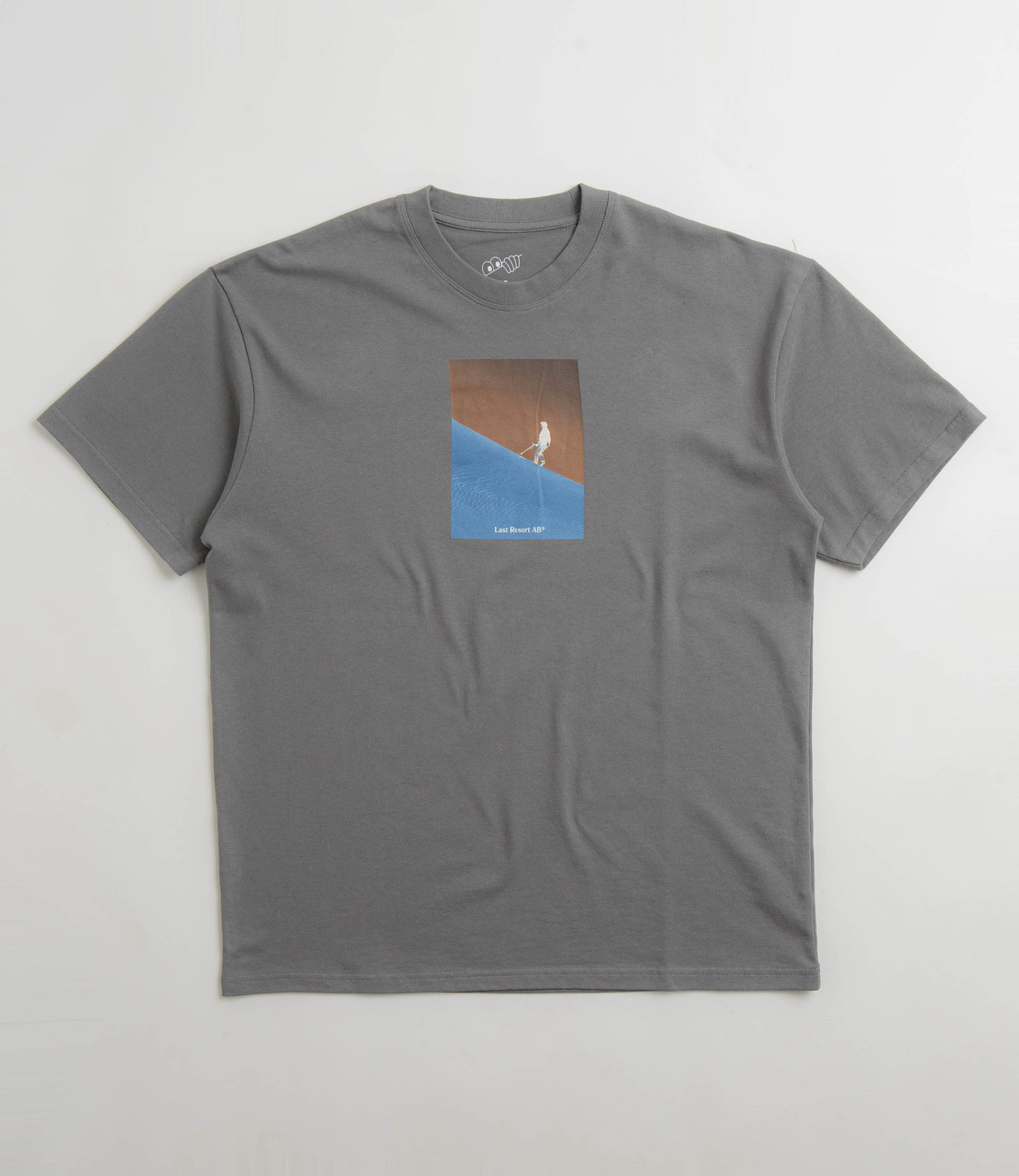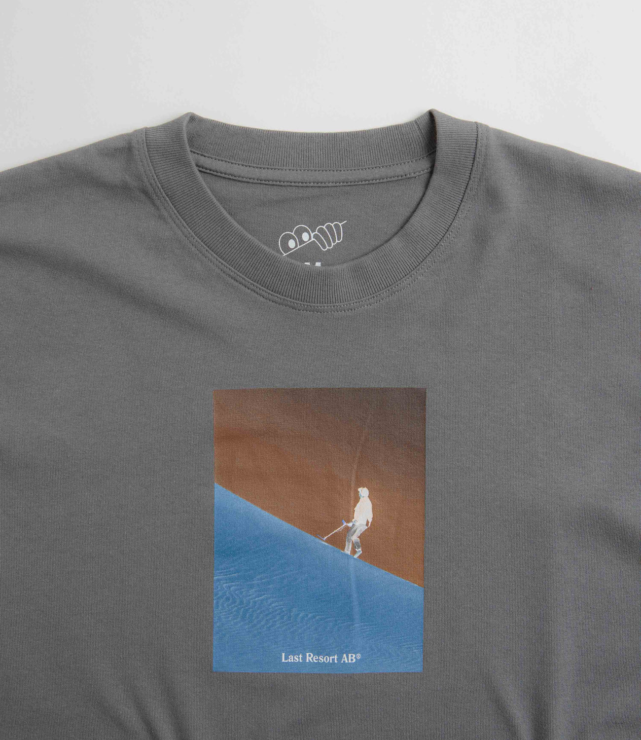 Last Resort AB Dunes T-Shirt in Graphite. Tailored to a regular fitting from 100% cotton, this new season Last Resort AB t-shirt is styled with a flexible rib knit collar and a straight cut hem. Finished with tonal stitched seams and with printed Last Resort AB centre chest artwork.