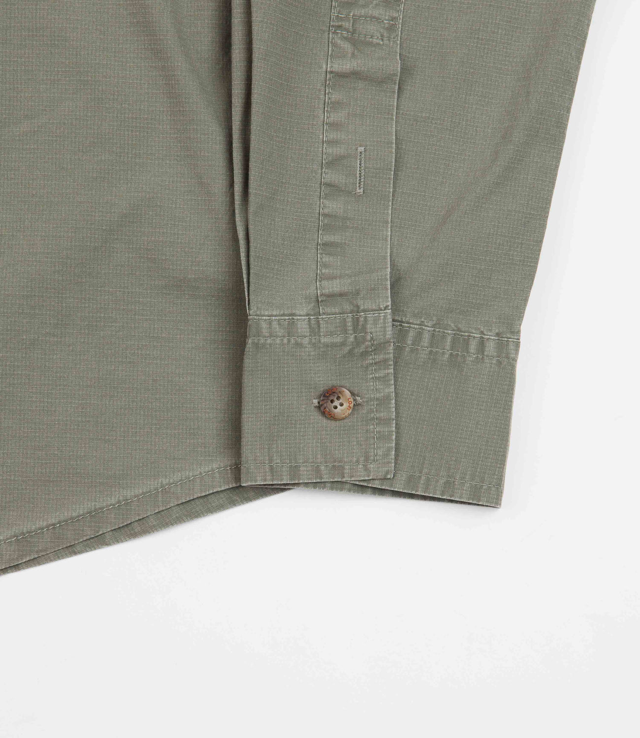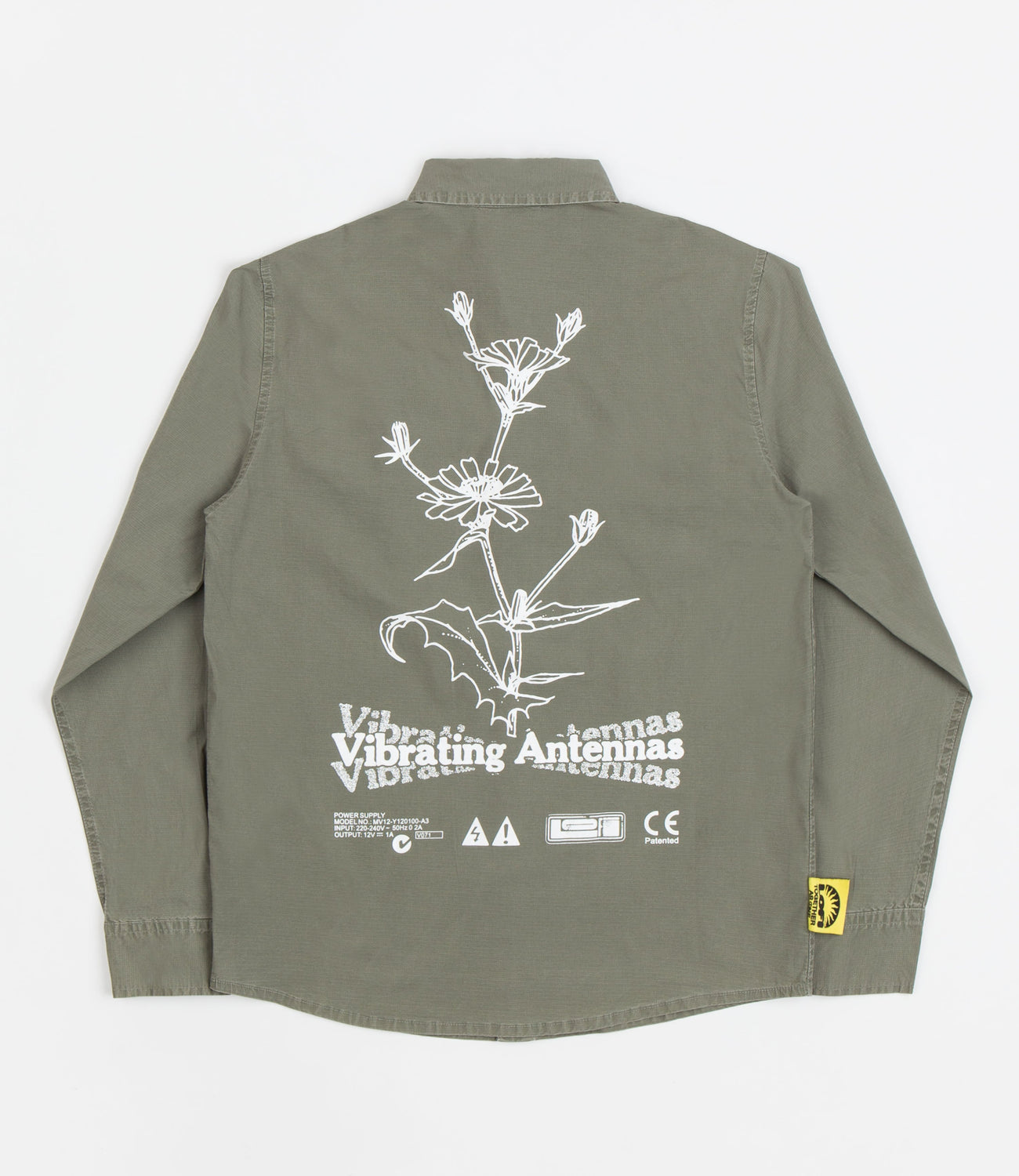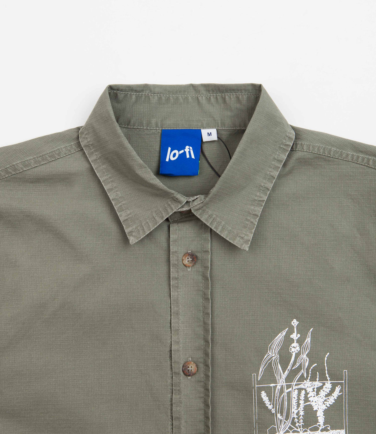Lo-Fi Antenna Ripstop Shirt in Washed Sage. Arriving as part of the brand’s latest collection, this regular fitting Lo-Fi shirt is crafted from 100% washed ripstop. Styled with a full length button fastening, a curved hemline, adjustable cuffs and a classic stand collar, this sage green shirt is finished with a woven right sleeve flag label and printed ‘Vibrating Antenna’ graphics displayed across both the left chest and reverse.
