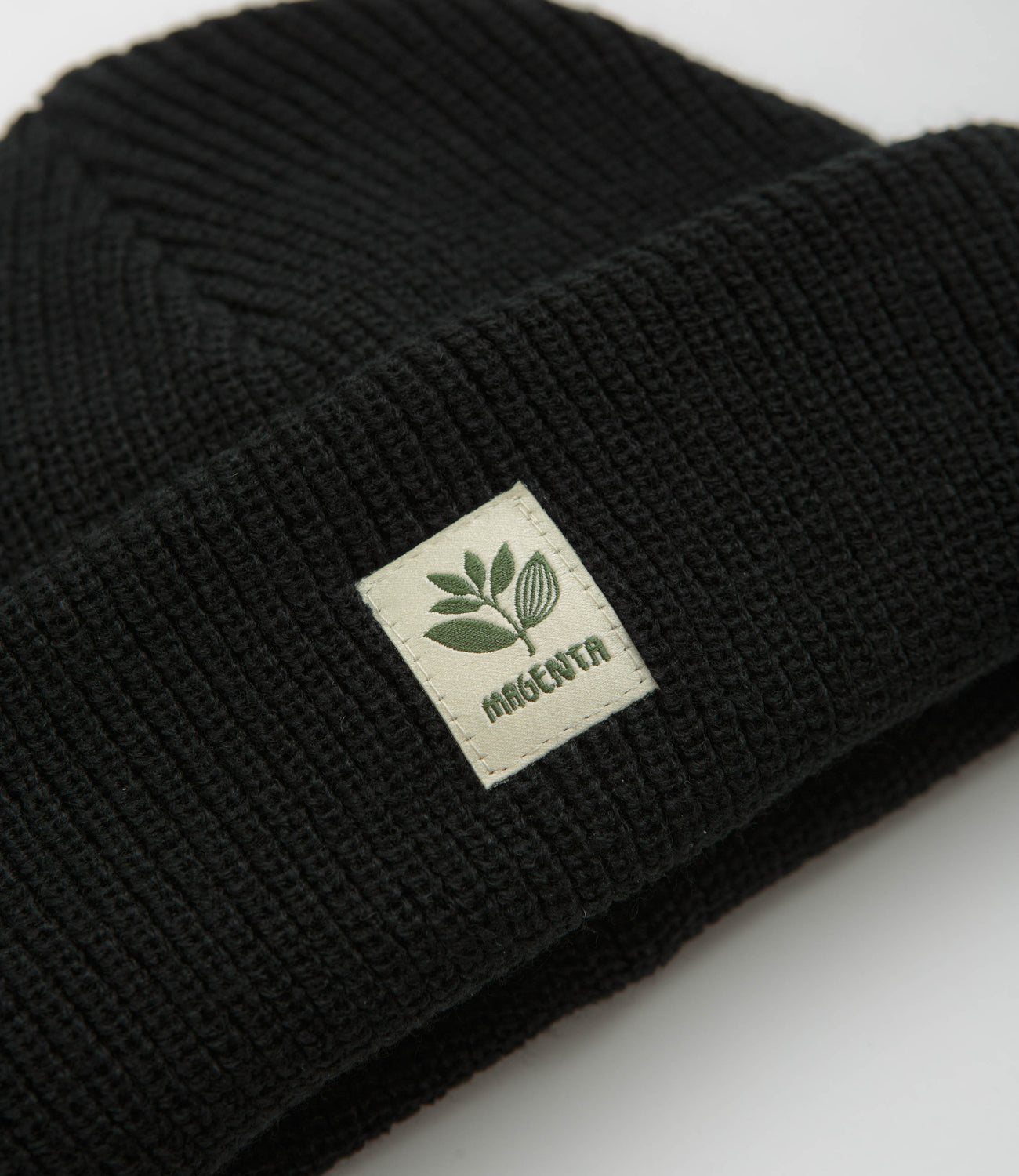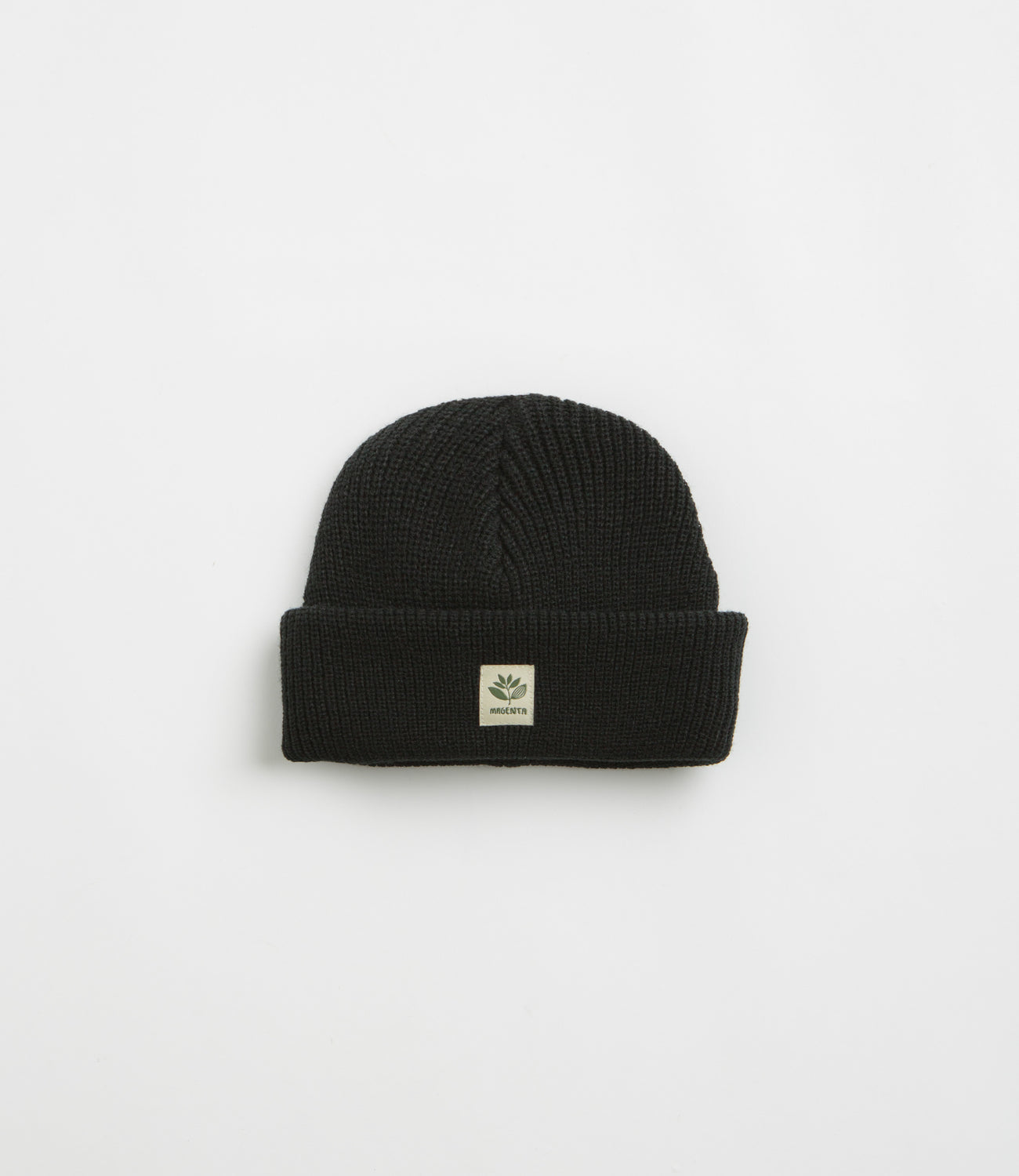 Magenta Fam Beanie in Black. Single sized and made from 100% acrylic, this rib knit Magenta beanie is designed with a stretchy rib knit face. Featuring tonal stitched seams and an adjustable turn-up cuff, this black Magenta beanie is finished with an embroidered plant logo crown patch.