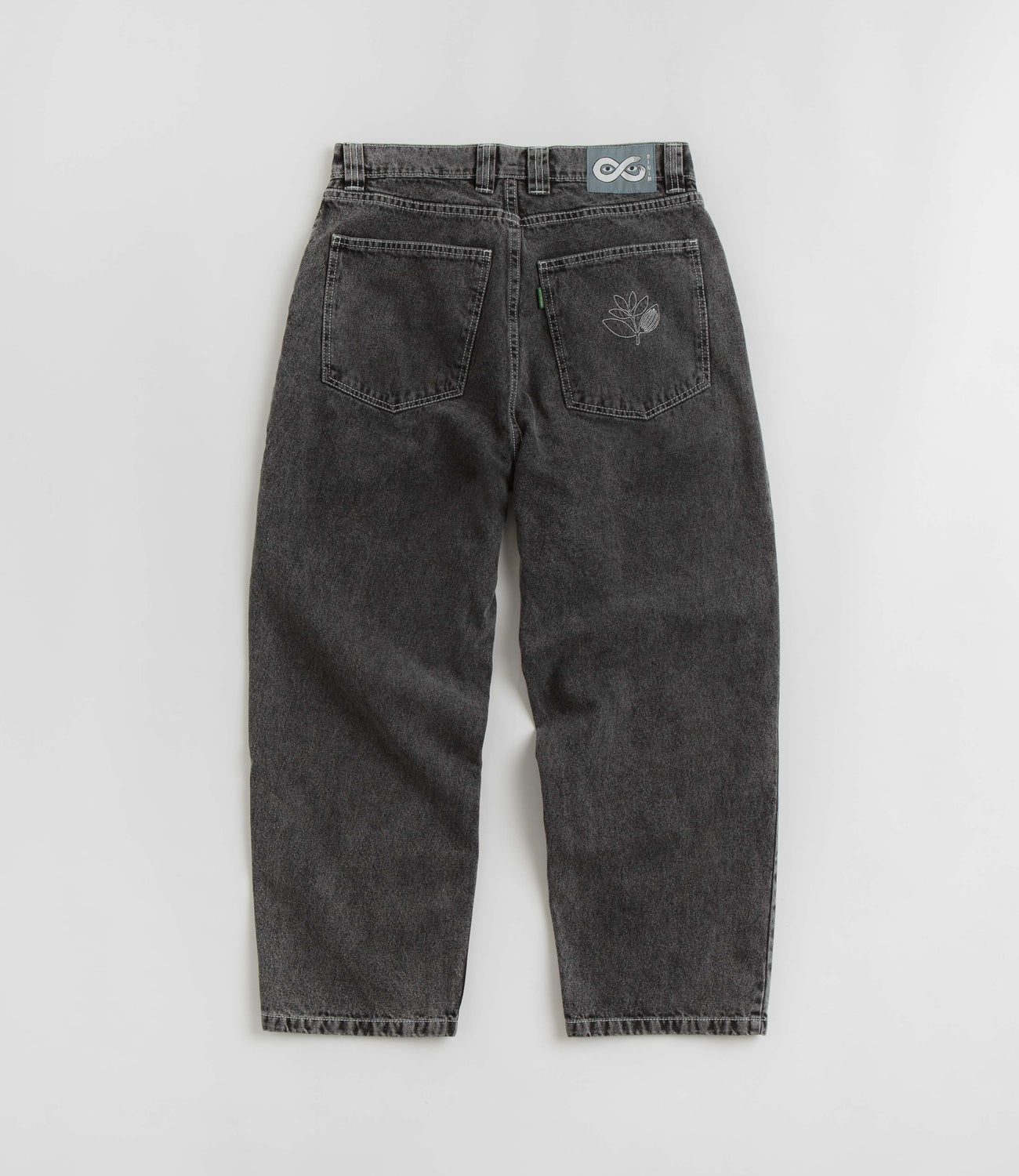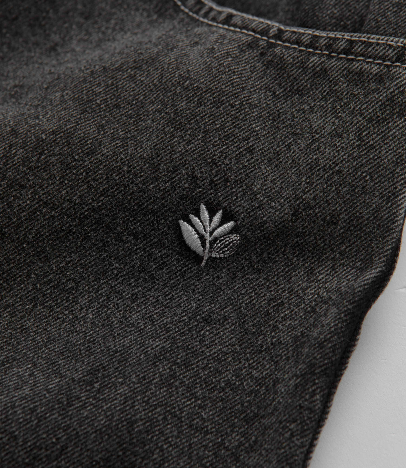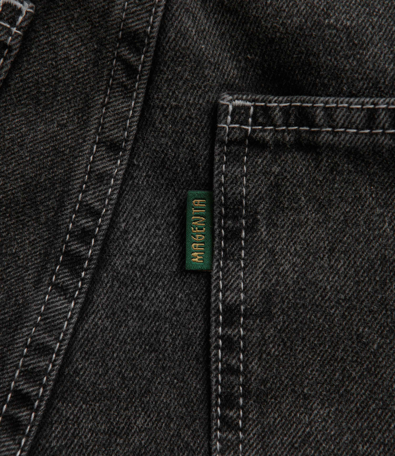 Magenta OG Stitch Jeans in Distressed Black Denim. Made from 100% cotton denim with contrast stitching, these extra baggy Magenta jeans are designed with a single button secured zipper fly and an embroidered coin pocket. Finished in a shade of distressed black with two front pockets, two rear pockets, embroidered logo branding and with an OG denim paper tag.