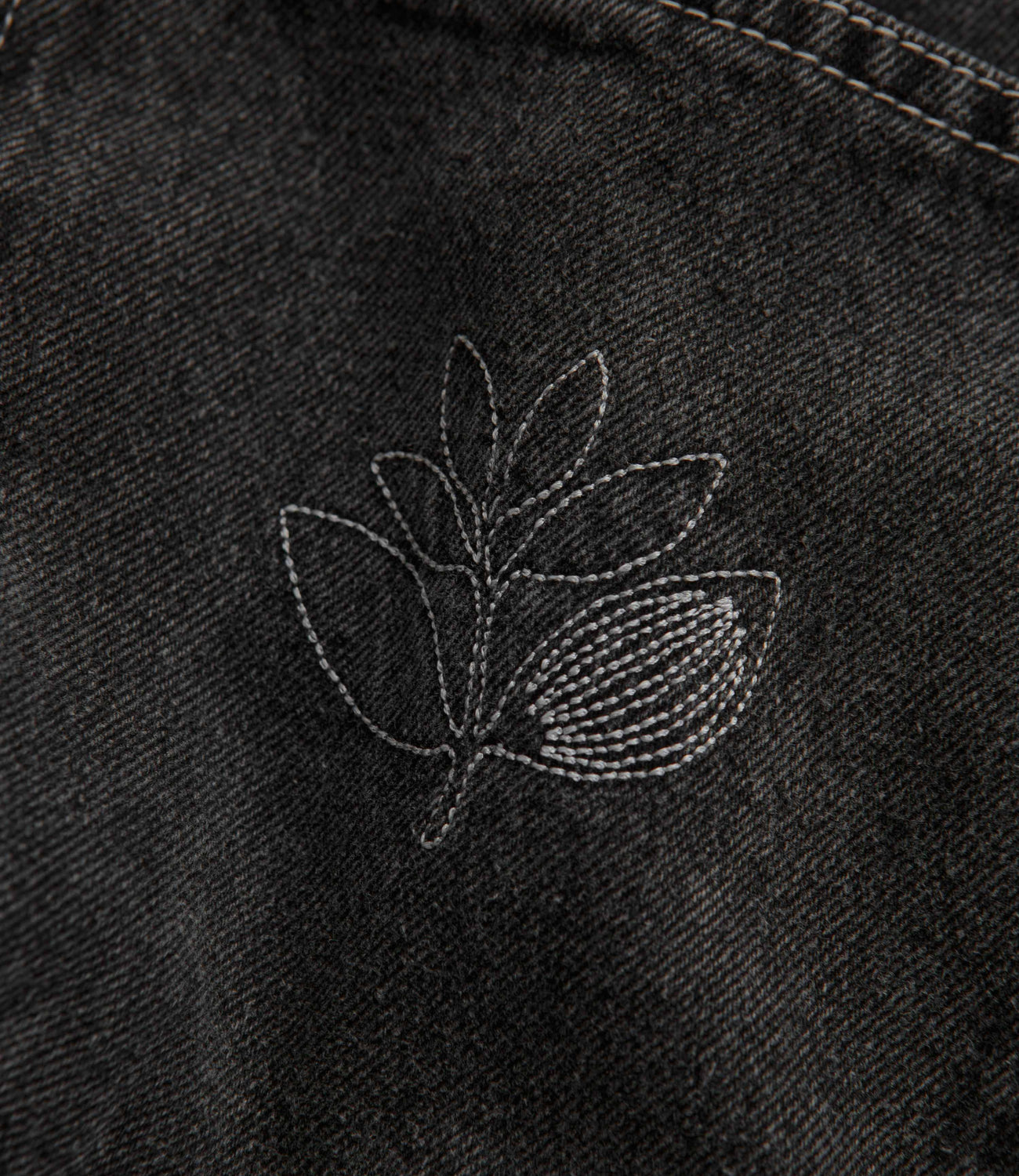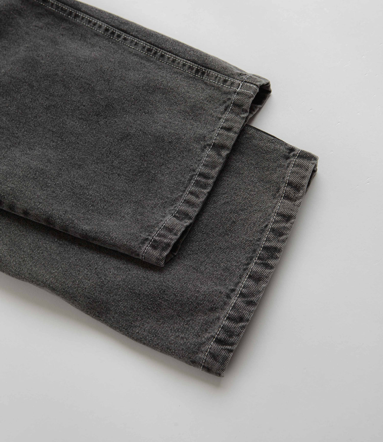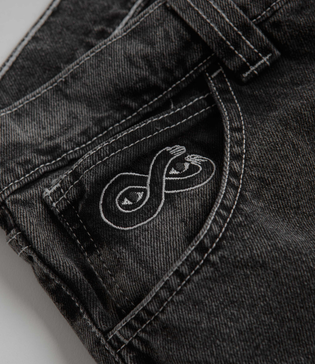 Magenta OG Stitch Jeans in Distressed Black Denim. Made from 100% cotton denim with contrast stitching, these extra baggy Magenta jeans are designed with a single button secured zipper fly and an embroidered coin pocket. Finished in a shade of distressed black with two front pockets, two rear pockets, embroidered logo branding and with an OG denim paper tag.