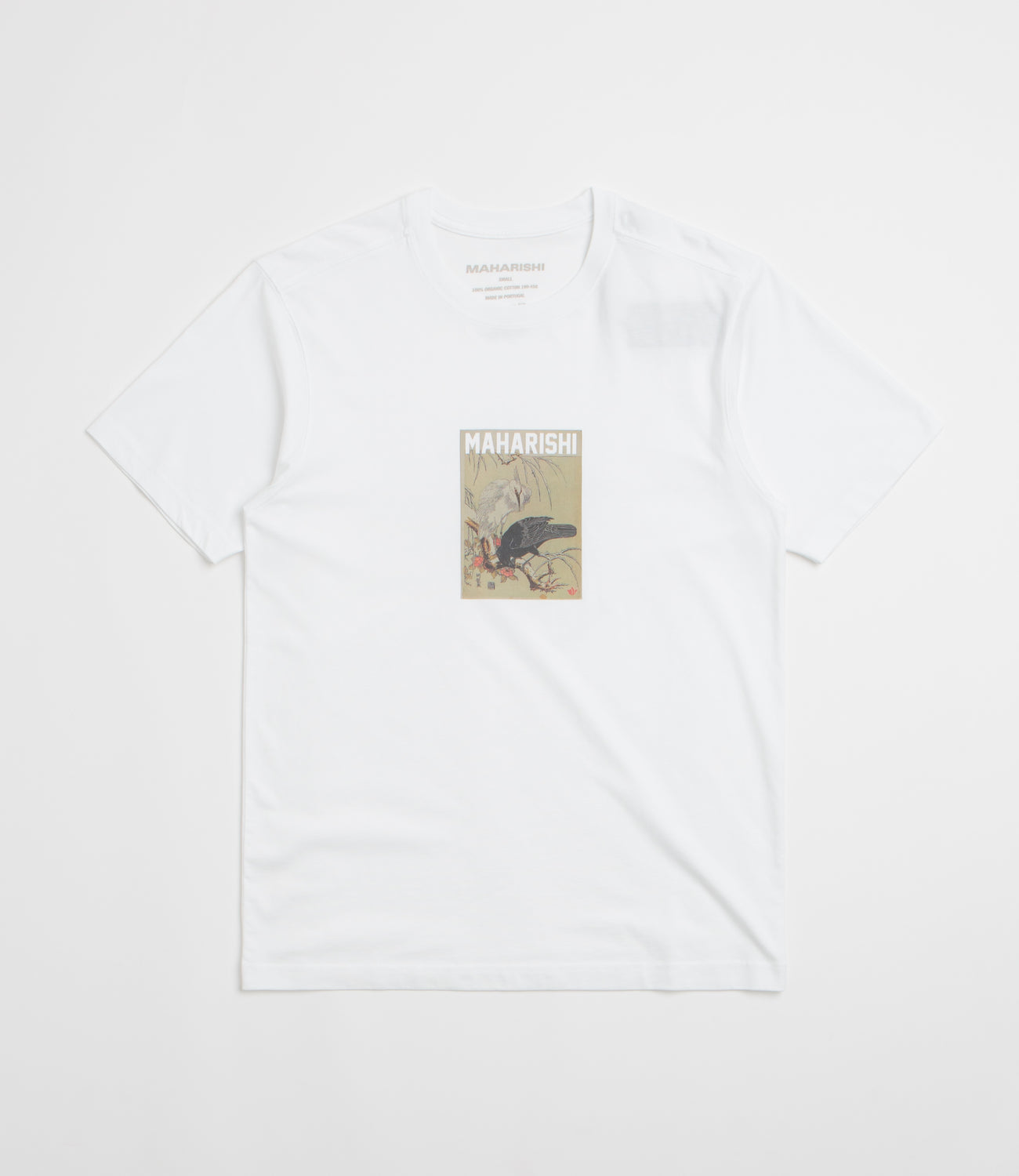 Maharishi Black Crow White Heron T-Shirt in White. Relaxed fitting, this Maharishi t-shirt is crafted from 100% organic cotton. Inspired by Japanese symbolism with a straight hem and printed artwork by Koryusai Isoda.