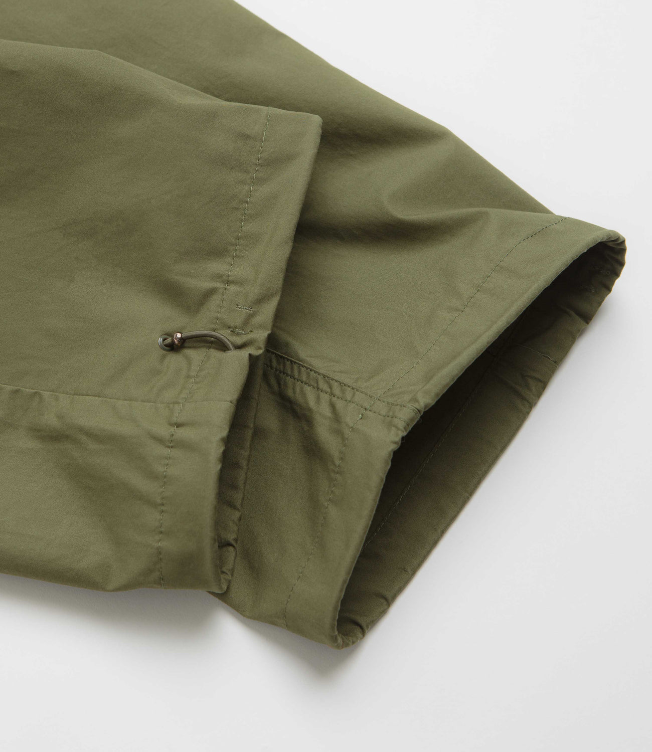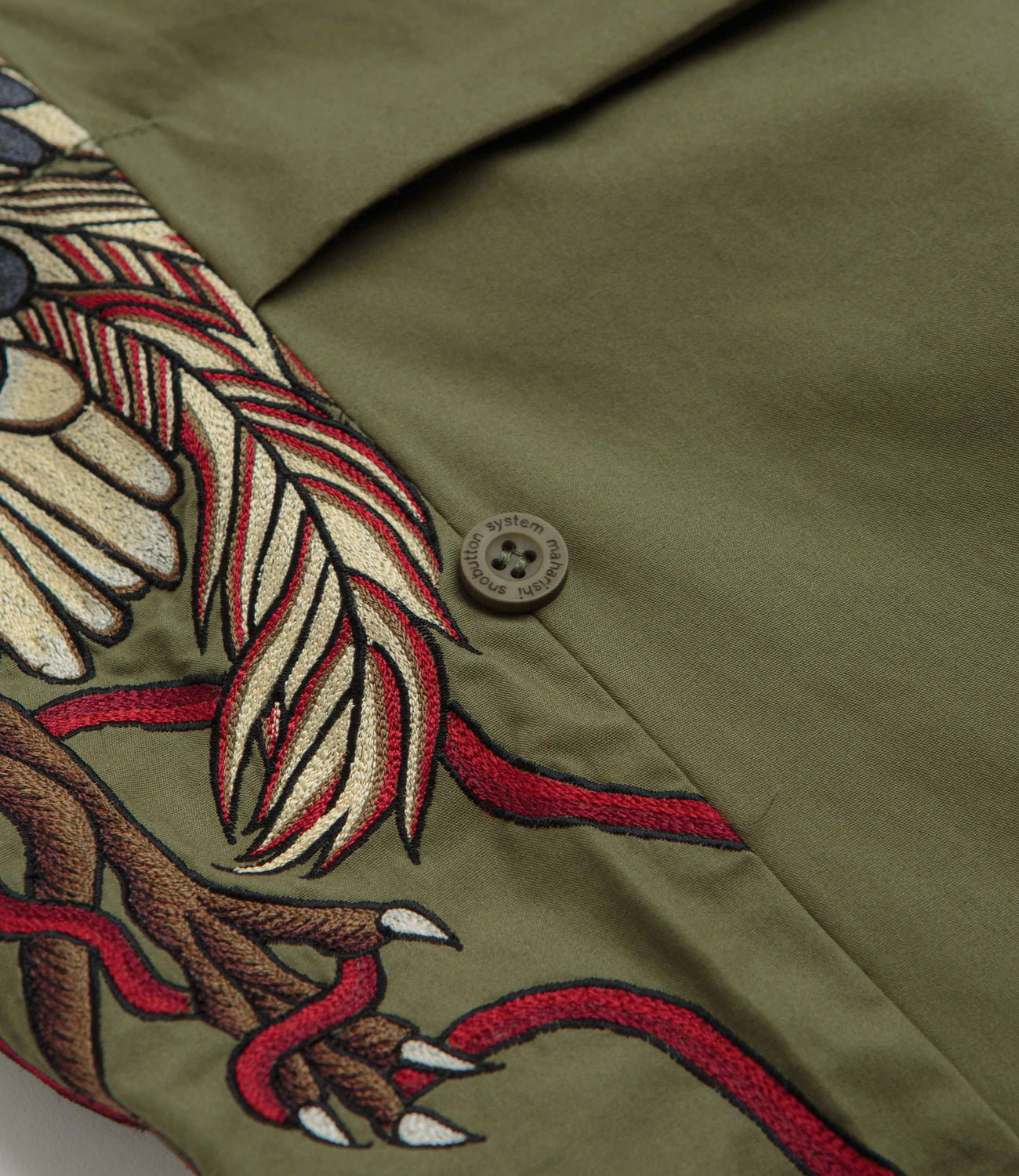 Maharishi Crow & Heron Loose Snopants in Olive. Loose fitting and designed to be converted to shorts through the Snobutton® fastening, these Maharishi Snopants are crafted from 100% organic cotton poplin. Featuring an adjustable Snocords® waistband, darted knee details and adjustable Snocords® cuffs, these olive green Maharishi pants are finished with Riri Temple Ball® technology, three side pockets, two rear pockets, an ankle utility pocket and hand-embroidered artwork.
