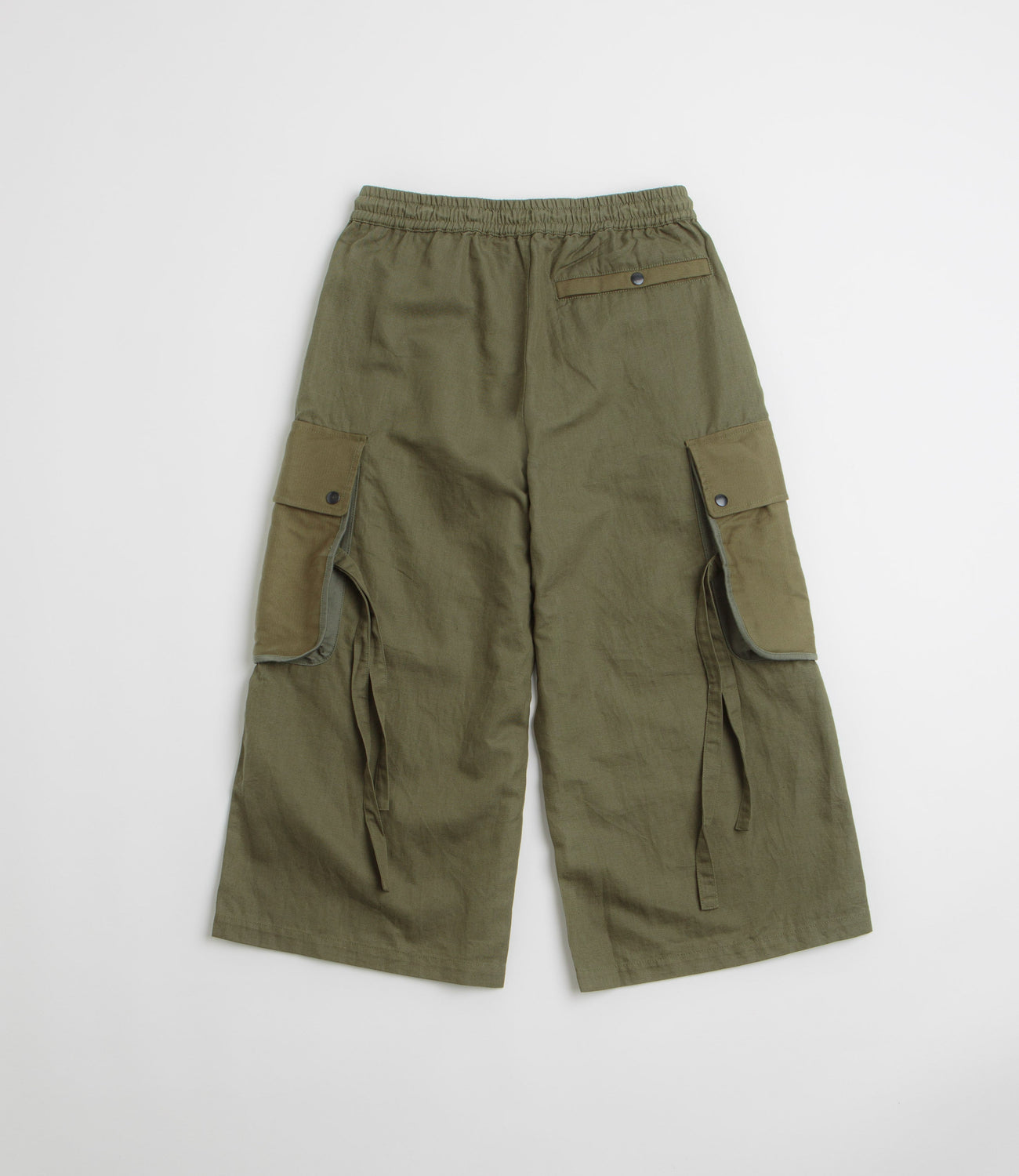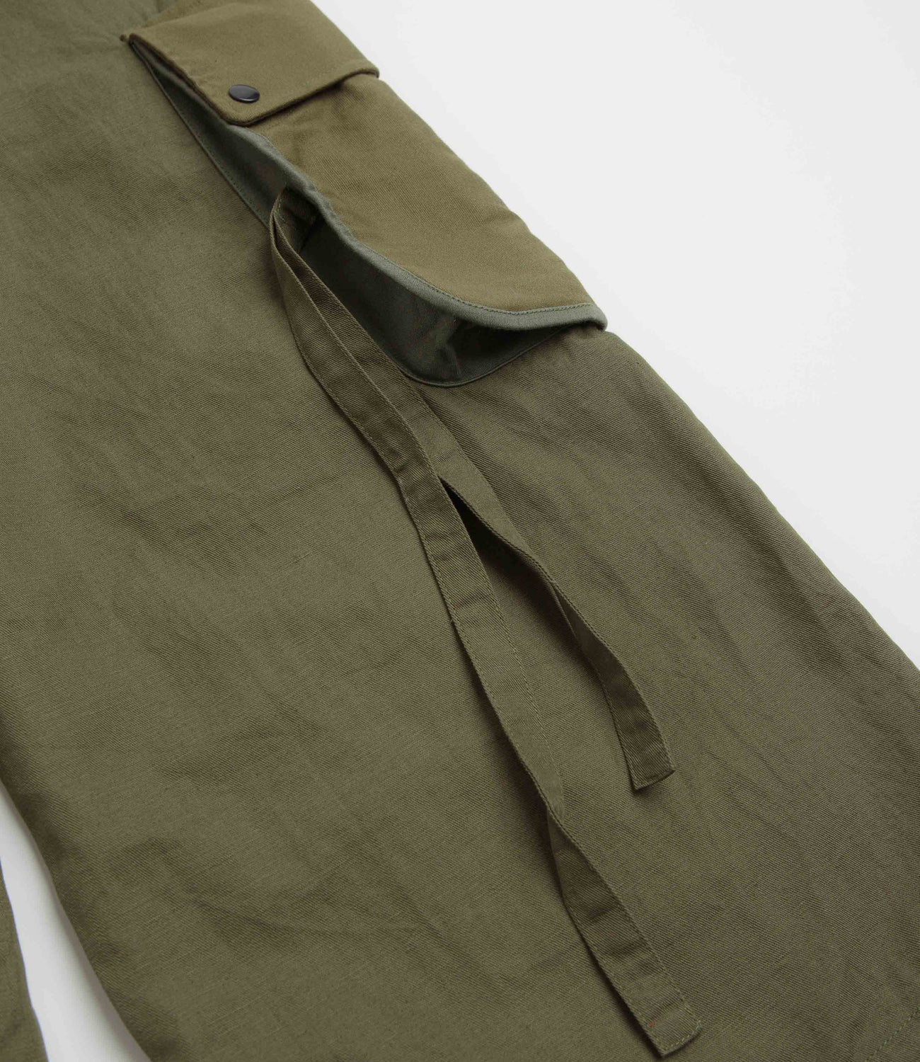 Maharishi M42 Hakama Cropped Track Pants in Olive. Inspired by US Army M65 styles with a cropped length, these Maharishi track pants are crafted from 100% cotton. Featuring an adjustable drawstring waistband, two side pockets and a single rear pocket, these loose fit olive green Maharishi pants are finished with leg strap secured side cargo pockets.