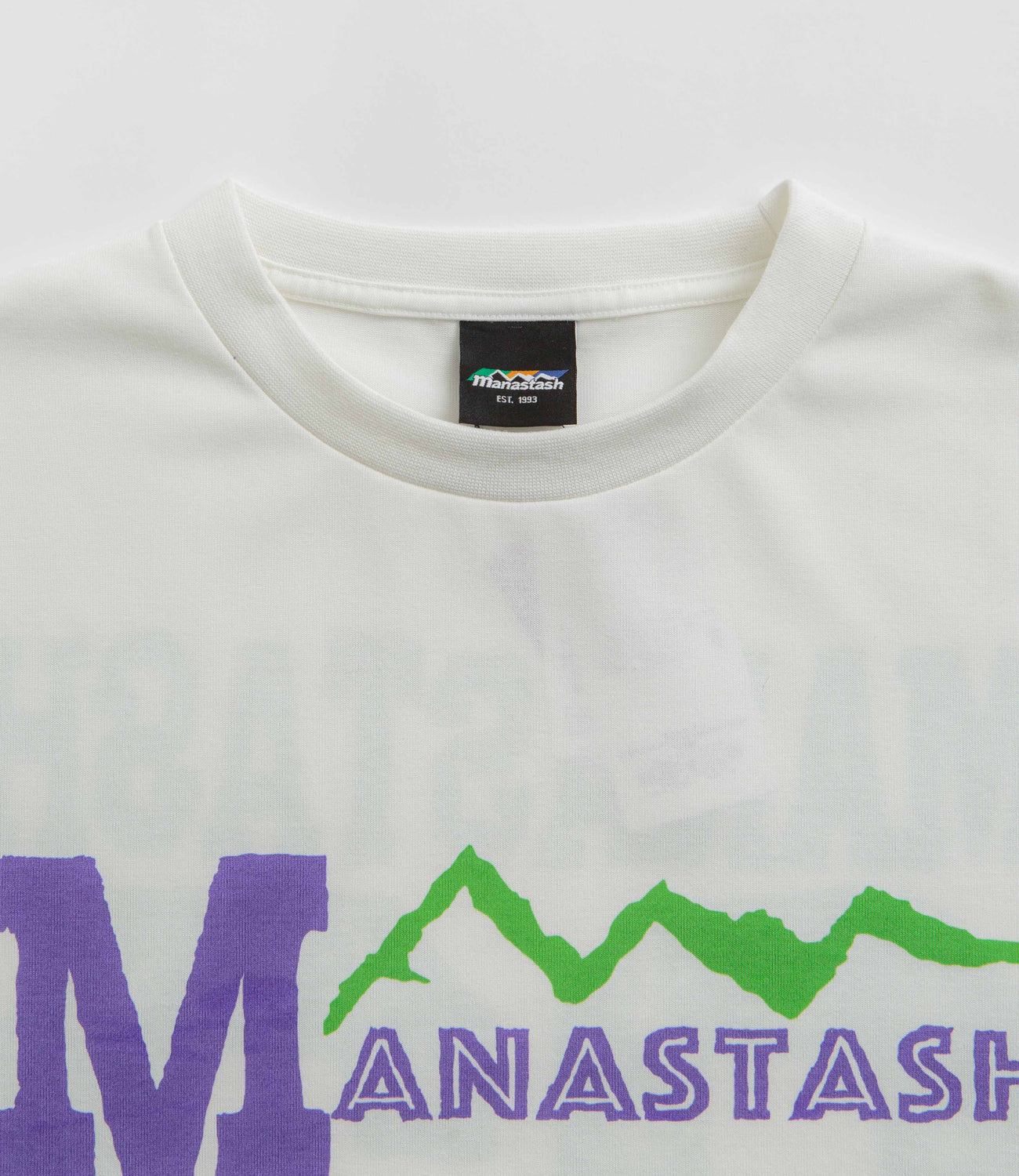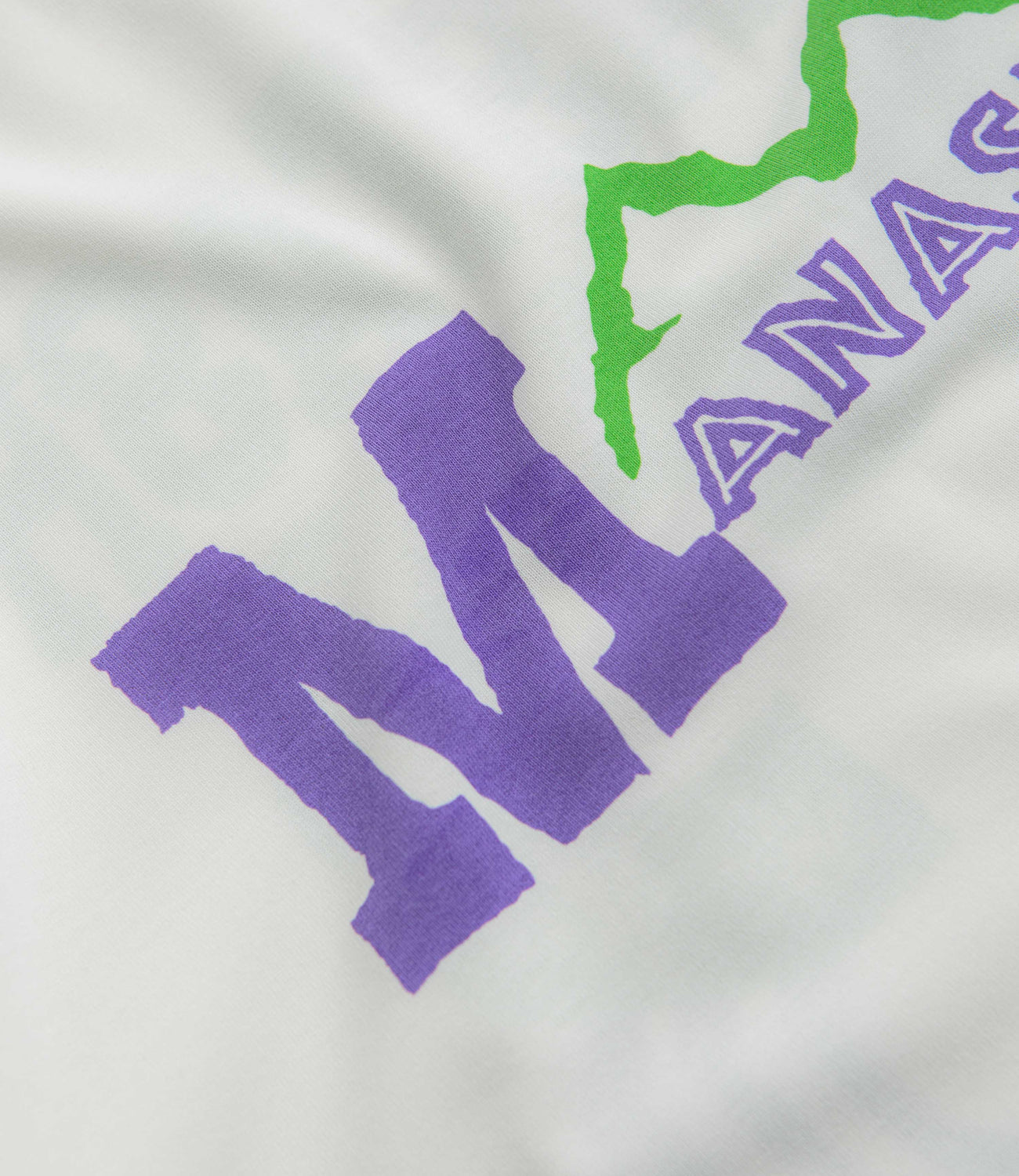 Manastash 93 Poly T-Shirt in White. Crafted from 100% recycled polyester, this loose fitting Manastash t-shirt is designed with a classic rib knit collar and with a reinforced hem. Finished in a shade of white with a printed front and rear graphics.