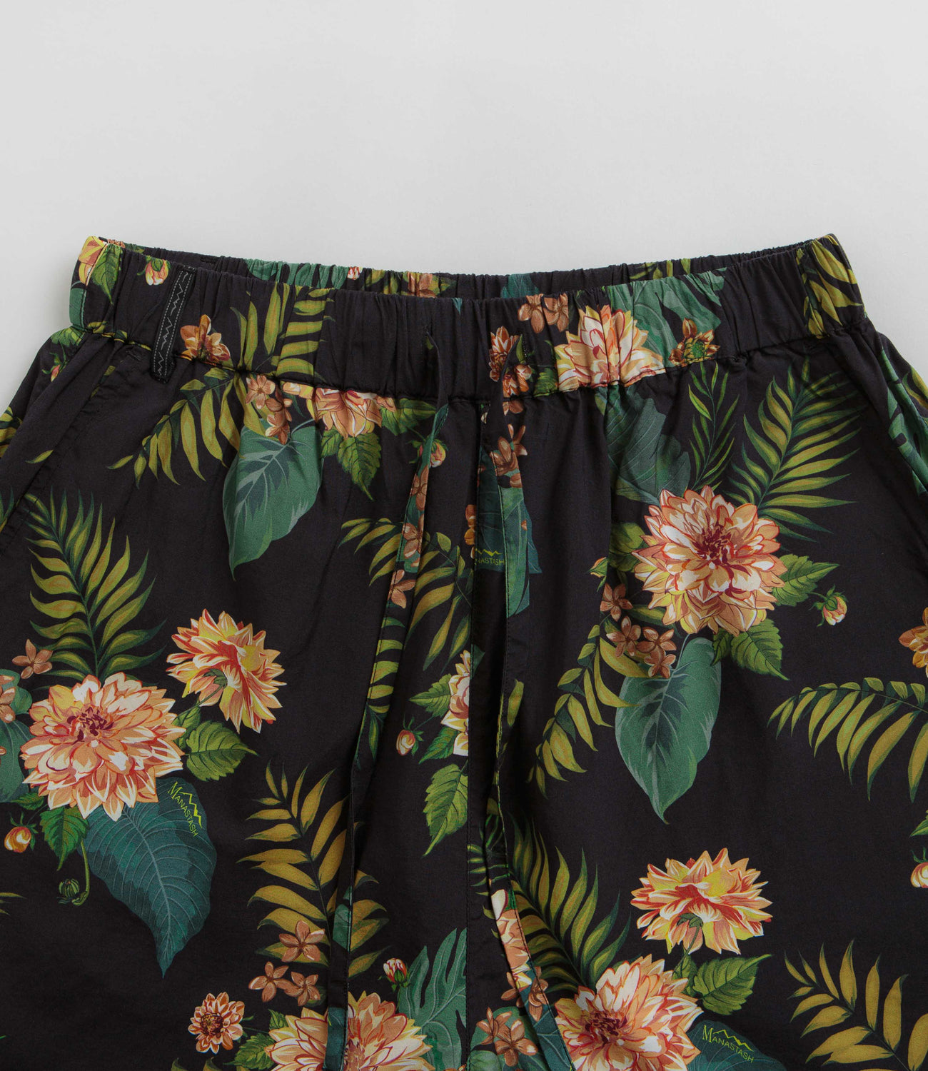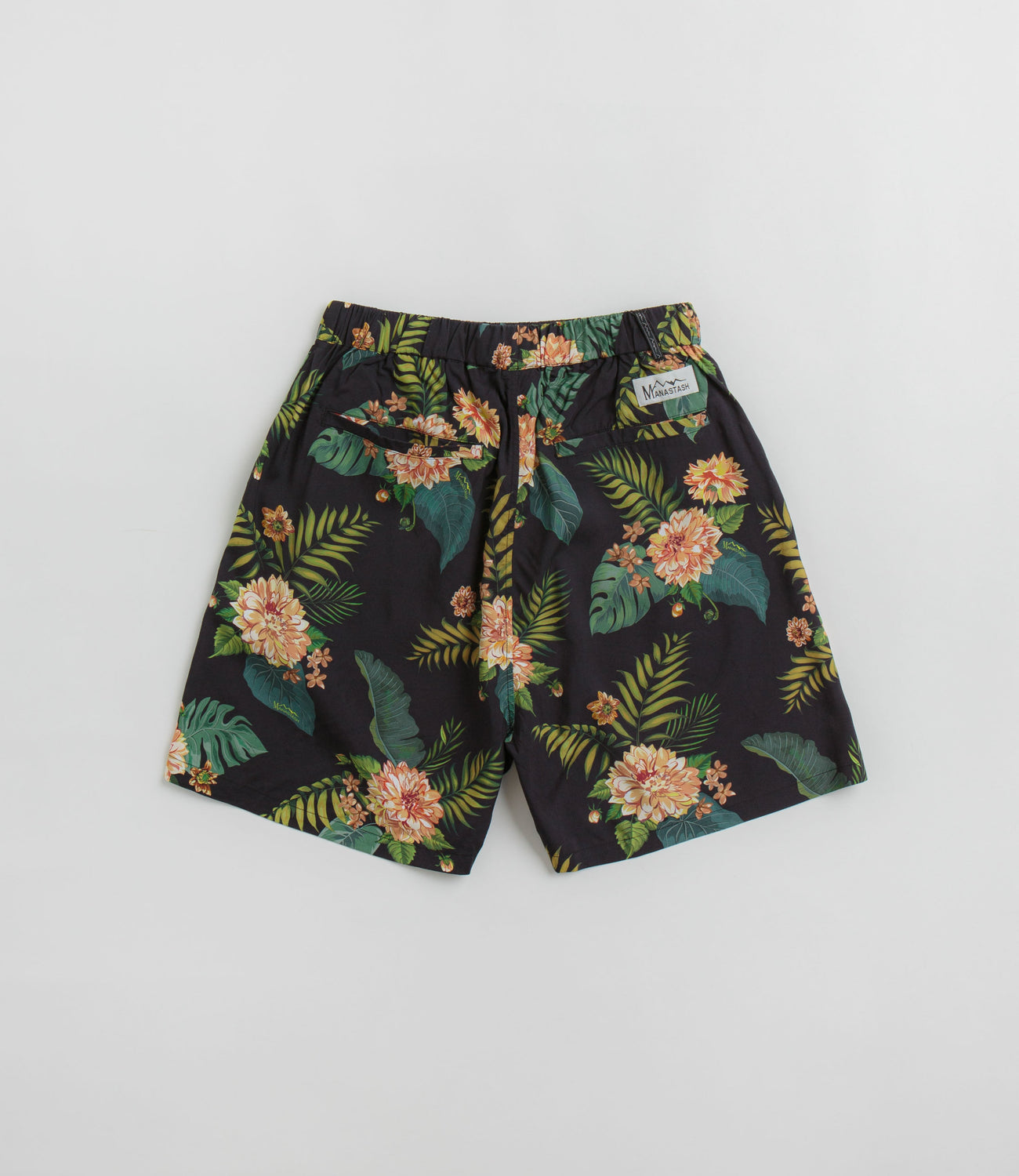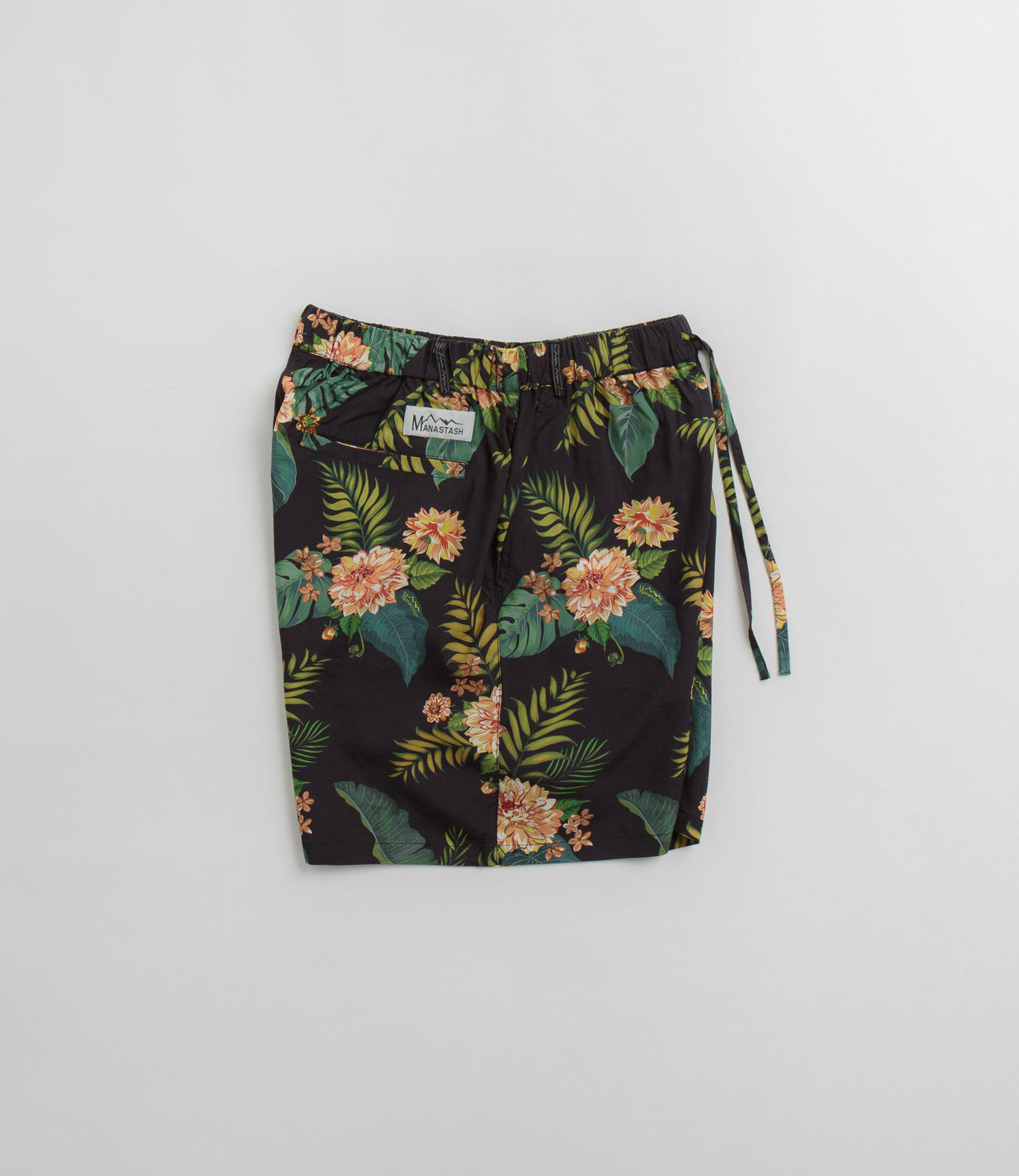 Manastash Manaloha Shorts in Navy. Crafted from 100% rayon, these above-knee Manastash shorts are designed with an all-over floral print. Featuring a woven elastic waistband with an external drawstring adjuster, these navy floral Manastash shorts are finished with two side pockets.