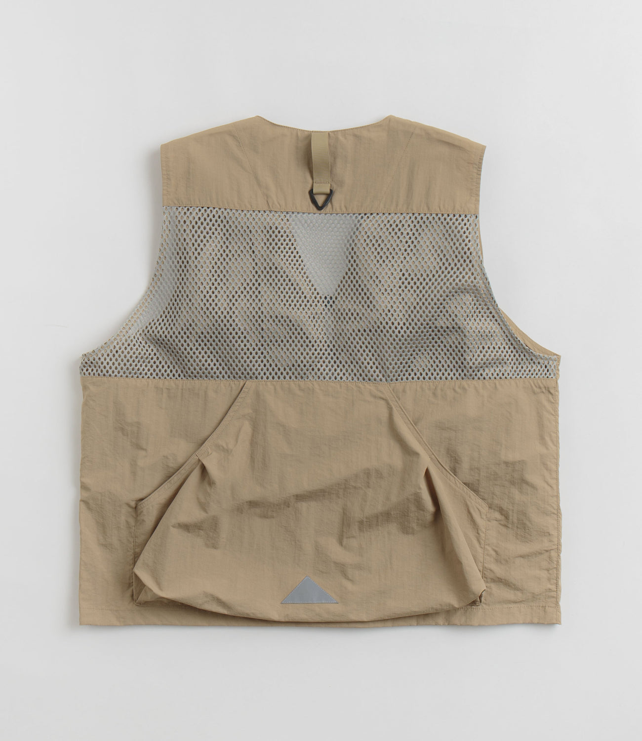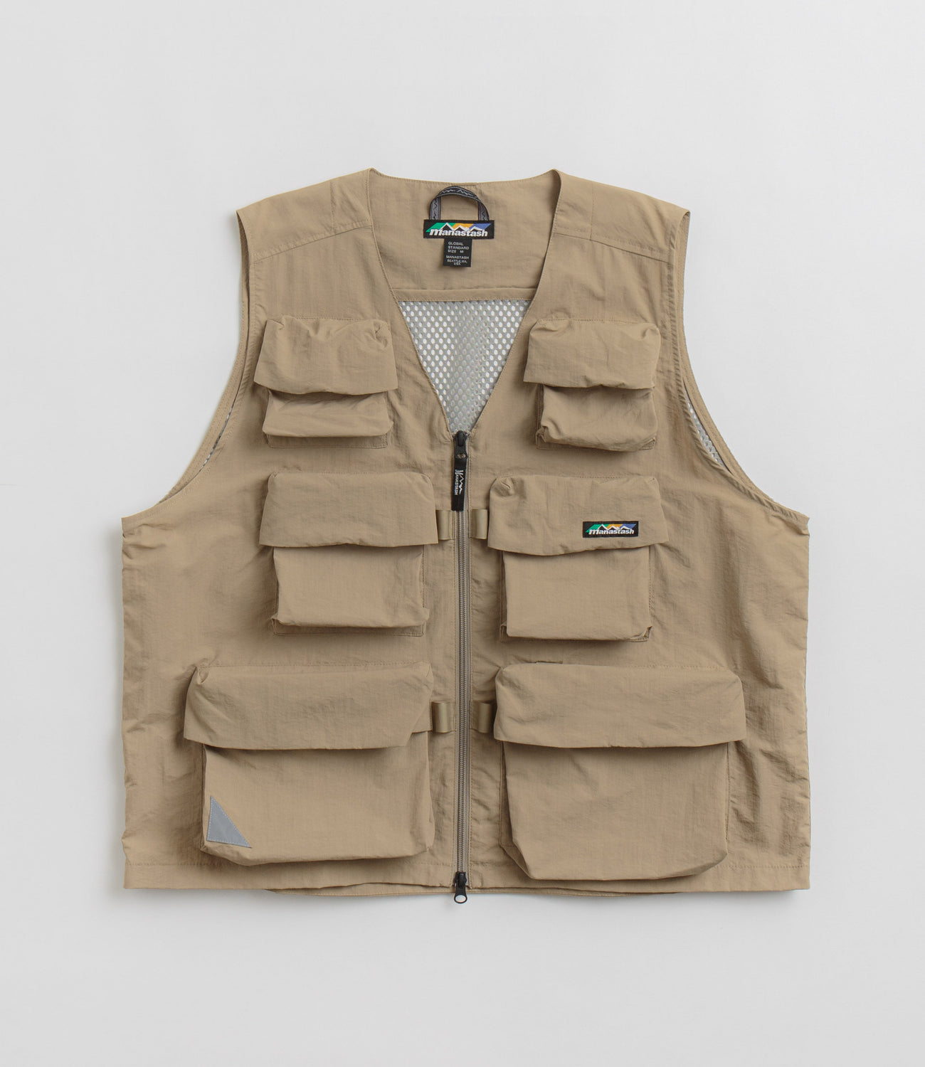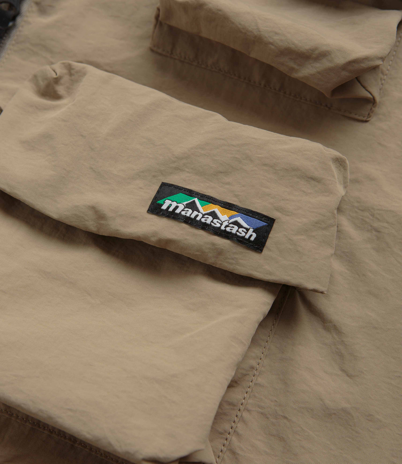Manastash River Vest in Sand. Tailored to a regular fitting from 100% nylon, this sleeveless Manastash vest is designed with a two-way zipper fastening. Featuring woven webbing loops and a D-ring attachment point, this khaki Manastash vest is finished with six 3D cargo pockets and with woven flag label branding.