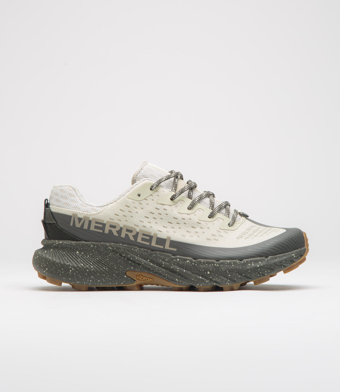 Merrell Agility Peak 5 Shoes in Stucco and Beluga. Built for all-terrains and weather conditions, this Merrell Agility Peak 5 is designed with a TPU and engineered mesh upper. Featuring a protective toe cap, NXT-treated anti-odour technology, a FLEXconnect® midsole and an EVA foam footbed, this beige black Merrell Agility Peak 5 also features Rock Plate inner protection. Finished with a gaiter D-ring, a Vibram® MegaGrip® outsole, printed branding and external rear sling locks.