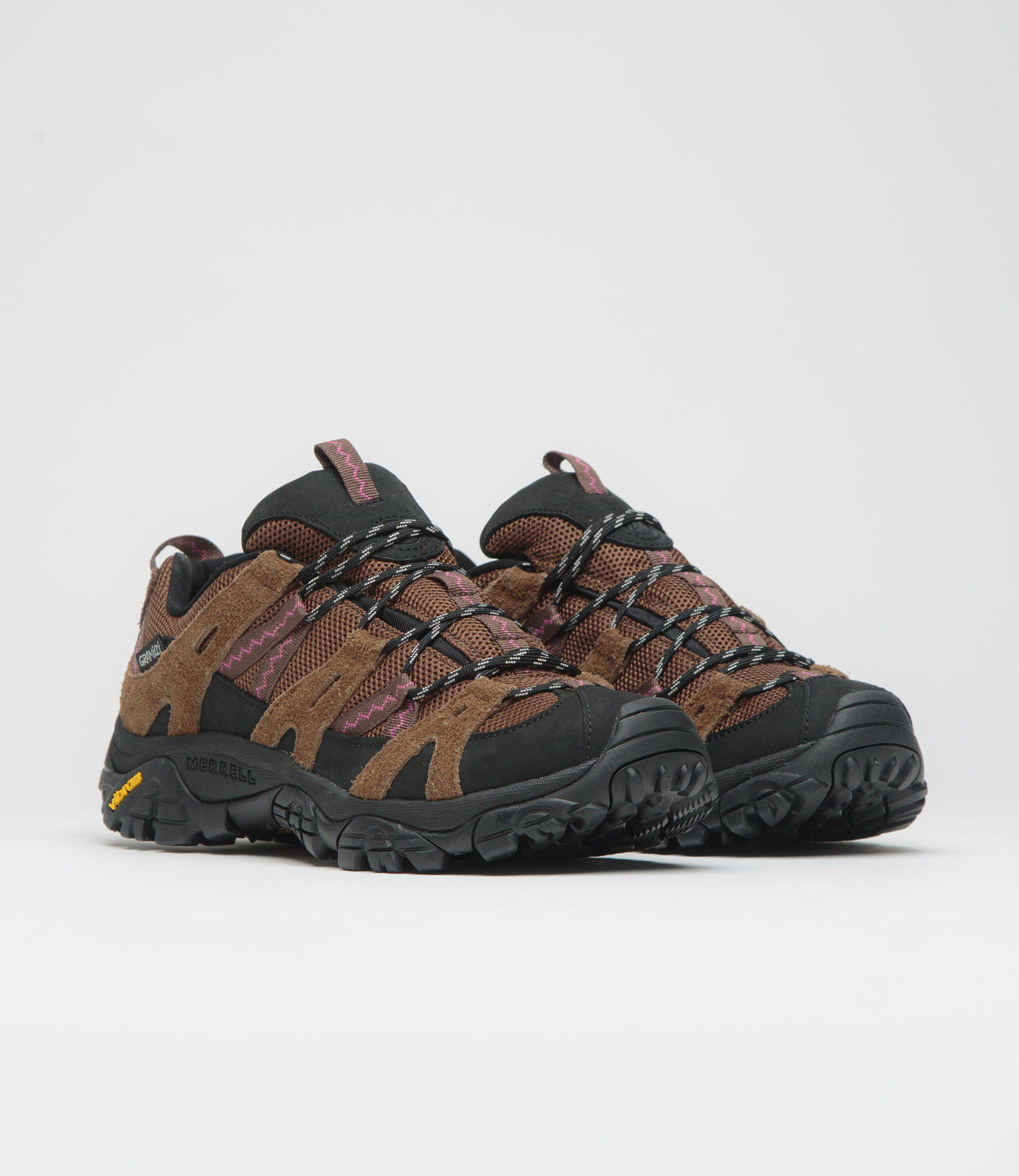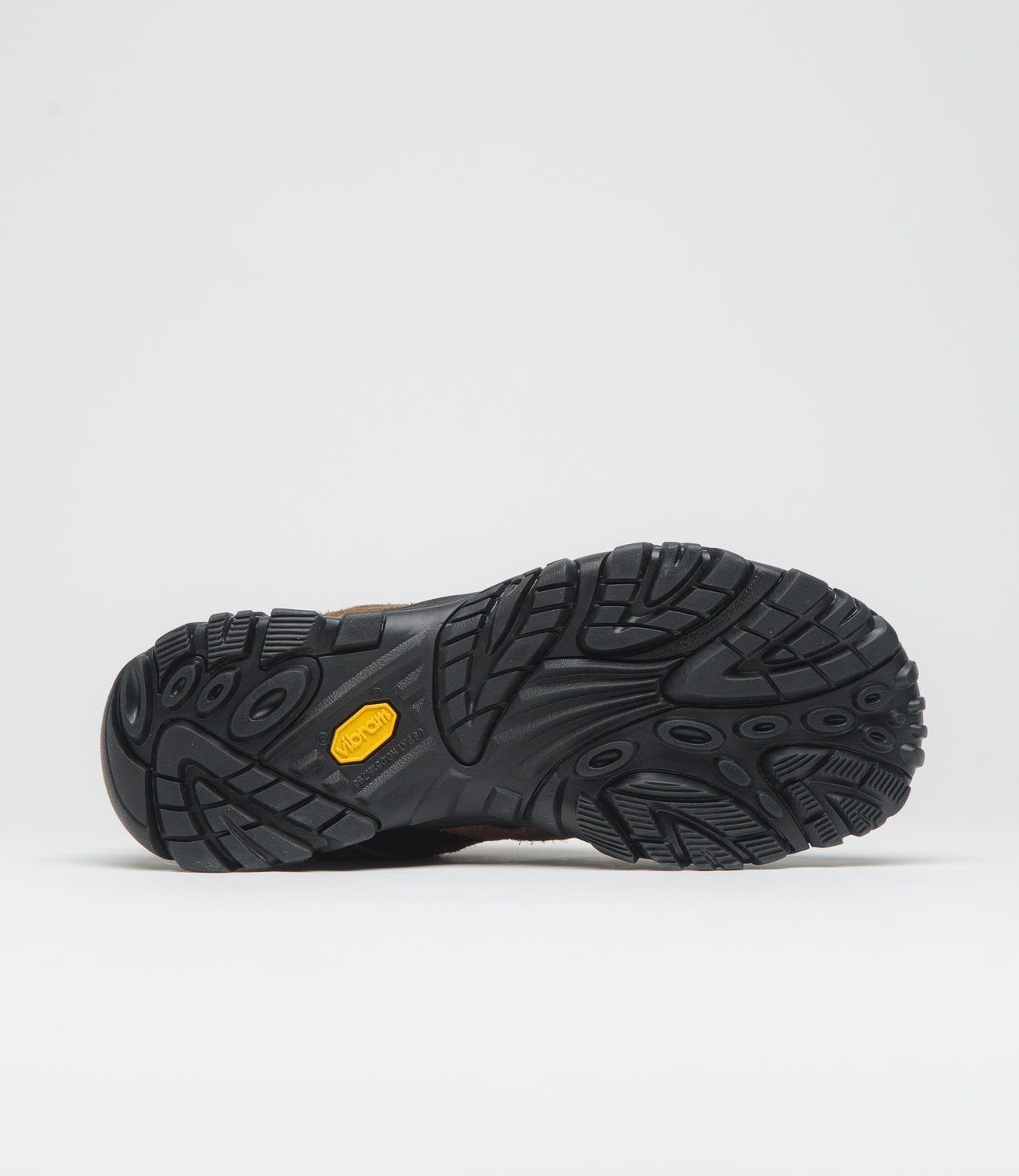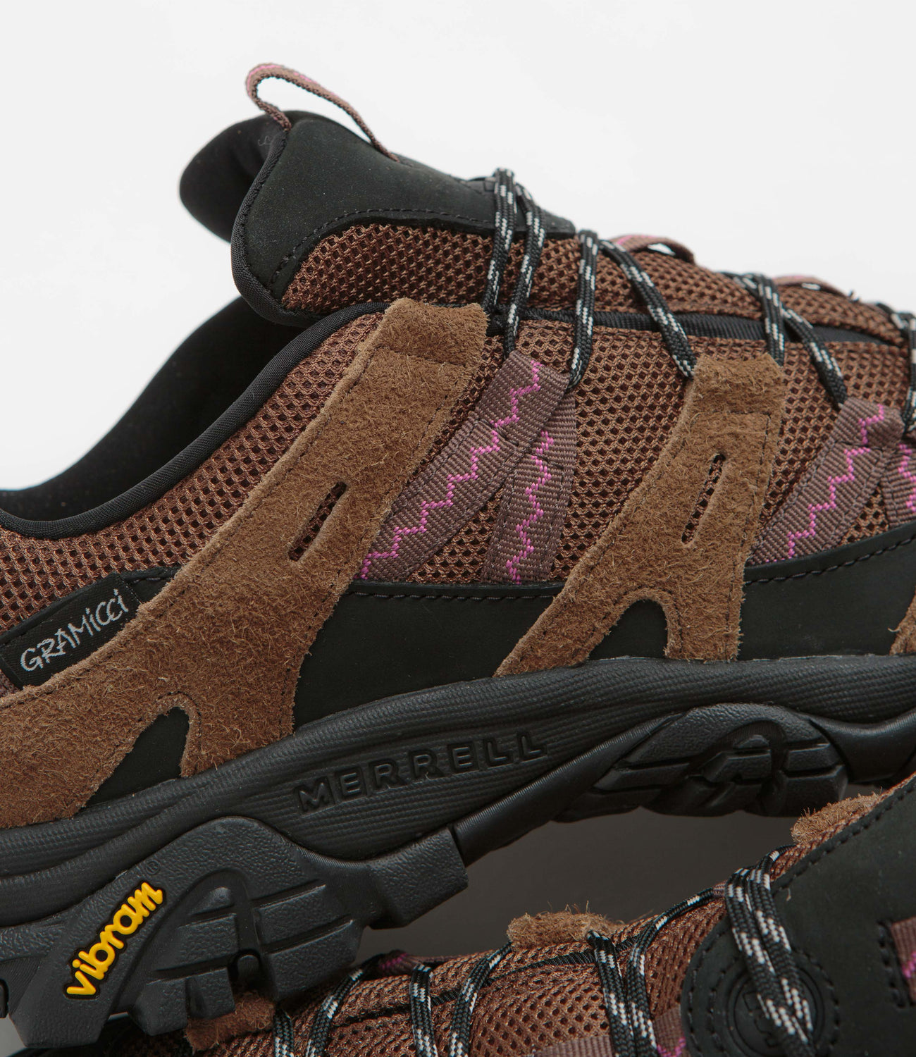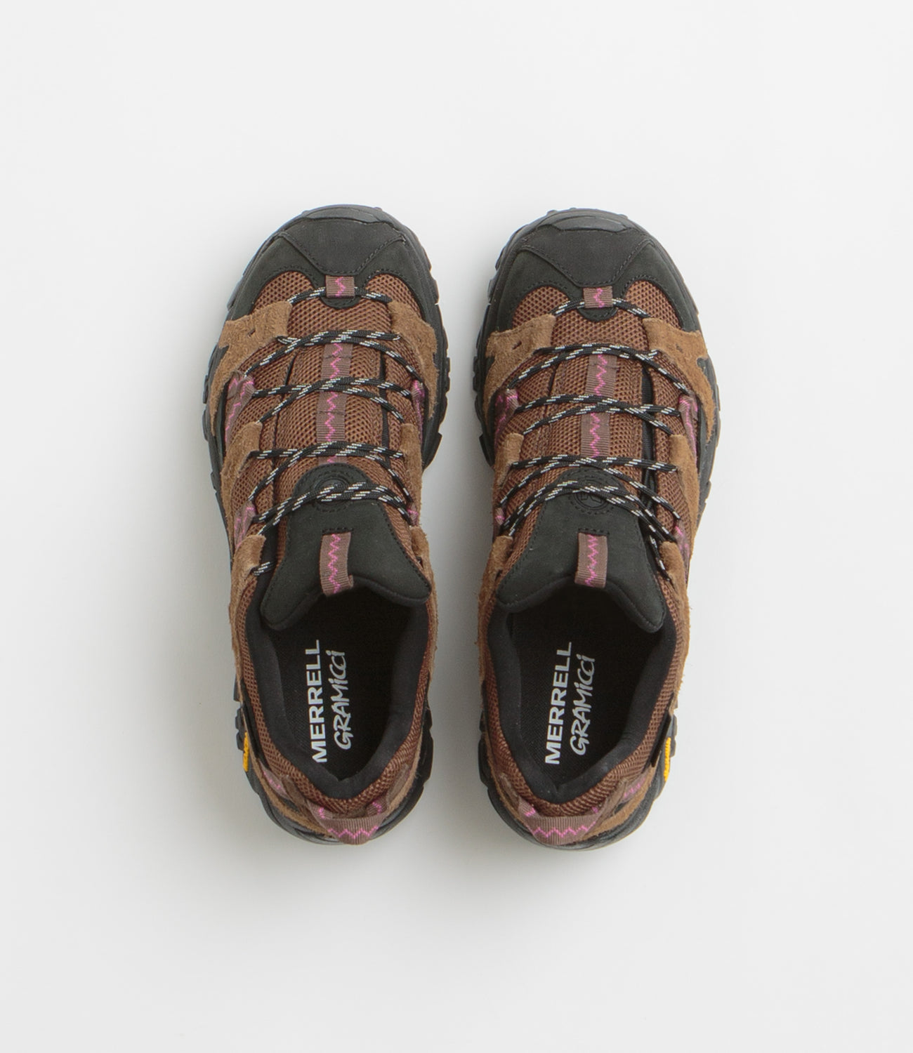 Merrell x Gramicci Moab 2 Siren Shoes in Dark Earth. Designed in collaboration with Gramicci, this Merrell Moab 2 Siren is inspired by the original, nature and a focus on function. Featuring an air mesh upper, suede panels, a scratch rubber toe cap and a spandex lined heel, this dark brown Merrell Moab 2 Siren also features an EVA foam midsole and an air cushioned heel. Finished with custom webbing, a moulded nylon arch shank, Gramicci branding and a rubber Vibram TC5+ outsole.