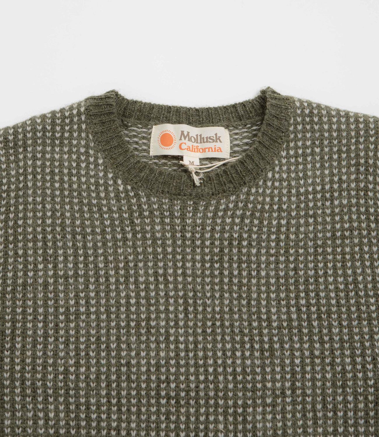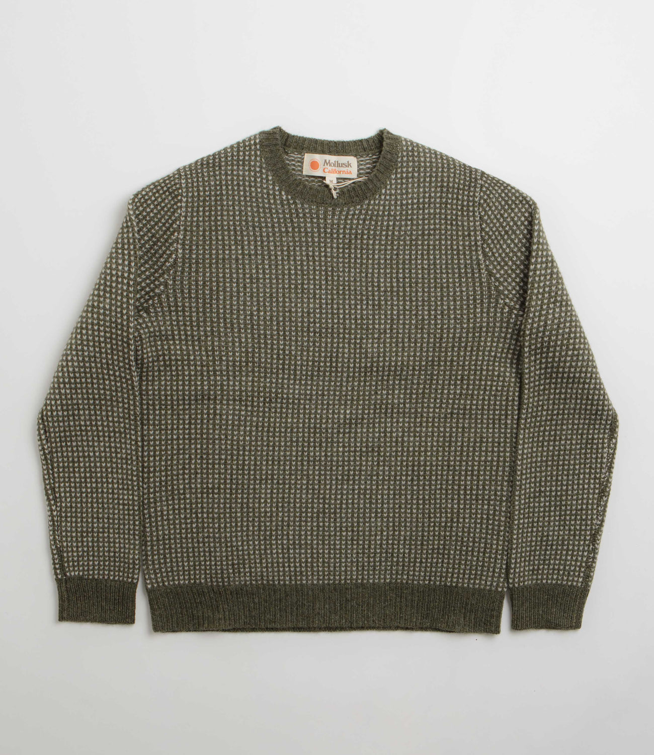 Mollusk Beacon Sweatshirt in Dark Moss. Regular fitting and made from 100% wool, this Mollusk sweatshirt is designed with a rib knit collar and a classic birds-eye knit. Finished in a shade of green with ribbed cuffs and a woven elastic hem.