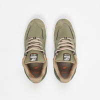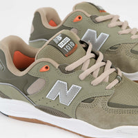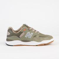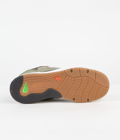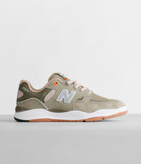 New Balance Numeric 1010 Tiago Lemos Shoes in Olive and White. A khaki coloured signature silhouette from team rider Tiago Lemos, the New Balance Numeric 1010 returns in a new season colourway for SP22. Styled with mixed material suede and breathable mesh underlays, this workwear inspired skate shoe combines utilitarian function with an appreciation for classic courtside culture. A molded Ortholite insole is complemented by a full length dual-density FuelCell midsole and a reinforced FantomFit heel stabiliser, whilst the grippy NDurance rubber outsole delivers a reliable and responsive all-terrain wear. A reinforced toe box is mirrored by a supportive ‘FantomFit’ branded heel brace, whilst the recessed four eyelet lacing system keeps the ‘NB# 1010 Tiago’ embroidered tongue in place across the natural arch of the foot. Metallic silver ‘N’ logo details across each side wall are paired with additional ventilation perforations for heightened comfort in honour of its performance-led technical construction.
