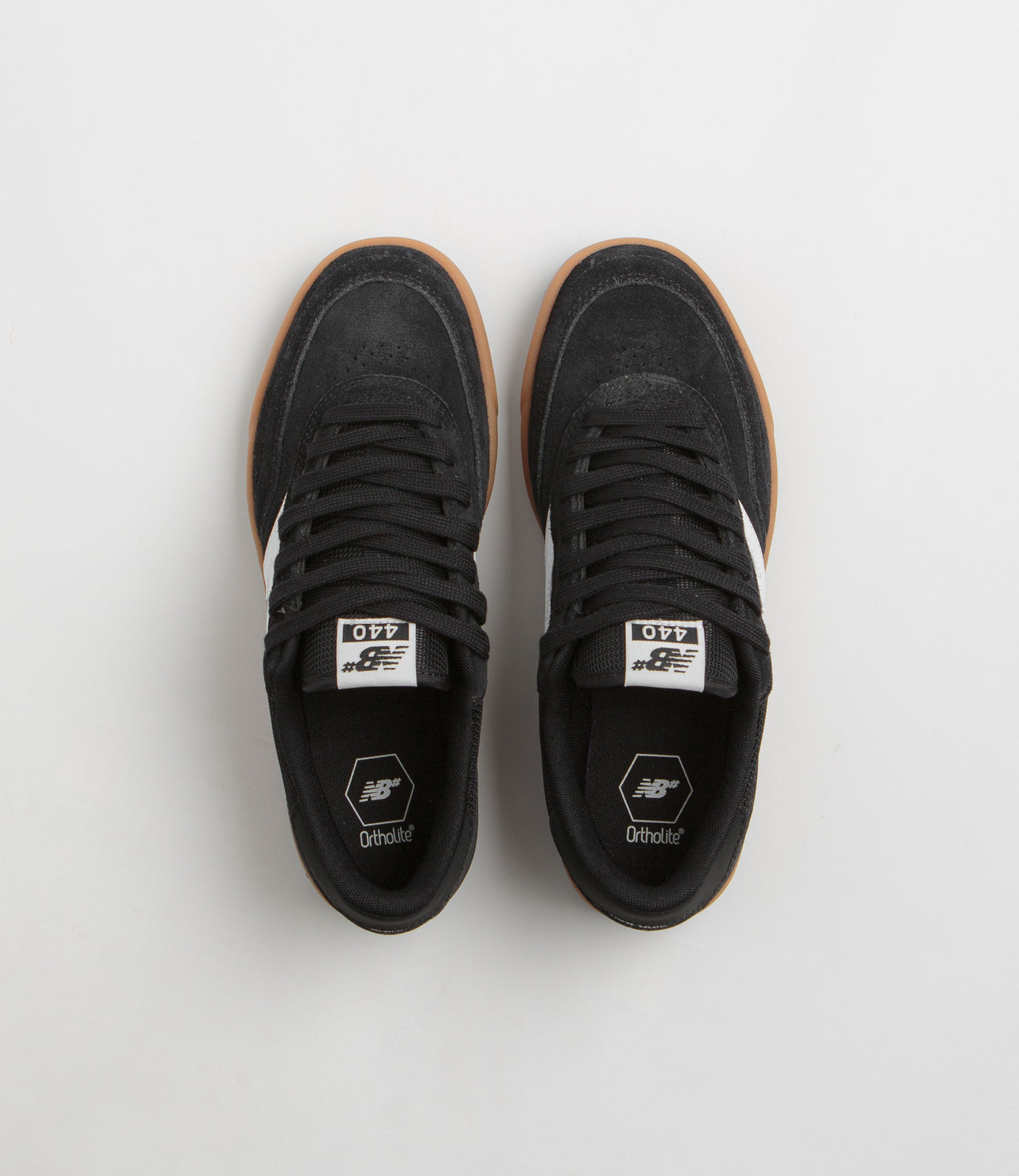 New Balance Numeric 440 Shoes in Black, Gum and White. Inspired by ‘70s runners, this New Balance Numeric 440 is designed with mixed suede, mesh and synthetic uppers. Featuring a low-top profile, a C-CAP internal heel wedge, Ortholite insoles and a gum rubber midsole, this black and white New Balance Numeric 440 also features an NDurance rubber outsole and oversized N logo side walls. Finished with woven NB#440 tongue labels, printed insoles and with reflective heel detailing.