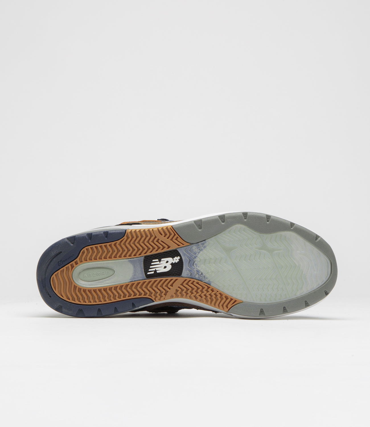 An Andrew Reynolds pro model, the New Balance Numeric 933 blends skate-ready performance with standout detailing. Contrasting suede and mesh panels are paired with leather underlays, leather N side wall logos, and a padded mesh tongue for durability and comfort. Finished in khaki and grey with full-length ABZORB cushioning, 933 lateral quarter branding, a reflective heel, and a rubber Ndurance outsole.