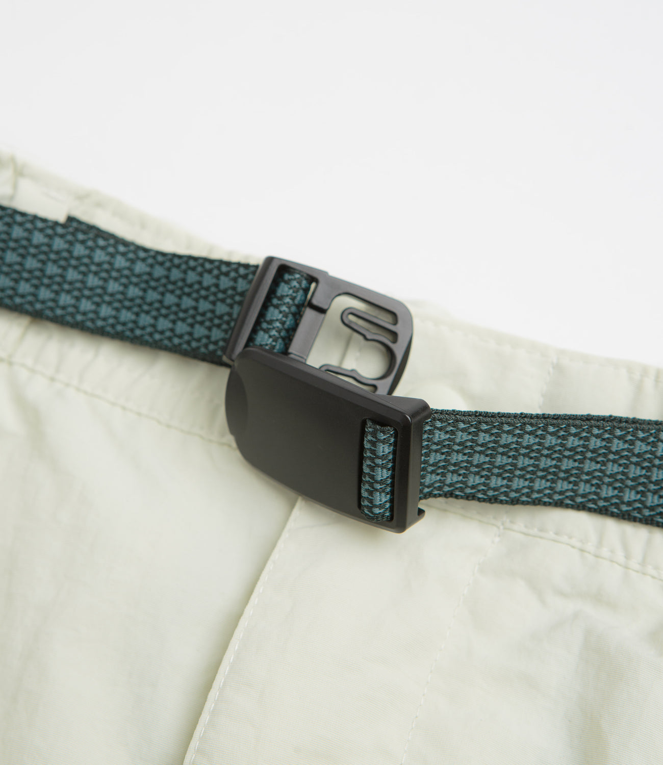 - 100% nylon with elasticated waistband, integrated webbing belt, and zippered fly