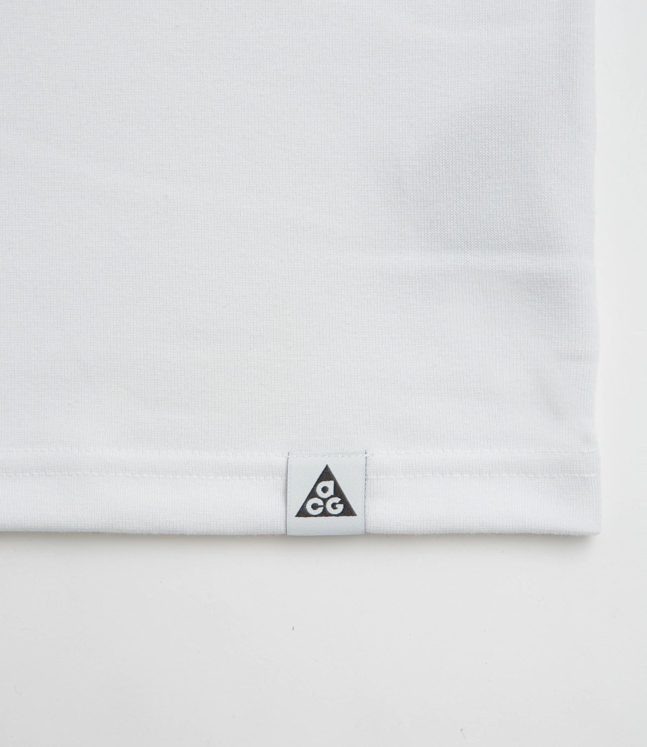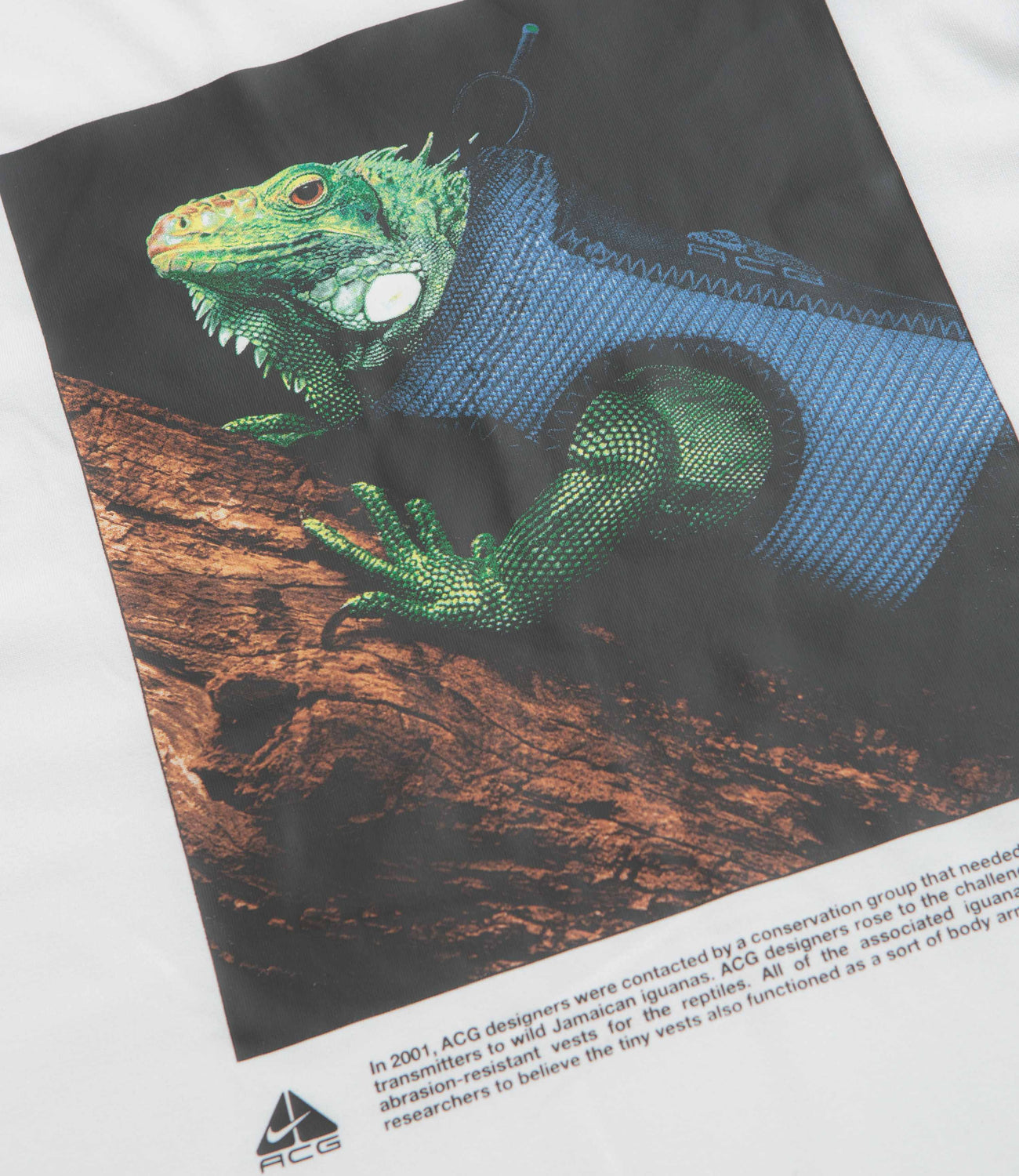 Nike ACG Iguana Vest T-Shirt in Summit White. Loose fitting and made from a polyester-cotton blend, this Nike ACG t-shirt draws inspiration from Jamaica’s iguanas. Featuring a rib knit collar and straight hem, this beige white Nike ACG t-shirt is finished with a printed chest graphic and flag label branding.