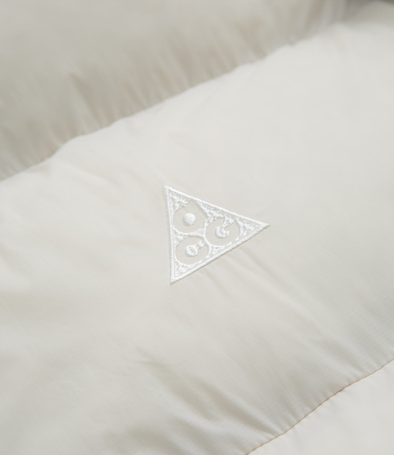Nike ACG Lunar Lake Puffer Jacket in Light Orewood Brown and Summit White. Designed with Therma-FIT ADV technology and recycled PrimaLoft® insulation, this Nike ACG jacket is designed with a nylon shell and a water-repellent exterior. Featuring an ECONYL® lining, elasticated cuffs, a full length zipper fastening and two zippered waist pockets, this beige brown Nike ACG puffer jacket is finished with an ACG carabiner attachment, an embroidered chest logo and with additional inner storage.